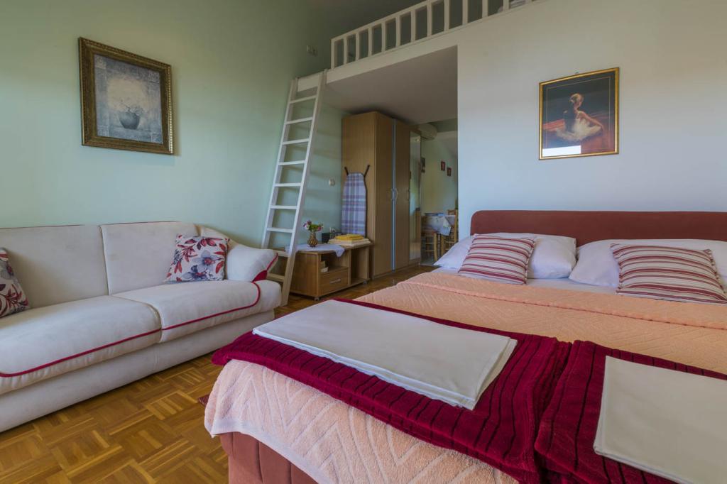 Krásný rodinný dům nacházející se 80 m od první pláže se skládá ze 6 samostatných ubytovacích jednotek rozložených na třech podlažích, každá se samostatným vchodem a výhledem do zahrady a na moře. Mezi ubytovacími jednotkami nabízíme Studio pro dvě osoby, Velké studio pro tří- nebo čtyřčlennou rodinu, kde je dětská postel na galerii (a děti to milují :)), a Velký dvoupokojový apartmán se dvěma ložnicemi a obývacím pokojem s rohovou rozkládací pohovkou. Dvůr je zelený, zdobený olivovníky, fíkovníky a kopřivami a malou sezónní zeleninovou zahradou. Parkoviště, které je nedílnou součástí budovy, je přístupné vjezdem do dvora z hlavní ulice. Hostitelé se nacházejí v přízemí a rádi zodpoví všechny případné dotazy, zajistí další postýlku pro miminko, dětskou židličku, zapůjčí vám něco, pokud v bytě chybí, nebo opraví případné závady.
