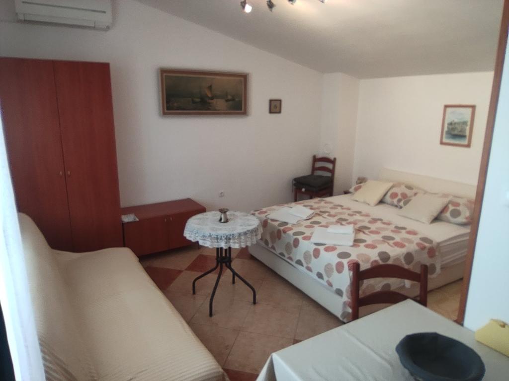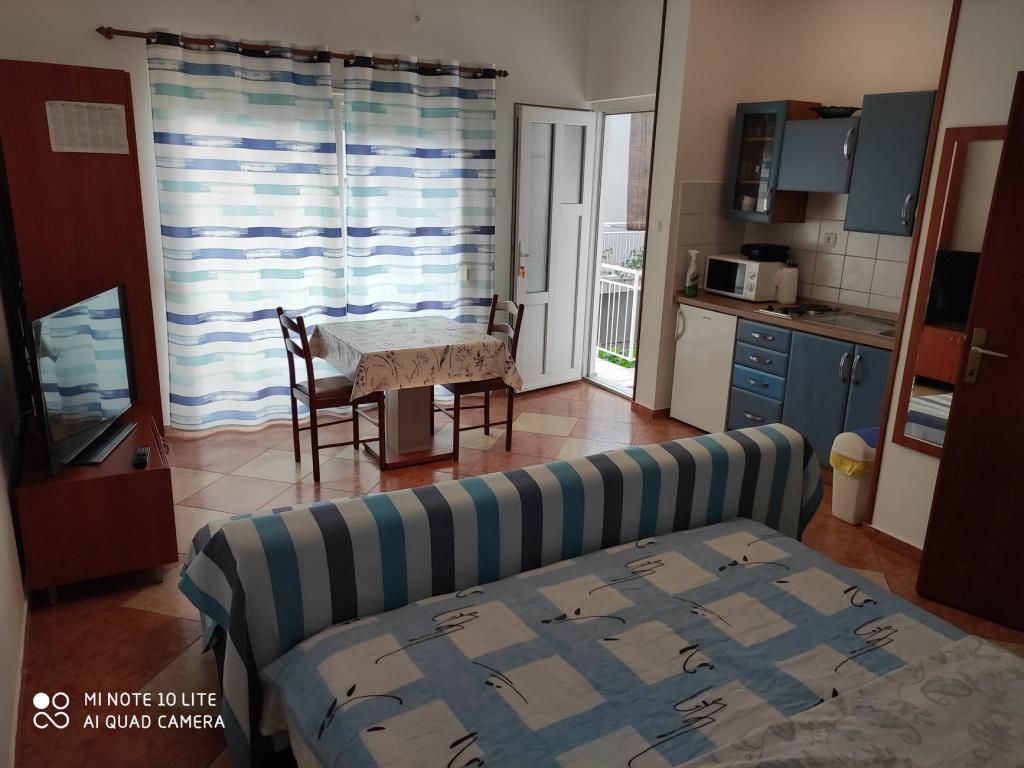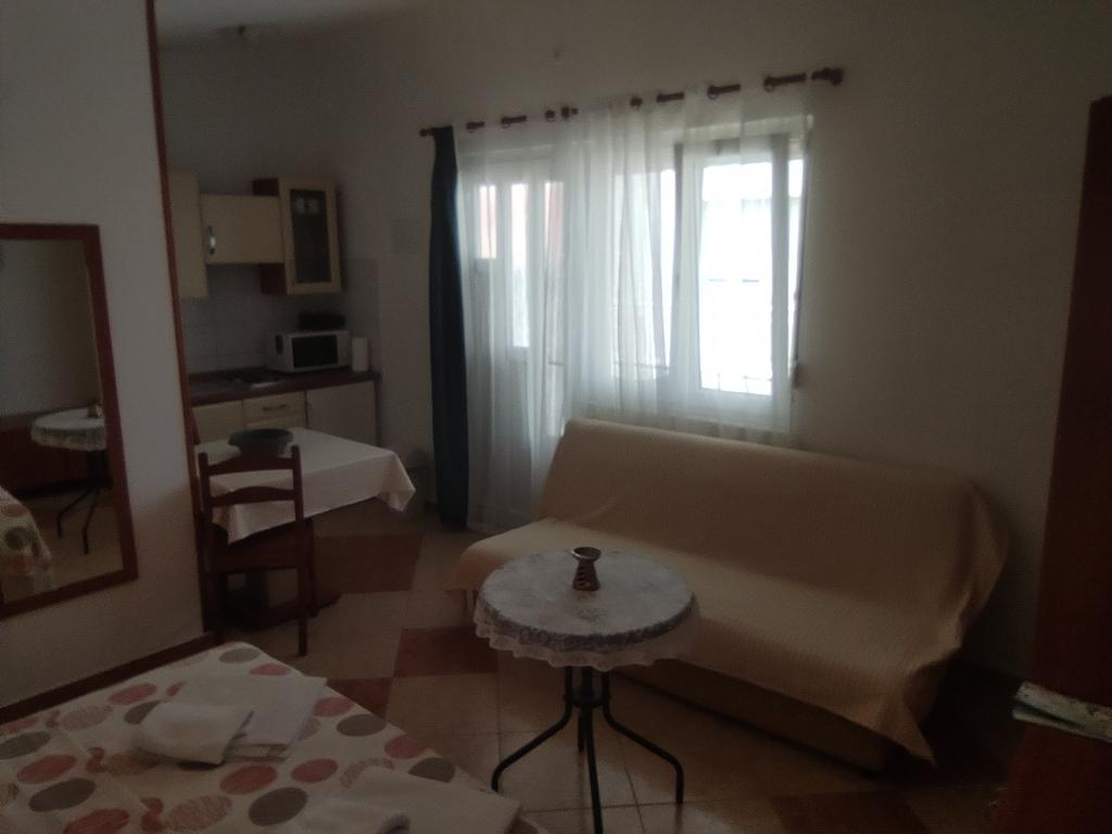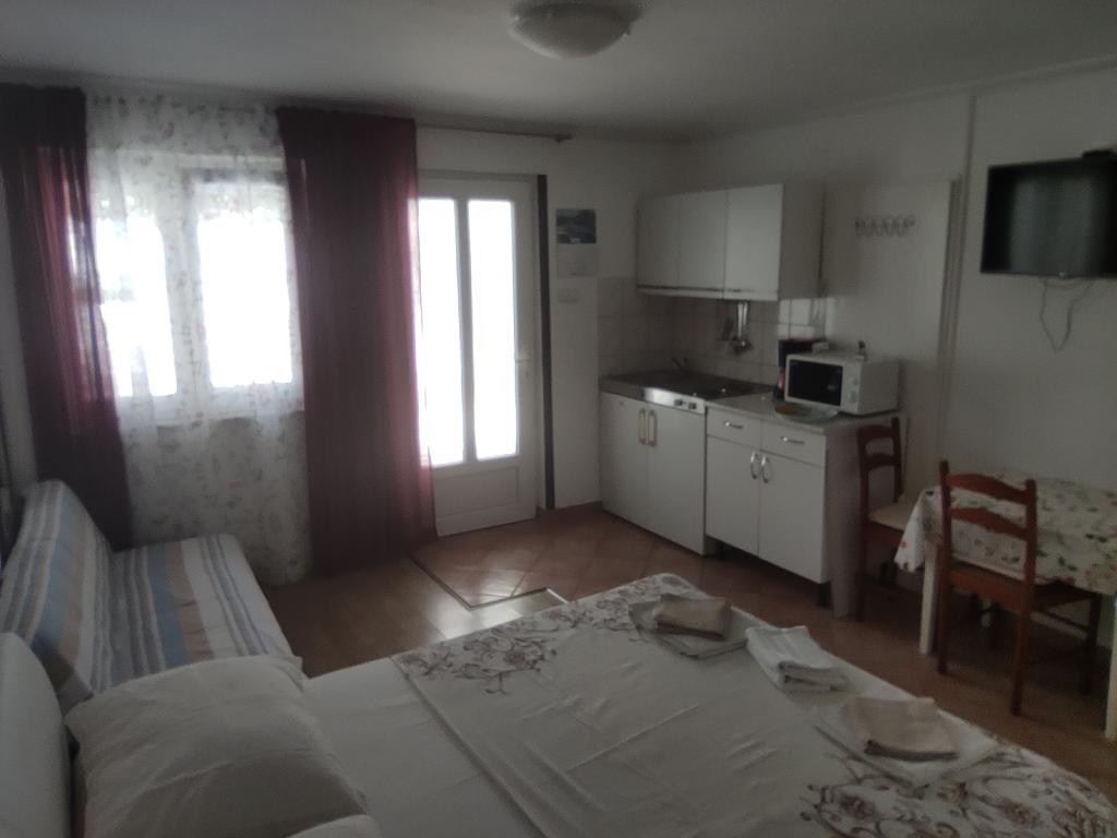 Malé studio, ideální pro dvě osoby. Přistýlka je rozkládací pohovka vhodná pro dospělého, ale pohodlnější pro děti. Byt se nachází ve druhé řadě od moře. Parkování je zajištěno a zahrnuto v ceně. Byt je součástí budovy s dalšími 3 ateliéry. Bytový dům se nachází za domem hostitele. Dvůr je využíván jak hosty, tak hostiteli.