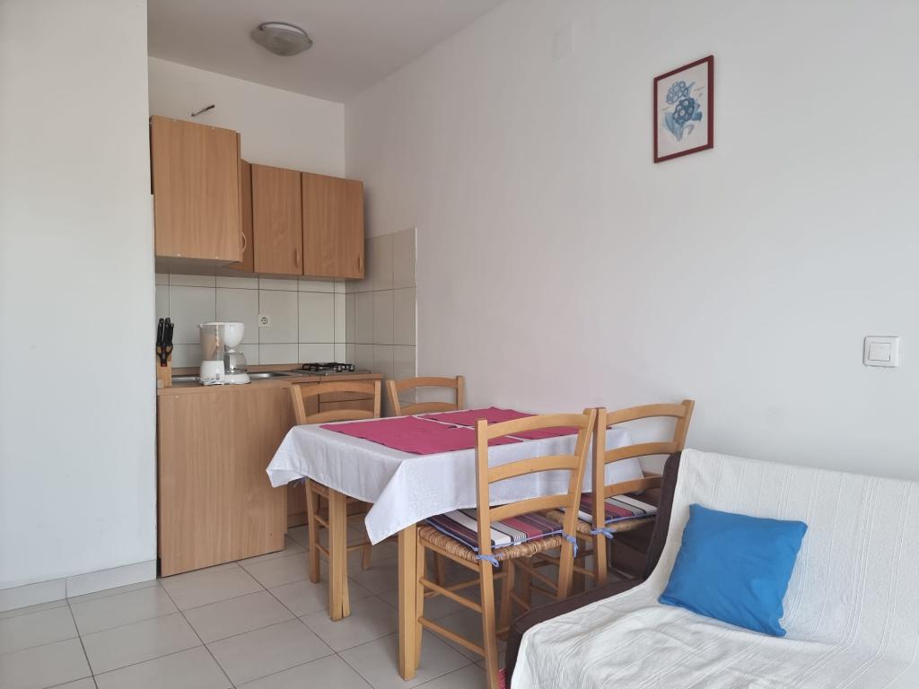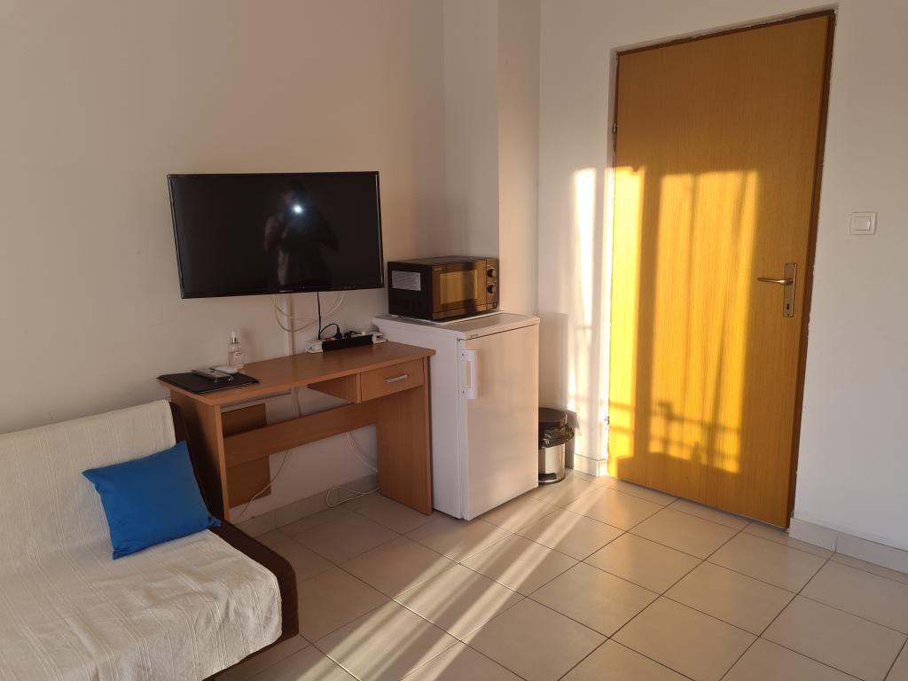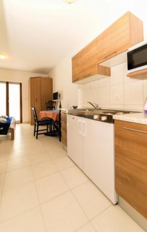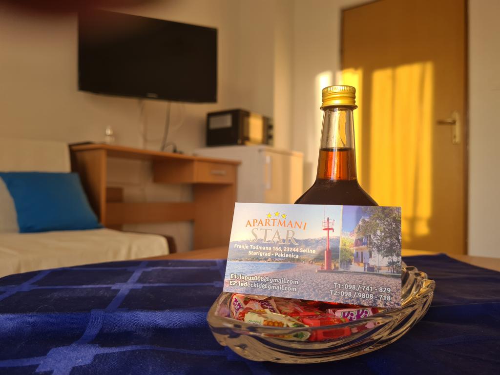 Studio je pro dvě osoby (v případě potřeby mohou být potřeba 4 osoby). Nachází se v klidné části Selinu, v blízkosti Starigrad Paklenica (2km) a Zadaru (30km), 500m od centra a 60m od pláže. Studio je kompletně zařízené (neomezené wifi, TV sat, mikrovlnka, kávovar, rychlovarná konvice), s parkovacím místem a grilem, kapacita pro dvě osoby. Skládá se z ložnice s manželskou postelí a kuchyně s jídelním koutem, koupelny se sprchou a velkého balkonu.
