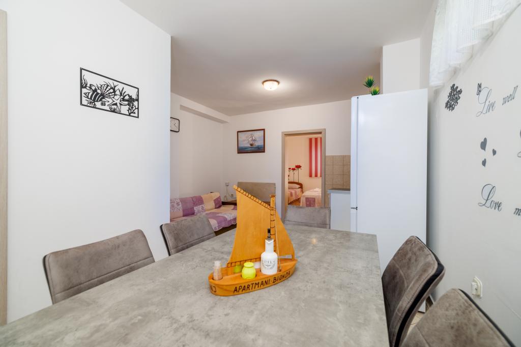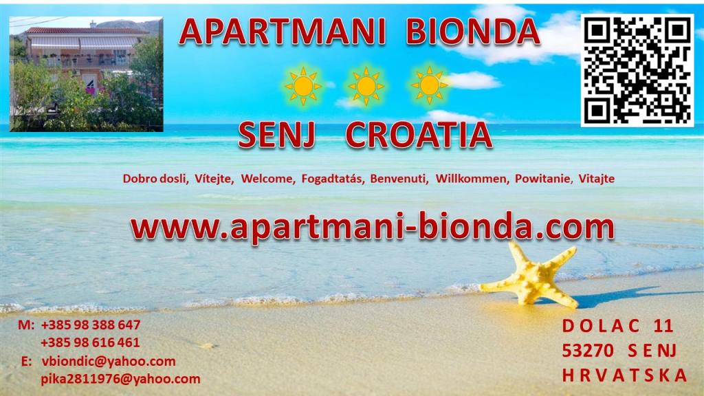 Apartmány BIONDA jsou nově postavené, plně a moderně vybavené v klidné části města Senj. Jsou umístěny v samostatné budově, tedy v rodinném domě. Každý apartmán má samostatný vchod, vlastní balkon nebo terasu, k dispozici stůl a židle na balkon, SAT-TV, bezdrátové připojení k internetu, WI-FI, mini bar, klimatizaci, elektrické topné desky a parkování pro vaše auto. V bezprostřední blízkosti města Senj se nachází Národní park Plitvická jezera, přírodní parky Velebit, Zavratnica, ostrovy Goli, Grgur, Prvić, Krk a Rab. Byty se pronajímají celoročně.