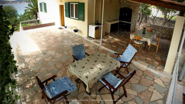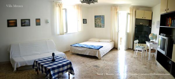 BYT V DOMĚ NA POBŘEŽÍ, S FANTASTICKÝM VÝHLEDEM, DALEKO OD DAVU! Apartmán Merara se nachází přímo na břehu moře, v zátoce Stari Trogir mezi Marina a Rogoznica, Trogir a Primošten. Je to daleko od osady, což zajišťuje klid a zábavu v přírodním prostředí borovic. Přístup je možný autem i lodí. Parkování pro dvě auta a kotviště pro loď jsou k dispozici, stejně jako další kotviště u domu. Ve dvou ložnicích a obývacím pokoji se může ubytovat až 6 hostů. Koupelna s WC, kuchyně s jídelnou, ohniště s grilem na velké terase s výborným výhledem. Zahrada se středomořskými rostlinami je jediná věc, která odděluje dům od moře. Přestože je izolovaný, díky solárnímu systému a elektrocentrále je zde veškerý komfort, na který jste zvyklí: teplá voda, televize / SAT, elektřina, WiFi atd.