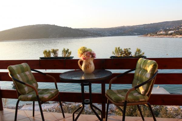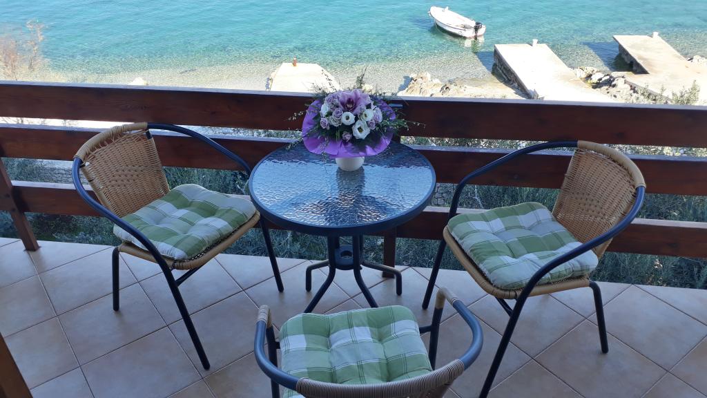 Prostorný dvoupokojový apartmán v prvním patře s velkým obývacím pokojem a balkonem s výhledem na moře (vzdálené 10m) a celý záliv. Nachází se v samém centru města, které je oázou klidu a rodinné relaxace. Restaurace, kavárna a trh jsou vzdáleny 70 m. Oblázková a betonová pláž s křišťálově čistým mořem se nachází před apartmánem.