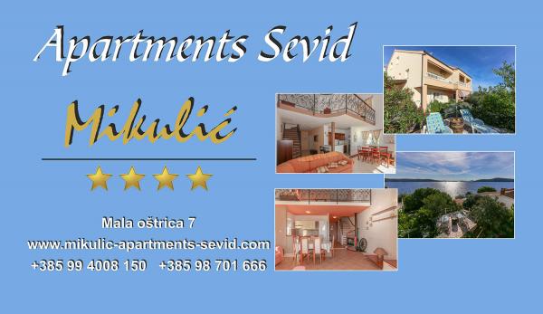Sevid na moru, dost skrytý před městským davem, ale dost blízko, aby viděl všechno. Slunný a skrytý kout nedotčené přírody, ideální pro pravou středomořskou dovolenou. Přestože je Sevid malý, má vše, co potřebujete, obchody, restaurace, kavárny, čisté moře a krásné pláže. Ideální pro rodiny s dětmi v horkých letních dnech i v zimě. Apartmány Mikulić se nacházejí na východní straně poloostrova Sevid, 20 metrů od moře, s krásným výhledem na moře, okolní ostrůvky a zahradou plnou zeleně. Apartmány mají 4 hvězdičky a lze je nazvat skutečnou luxusní prázdninovou vilou. Hostům je k dispozici zahrada s grilem, středomořská zahrada, parkoviště, pláž s přístavištěm lodí. Písečná pláž je velmi blízko domu. nabízíme možnost pronájmu člunu s apartmánem (rychlý člun nebo malý člun). dále nabízíme půjčovnu šlapadel, vodních skútrů, sup boardů, kol. Vítejte!!!