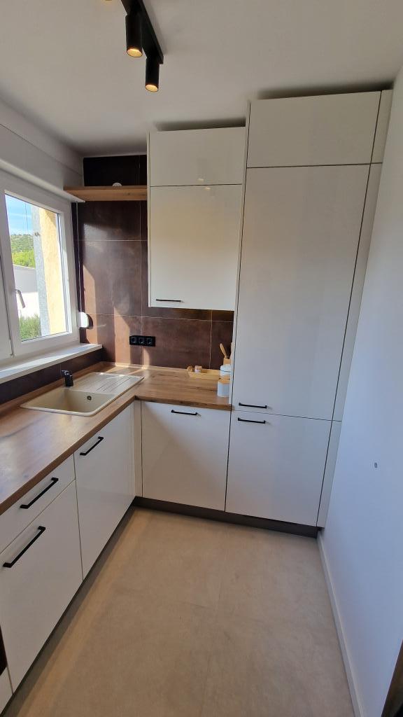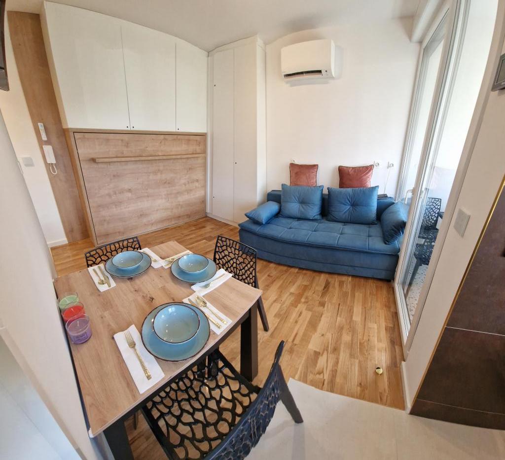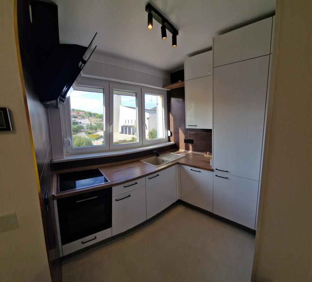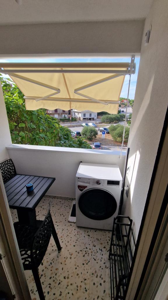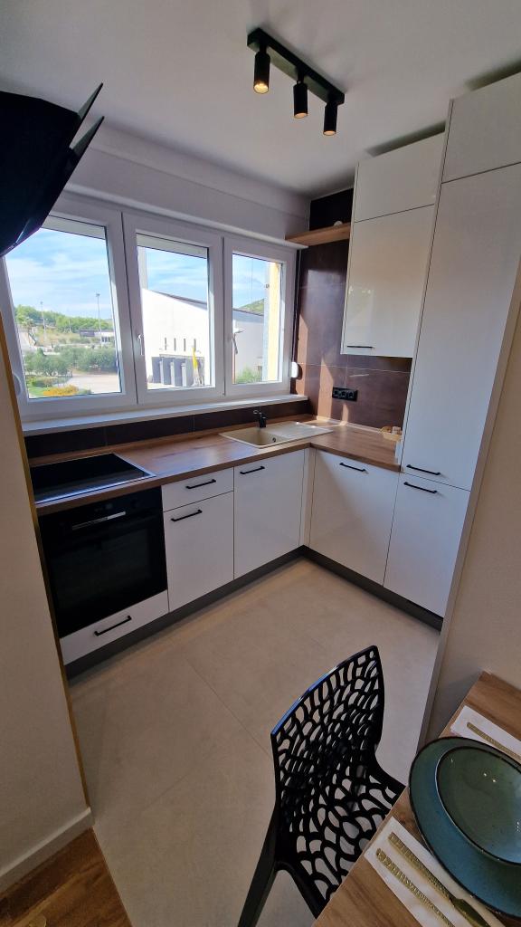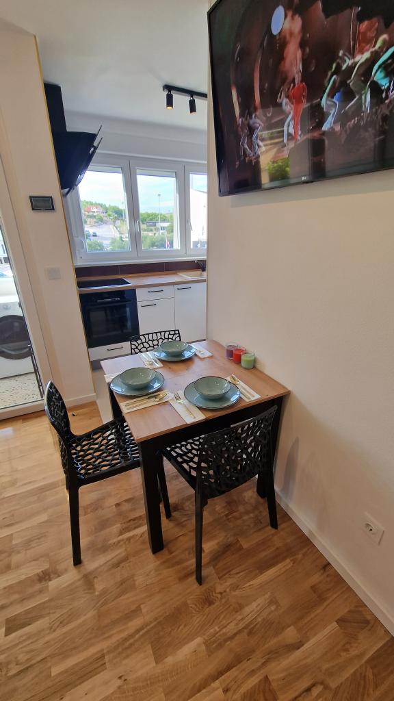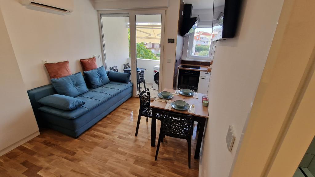 Obývací pokoj je vybaven postelí 140 x 200, kterou lze vytáhnout ze skříně. Ve stejné části obývacího pokoje je další pohovka, kterou lze rozložit na postel o rozměrech 160 x 200. V ceně je 139 cm TV s Netflix a HBO Max. Rychlost plochého internetu 150 Mbit/s. Studio má krytý balkon se slunečníkem a výhledem do okolí. Je nainstalována klimatizace s funkcí Wi-Fi. Letiště Split je vzdálené 55 km a letiště Zadar 75 km. V případě potřeby je možné zapůjčit vozidlo pro organizovanou dopravu z letiště nebo zpět. Byt se nachází v klidné a bezpečné lokalitě Meterize. Jsou zde převážně rodinné domy a obytné domy, stejně jako všechny obchody nezbytné pro každodenní život. Do centra města se také dostanete pěšky, asi 25 minut chůze. Do centra města jezdí také přímá autobusová linka.