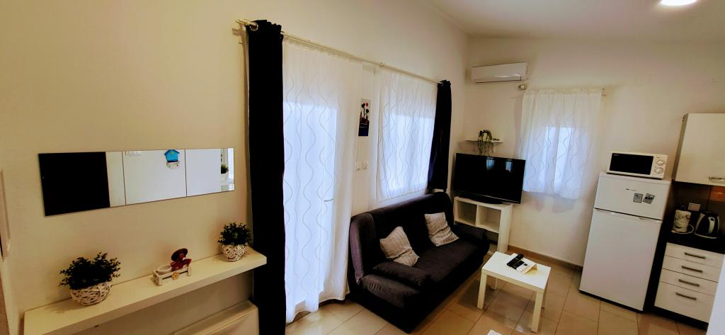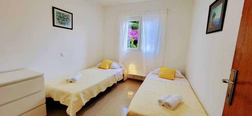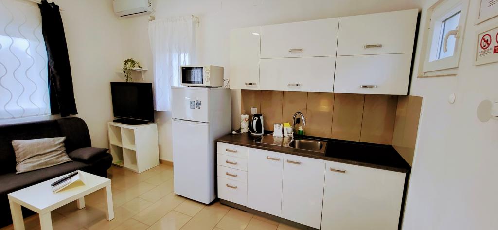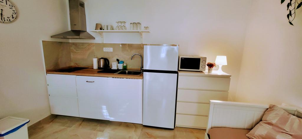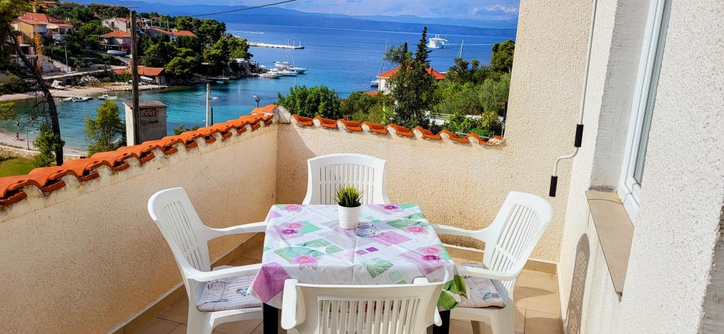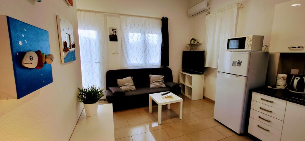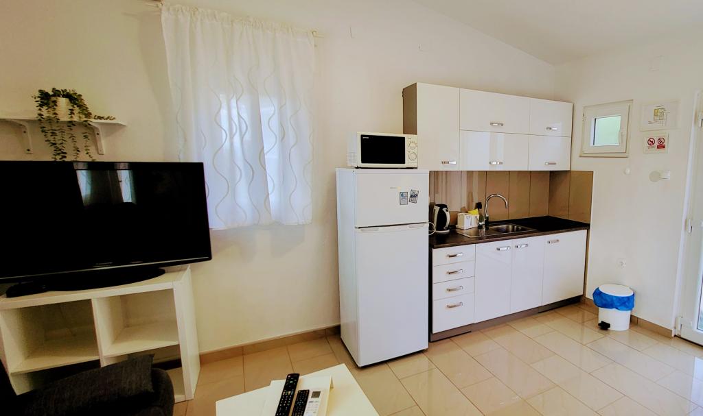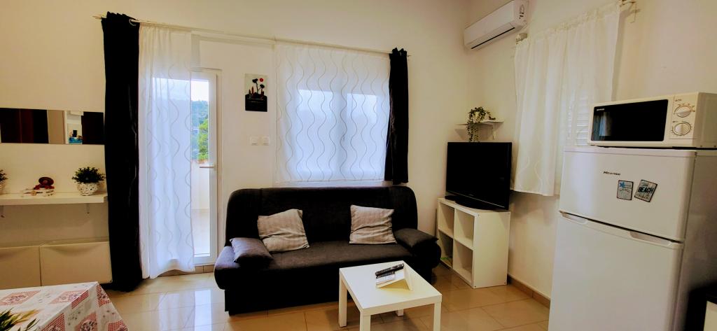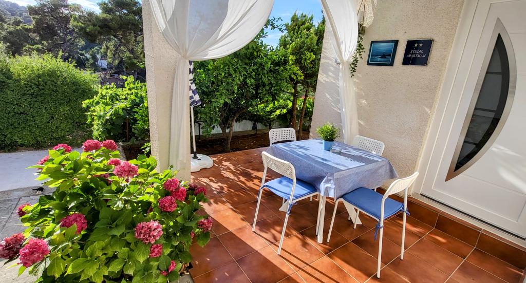 Moderně vybavený studiový apartmán. Nachází se v klidné zátoce, pouhých 80 m od oblázkové pláže. Skládá se z ložnice s manželskou postelí (160x200 cm), koupelny se sprchovým koutem, kuchyně a obývacího pokoje s jídelním koutem. V obývacím pokoji je rozkládací postel (160x200 cm). Apartmán má klimatizaci, smart TV, bezplatné Wi-Fi, parkování a vlastní terasu. Gril a venkovní sprcha na místě.
