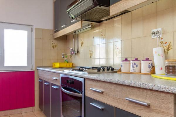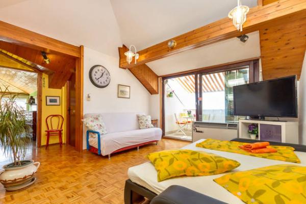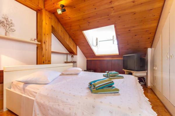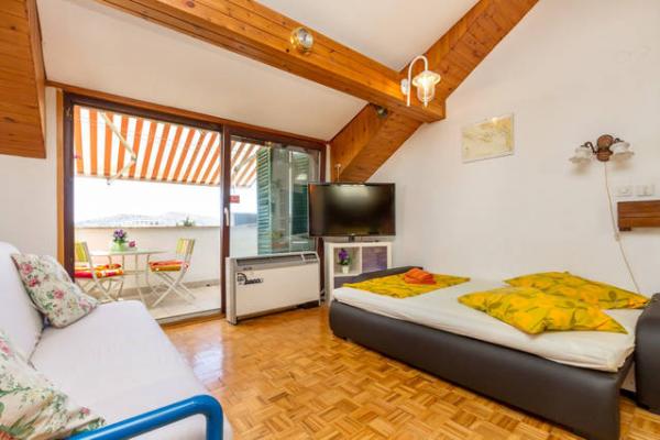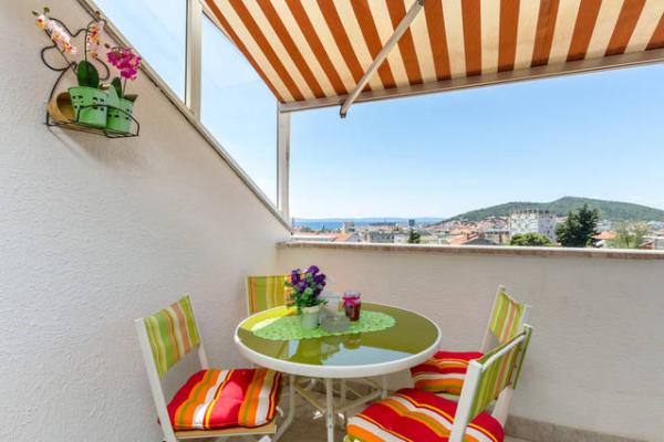 Byt se nachází v soukromém domě, který je 70 let byla vila Leontić, v centru města, 800 metrů od paláce, v klidné lokalitě, dům je obklopen zelení a palmami, hosté mají své vlastní soukromé parkoviště a centrum je jen málo minut chůze. Byt se nachází v klidné ulici, s výhledem na moře, pohodlné, příjemné a velké 80 m2, má dvě ložnice, jedna a druhá má manželskou postel pro dvě osoby, velký obývací pokoj 35 m2 a přistýlkou pro dvě osoby. Byt je vhodný pro šest osob. Obývací pokoj má terasu s výhledem na moře a zelenou plochu kolem domu. V obývacím pokoji se nachází velké LCD TV s více než 40 kanálů. Je k dispozici 24/7.