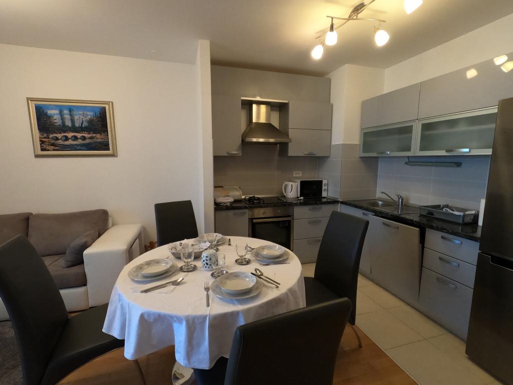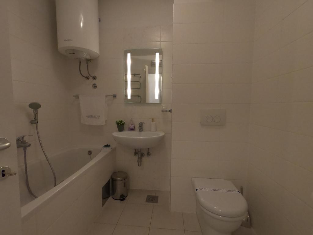 V kuchyni je lednice, trouba, indukční varná deska, mikrovlnná trouba, rychlovarná konvice a toustovač. K bytu náleží vlastní parkovací stání v garáži, kam se dostanete výtahem. Na místě je McDonalds a supermarket otevřený až do půlnoci.