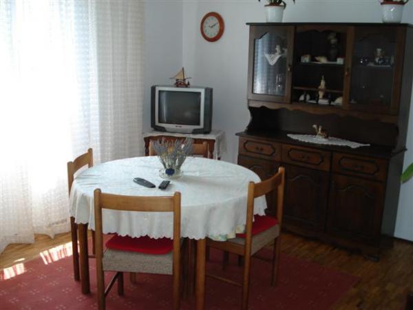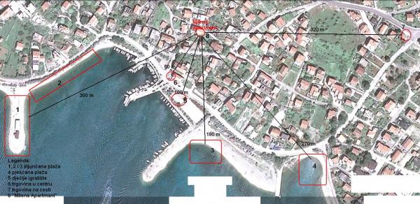 V rodinném domě v prvním patře jsou dva byty k pronájmu. Každý apartmán má samostatný vchod a vlastní terasu. Dům se nachází v samém centru města Srima, 60 m od obchodů a 80 m od moře. Pláž oceněná modrou vlajkou je vzdálená 150 m. Restaurace je vzdálena 250 m. Byt 1, 2+2. Skládá se z: ložnice, obývacího pokoje s rozkládací pohovkou, koupelny s vanou a pračkou, kuchyně s myčkou, terasy. Má klimatizaci. Byt 2, 2+1. Skládá se z: prostorné ložnice, kuchyně - obývací pokoj v jedné místnosti, toalety se sprchovým koutem a velké terasy. Možnost dvou přistýlek, první lůžko je gauč v obývacím pokoji a druhou přistýlku lze umístit do ložnice. Má klimatizaci.