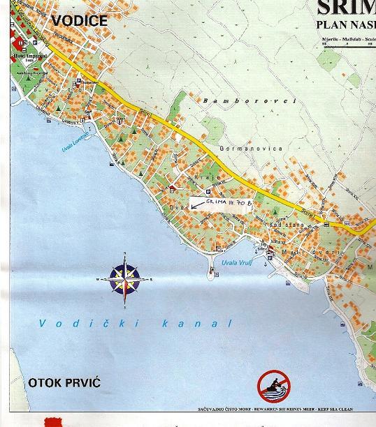 Nachází se na centrálním Jadranu, nedaleko města Vodice, na klidném místě Srima, u pláže. Zařízení je elegantní a má plně vybavené apartmány, vhodné zejména pro rodiny s dětmi nebo páry, ale také pro všechny ostatní rekreanty. Dům se nachází ve druhé řadě k moři, v rušné ulici s přímým přístupem na pláž, což zaručuje klidnou dovolenou a příjemný prázdninový zážitek. Apartmány mají velké terasy s výhledem na moře. Pláž je upravená, oblázková, vhodná pro děti, pláž má přírodní stín. Moře před domem je extrémně čisté. Pět minut chůze od bytu je nově zrekonstruované dětské hřiště. Možnosti výletů na ostrov Prvić. Každý apartmán má klimatizaci a TV. Parkování je zajištěno ve dvoře. Ve dvoře je také venkovní sprcha a gril.