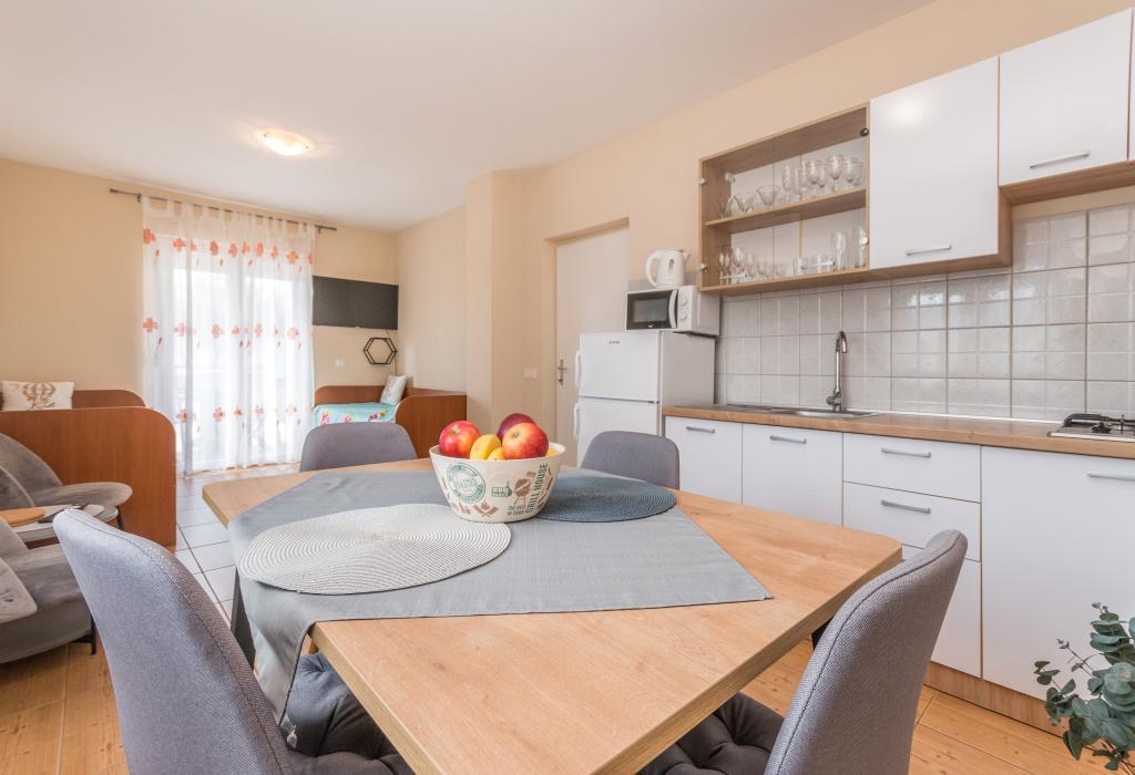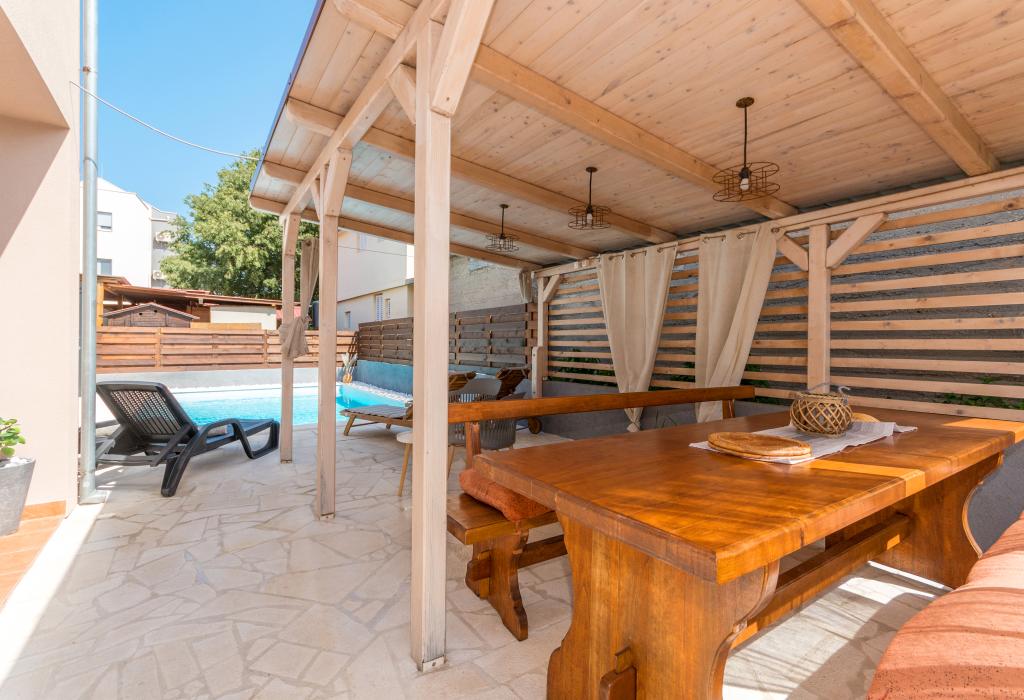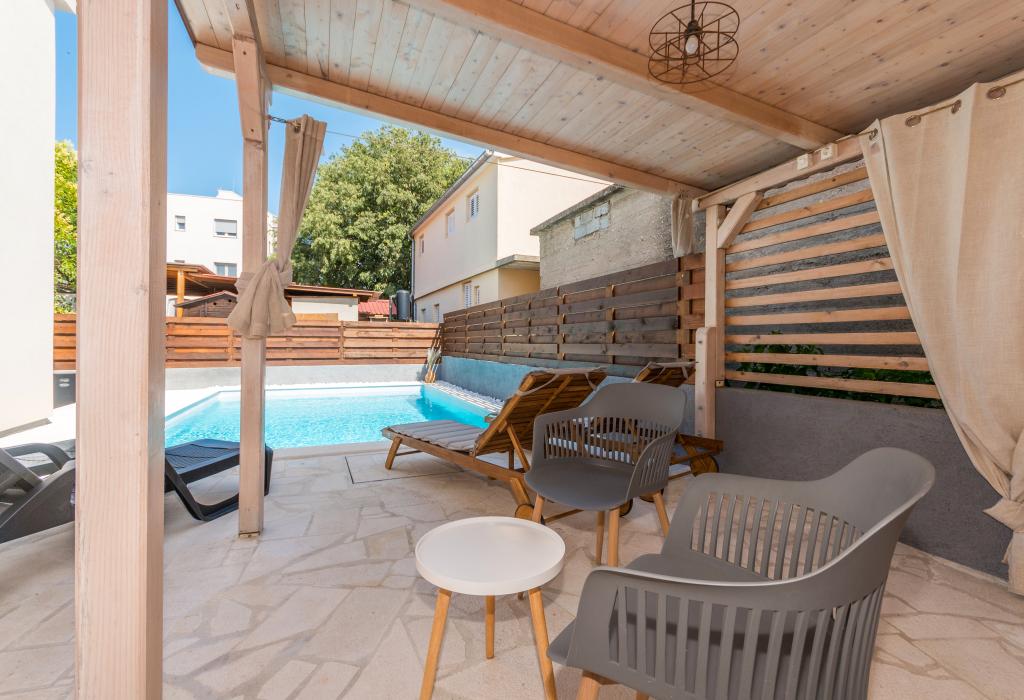 Rekreační dům pro 10 osob, dům s bazénem, klidná lokalita blízko centra, 5 minut chůze od centra, obchodů, restaurací a moře. Dům se skládá ze 3 samostatných apartmánů, každý apartmán má samostatnou terasu, obývací pokoj, WC a ložnici. Na dvoře je velká terasa, stůl, lehátka pro všechny hosty.