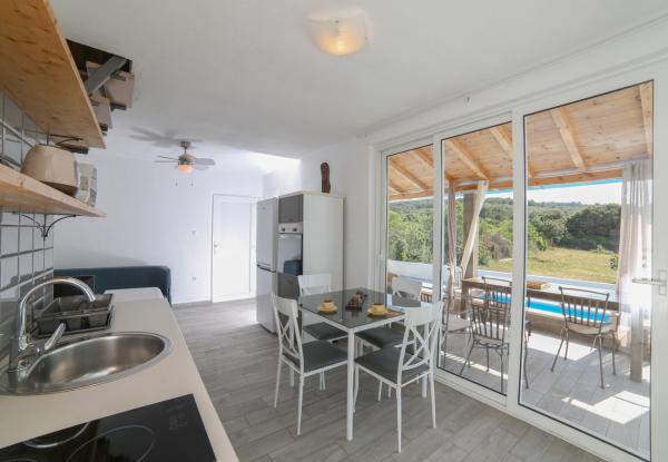 Pronájem domu s velkým bazénem (8 x 4, 20 metrů), ve městě Mirca, jen 3 km od turistického centra - města Supetar. Dům je v dokonalé lokalitě a je skrytý z pohledu. Nachází se na pozemku o rozloze 4000 m2, obklopen trávníkem, sadem a vinicemi. Dům je na dvou podlažích. V přízemí (24 m2) se nachází obývací pokoj, kuchyň a koupelna se sprchovým koutem. Vnitřní schody vedou do podkroví, kde jsou dvě ložnice, jedna s manželskou postelí a druhá s oddělenými postelemi. Terasa je krytá a bazén je ideální pro opalování. Celý tenhle prostor máte pro sebe. Ideální pro děti v domácích zvířatech. Bol a slavná pláž Zlatni rat jsou vzdáleny 40 minut jízdy autem.
