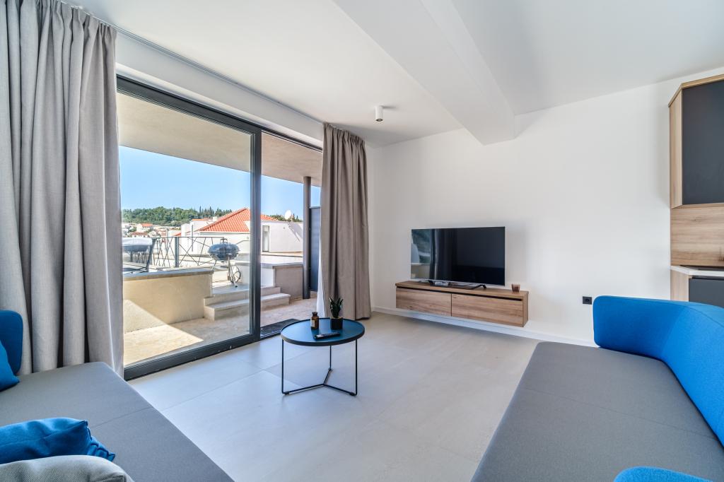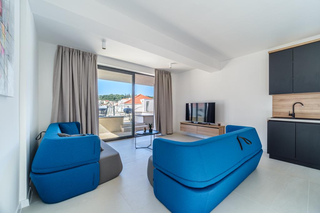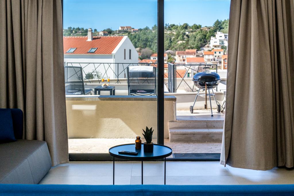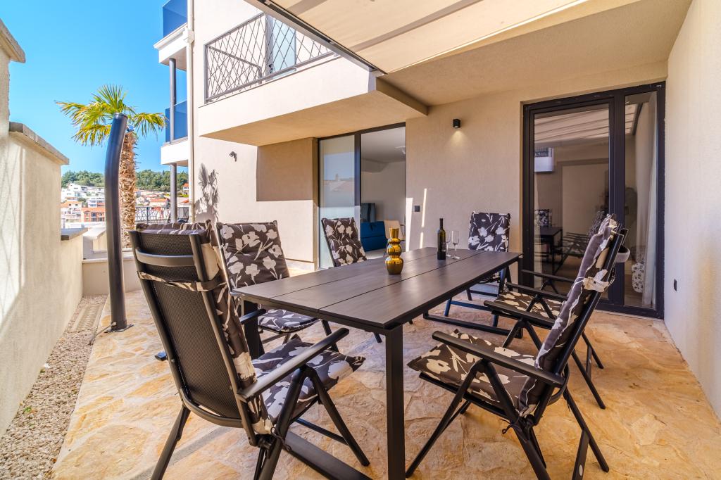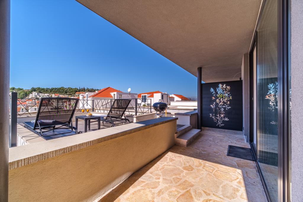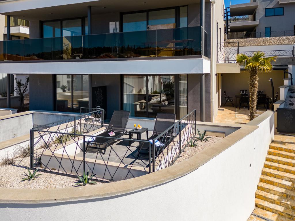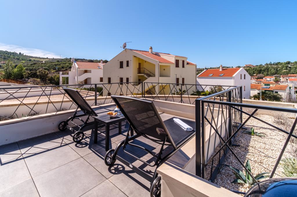 Nový a moderně vybavený apartmán se nachází v Sutivan, malém městě na Brači, o rozloze 67 m2. Je 7 minut chůze od pláže a centra města. Tento apartmán má 1 ložnici s manželskou postelí , velký obývací pokoj se 2 rozkládacími lůžky (u prostoria). pro 4 osoby, moderní kuchyň s jídelním koutem a koupelnou. Apartmán má 2 klimatizace, Wi-Fi, TV a satelitní anténu se 116 programy Byt má 2 terasy, přední terasa je vybavena lehátky na opalování, zatímco hlavní terasa je vybavena venkovní sprchou, grilem a zahradním nábytkem pro 6 osob a krytou terasou o celkové ploše 65 m2.