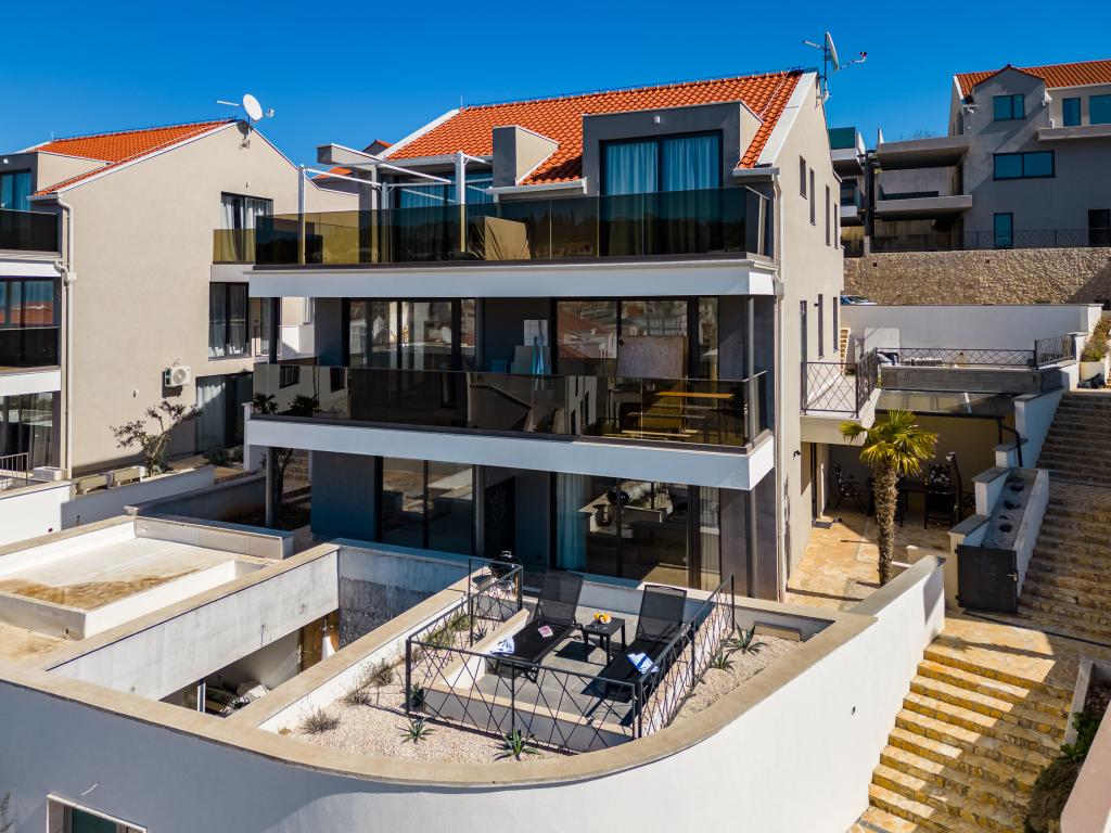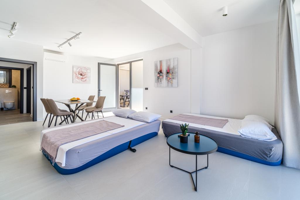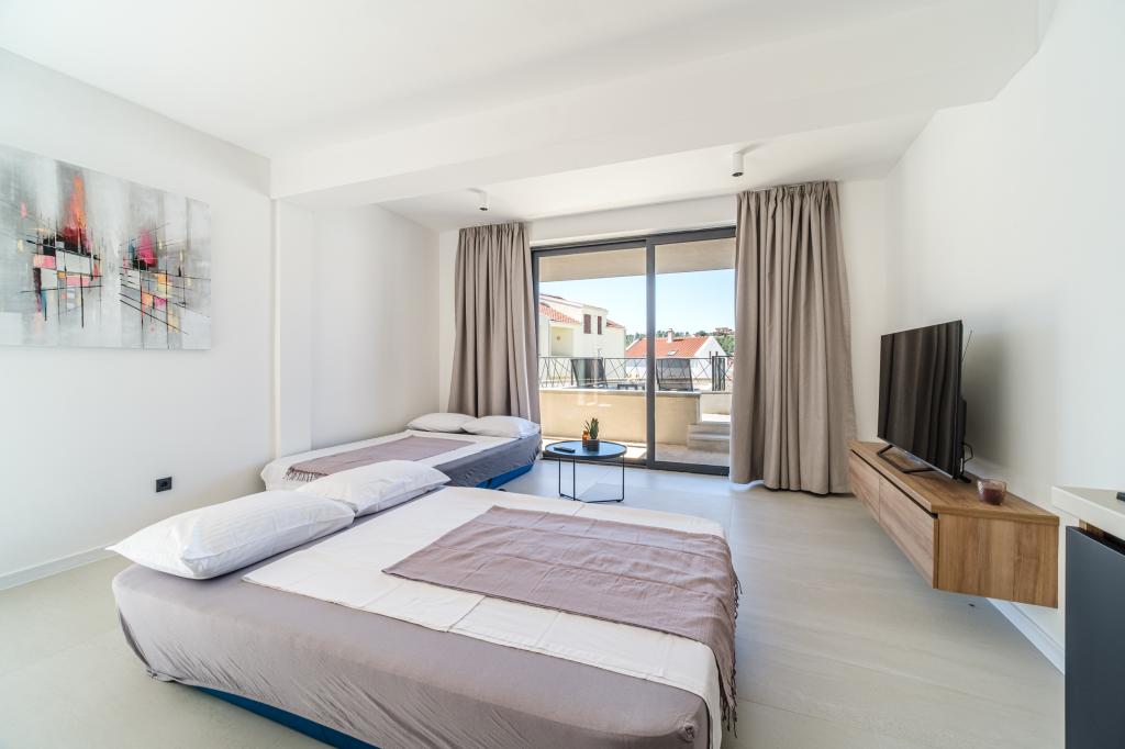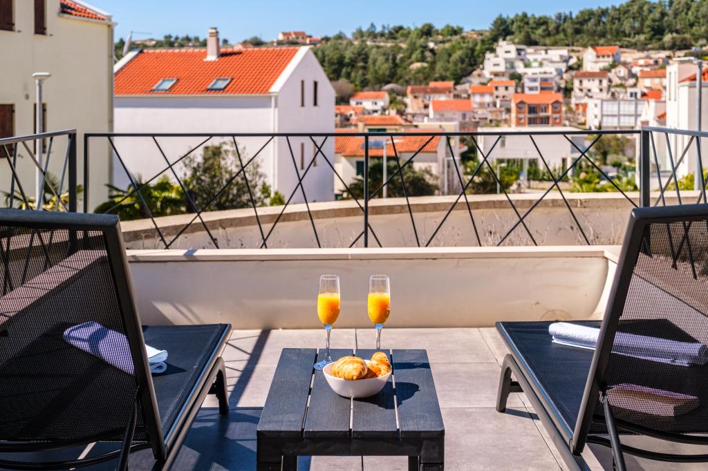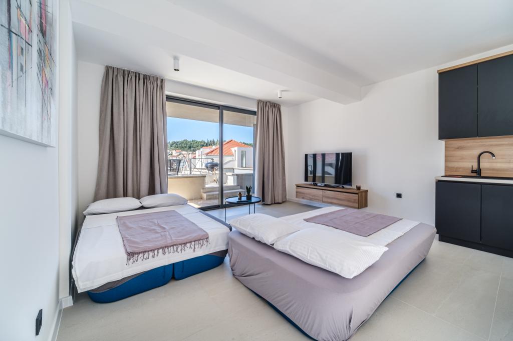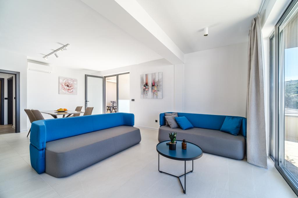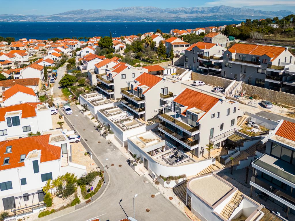 Nový a moderně vybavený apartmán se nachází v Sutivan, malém městě na Brači, o rozloze 67 m2. Je 7 minut chůze od pláže a centra města. Tento apartmán má 1 ložnici s manželskou postelí , velký obývací pokoj se 2 rozkládacími lůžky (u prostoria). pro 4 osoby, moderní kuchyň s jídelním koutem a koupelnou. Apartmán má 2 klimatizace, Wi-Fi, TV a satelitní anténu se 116 programy Byt má 2 terasy, přední terasa je vybavena lehátky na opalování, zatímco hlavní terasa je vybavena venkovní sprchou, grilem a zahradním nábytkem pro 6 osob a krytou terasou o celkové ploše 65 m2.
