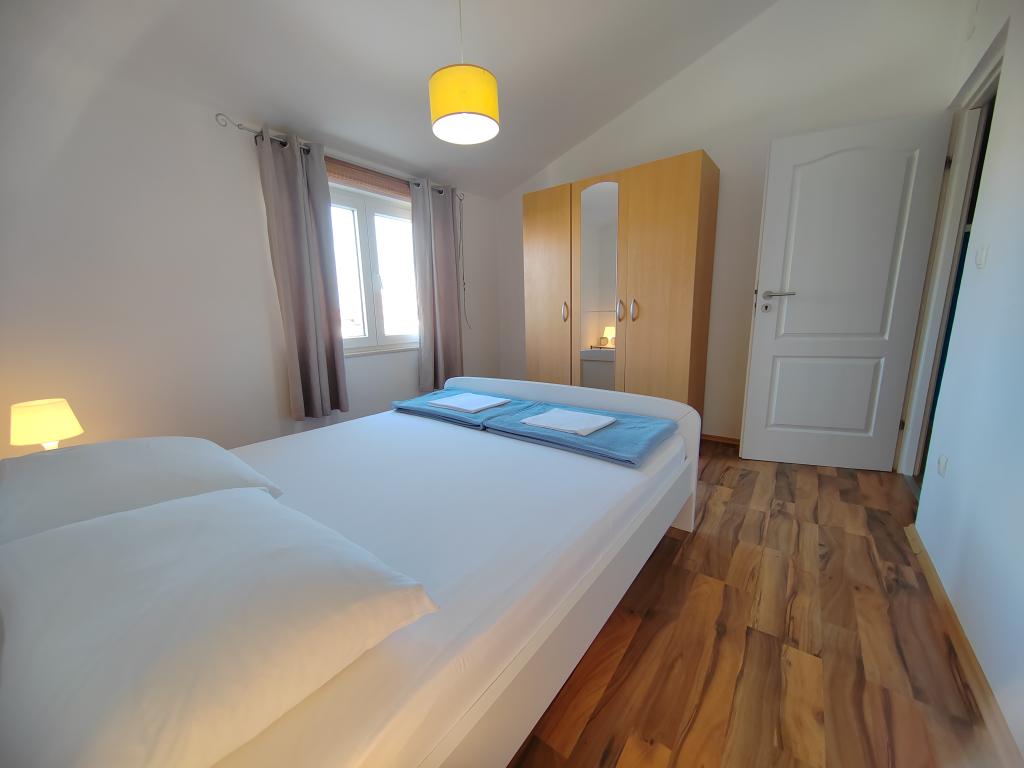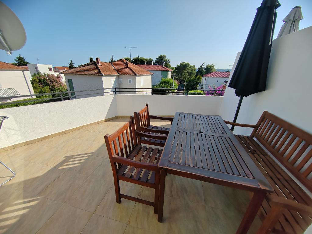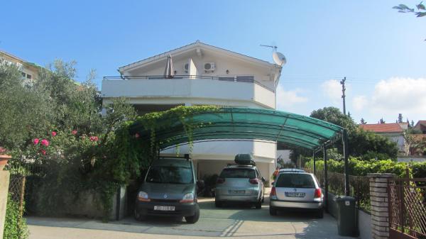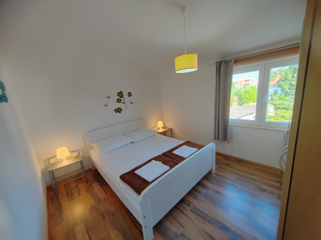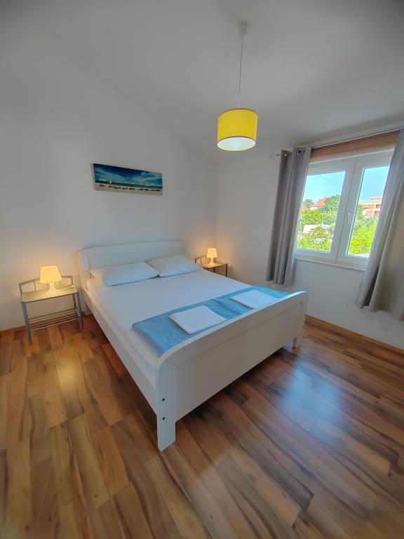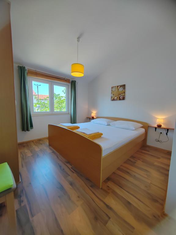 Blízko centra a pláže (150 m). Dva apartmány se nacházejí v rodinném domě (v prvním patře), který je 150 m od pláže a centra města. Každý apartmán má dvě ložnice, koupelnu, pračku, klimatizaci, kuchyň s jídelním koutem a pohovkou, která slouží jako přistýlka, velkou terasu (20 m2). Vše je zahrnuto v ceně. V zahradě je gril. Parkování se nachází před domem ve stínu. Velikost apartmánu je 70 m2.