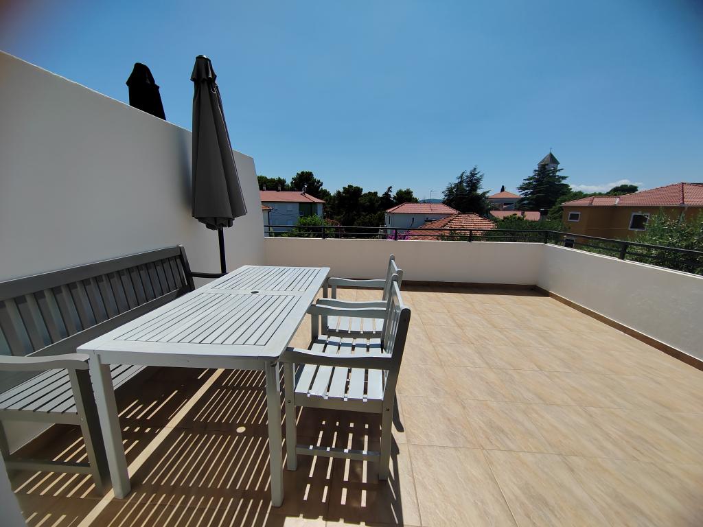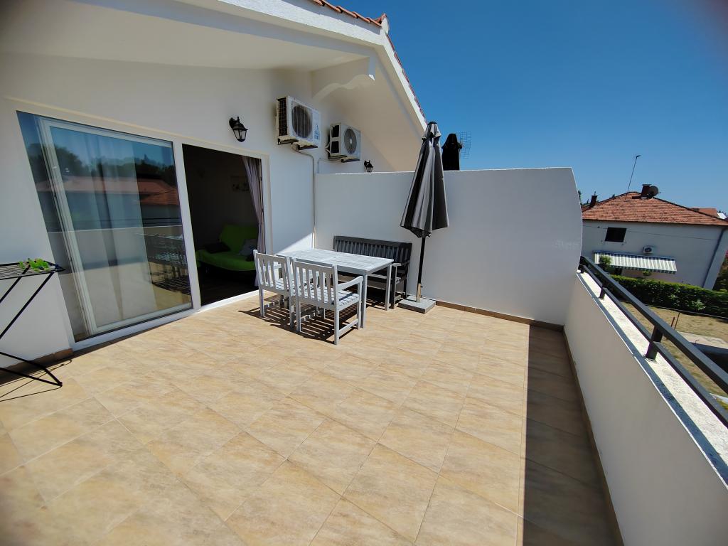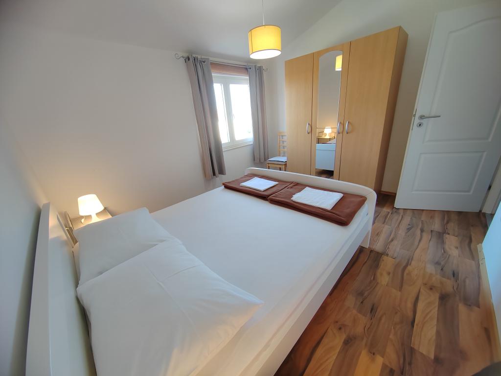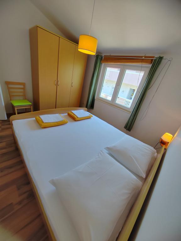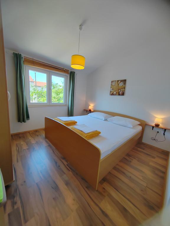Blízko centra a pláže (150 m). Dva apartmány se nacházejí v rodinném domě (v prvním patře), který je 150 m od pláže a centra města. Každý apartmán má dvě ložnice, koupelnu, pračku, klimatizaci, kuchyň s jídelním koutem a pohovkou, která slouží jako přistýlka, velkou terasu (20 m2). Vše je zahrnuto v ceně. V zahradě je gril. Parkování se nachází před domem ve stínu. Velikost apartmánu je 70 m2.