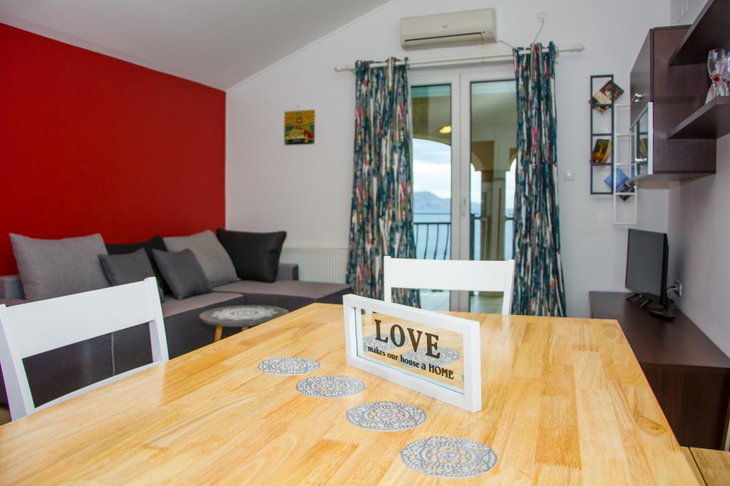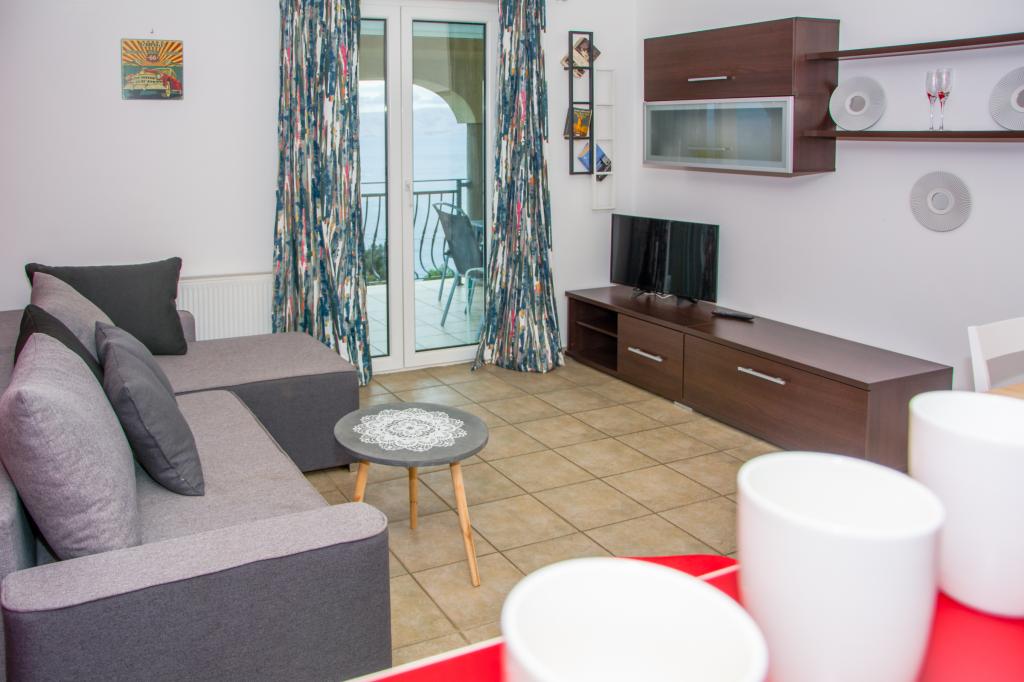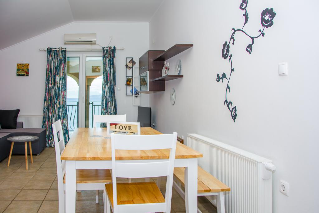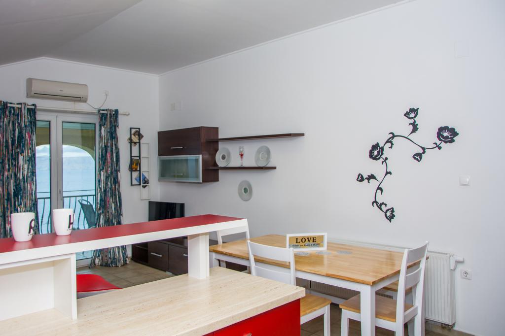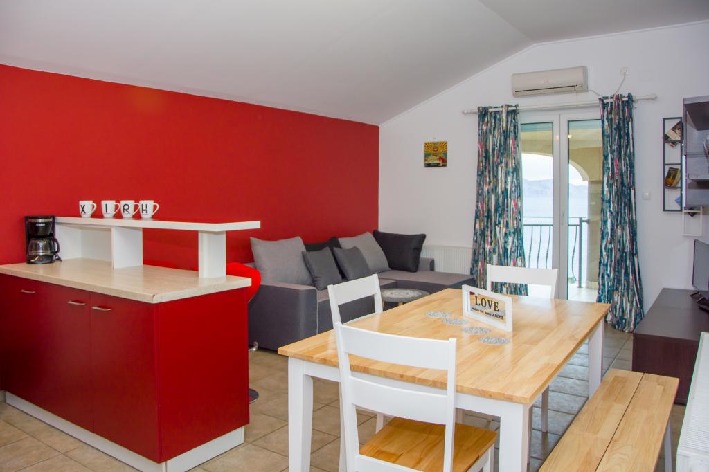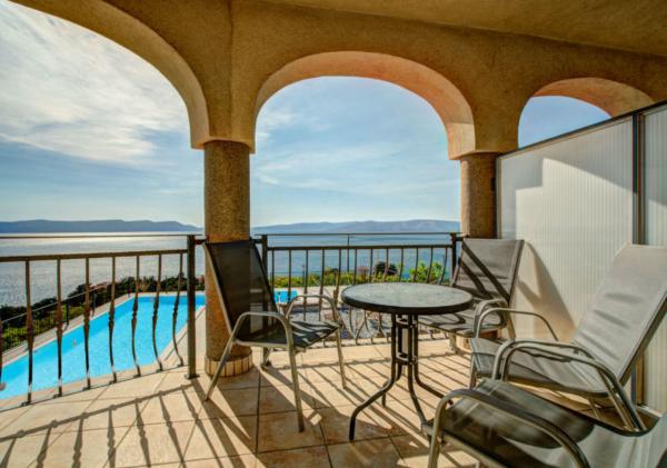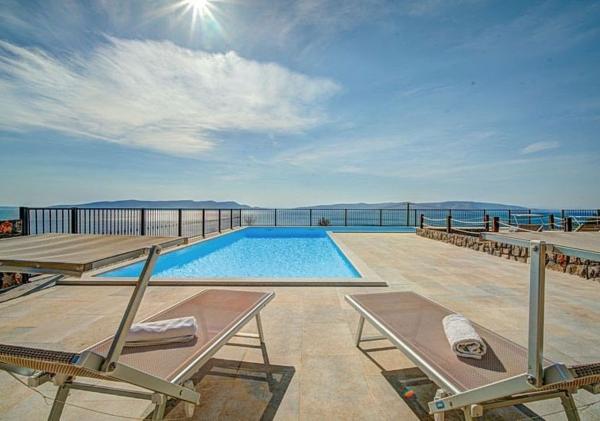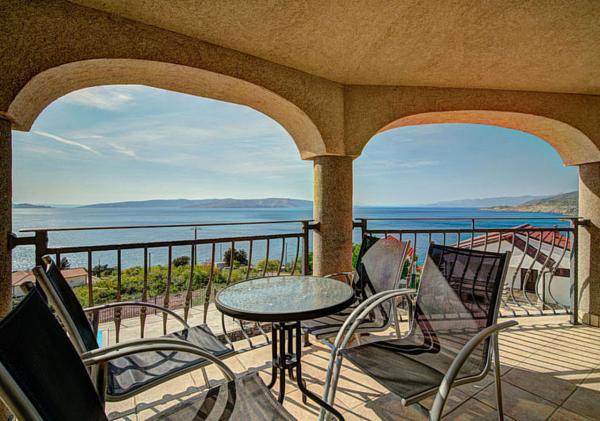 Apartmány s výhledem na moře se nacházejí v klidné vesničce Zakos. Nachází se mezi Senj a St. George ve vznešené poloze, která poskytuje dokonalý výhled na moře a okolní ostrovy. Každý apartmán (4 1) má dvě ložnice s manželskou postelí, koupelnu (sprchový kout, WC) a plně vybavenou kuchyň. Kuchyň, jídelna a obývací pokoj jsou otevřené koncepce. V obývacím pokoji je rozkládací pohovka! Byt 4 2 má 130 m2, se dvěma ložnicemi, 2 koupelnami, chodbami ve skříních. Hosté tohoto apartmánu mají k dispozici parkovací místo ve dvoře, oplocenou terasu u bazénu a velký dvůr. Všechny apartmány mají krytou terasu s posezením a všechny mají výhled na moře a bazén. Bazén je k dispozici všem hostům o velikosti 64 m2, hosté mohou také využít naše lehátka a slunečník (2 lehátka a 1 slunečník na aplikaci)