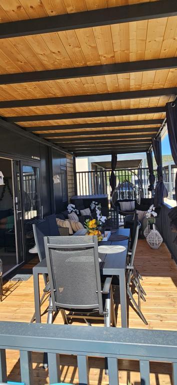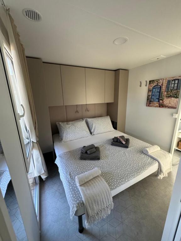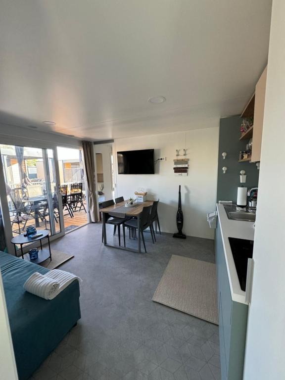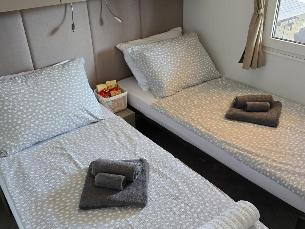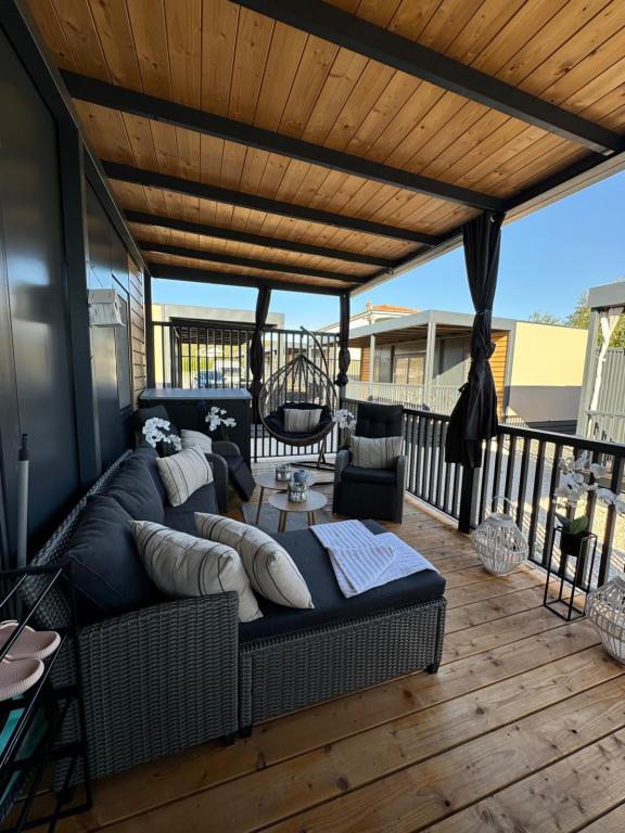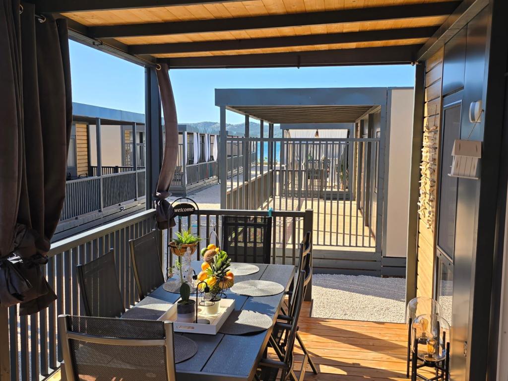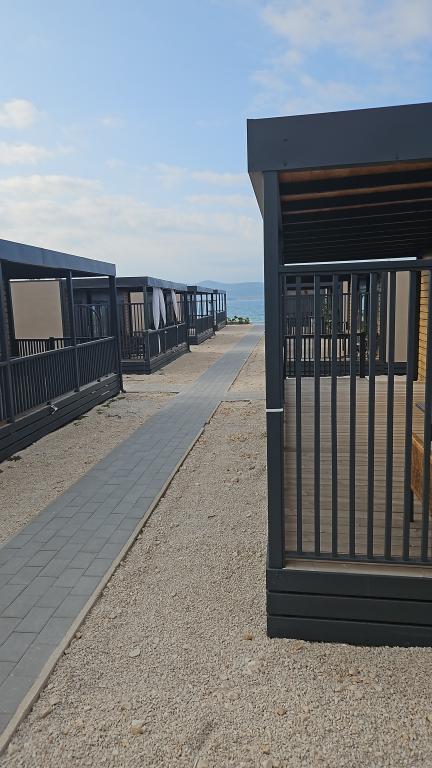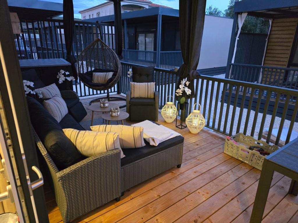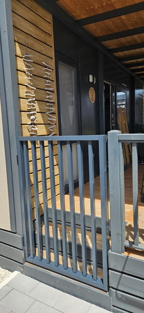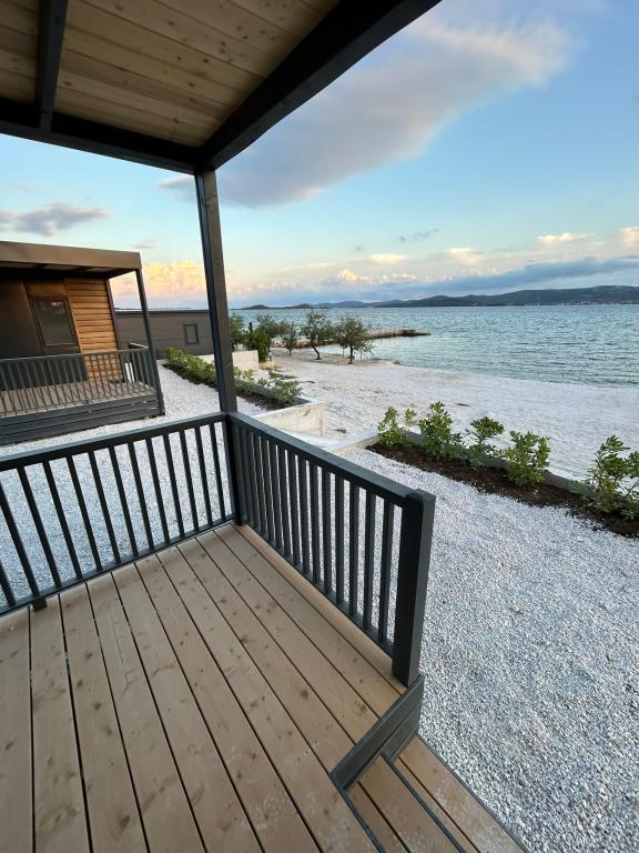 Mobilní dům se nachází v klidném kempu, pouhých 40 metrů od pláže, prostorná terasa s plynovým grilem a stropními ventilátory a dalším relaxačním zařízením, houpačkou a křesly. Dům je vybaven veškerým dalším vybavením a nádobím, které potřebujete k tomu, abyste si dovolenou užili jako doma. Vjezd vozidel do samotného kempu je zakázán, aby si děti mohly bezstarostně hrát, zatímco vy odpočíváte.