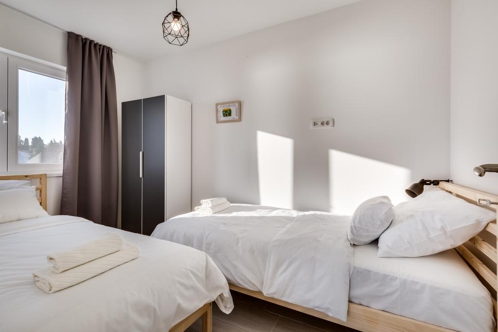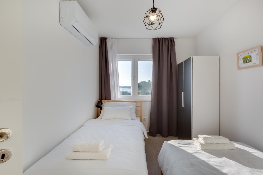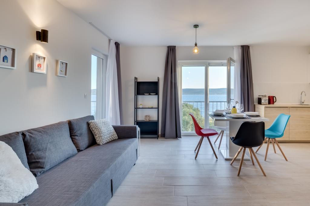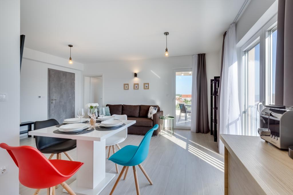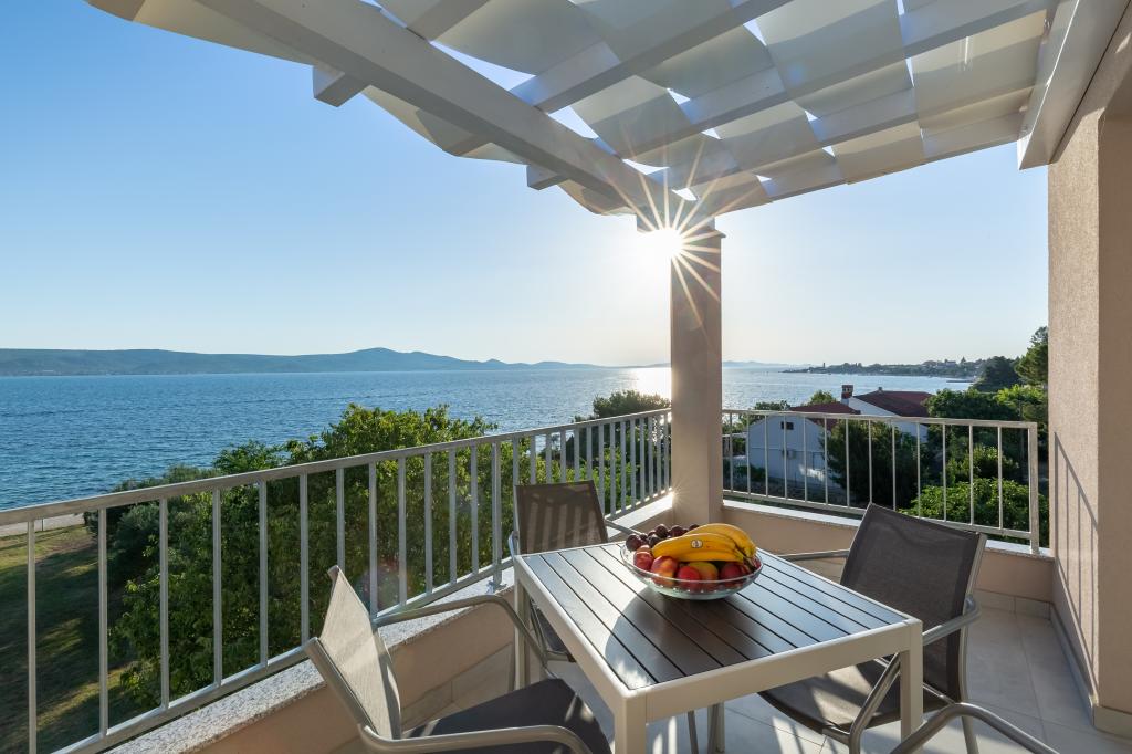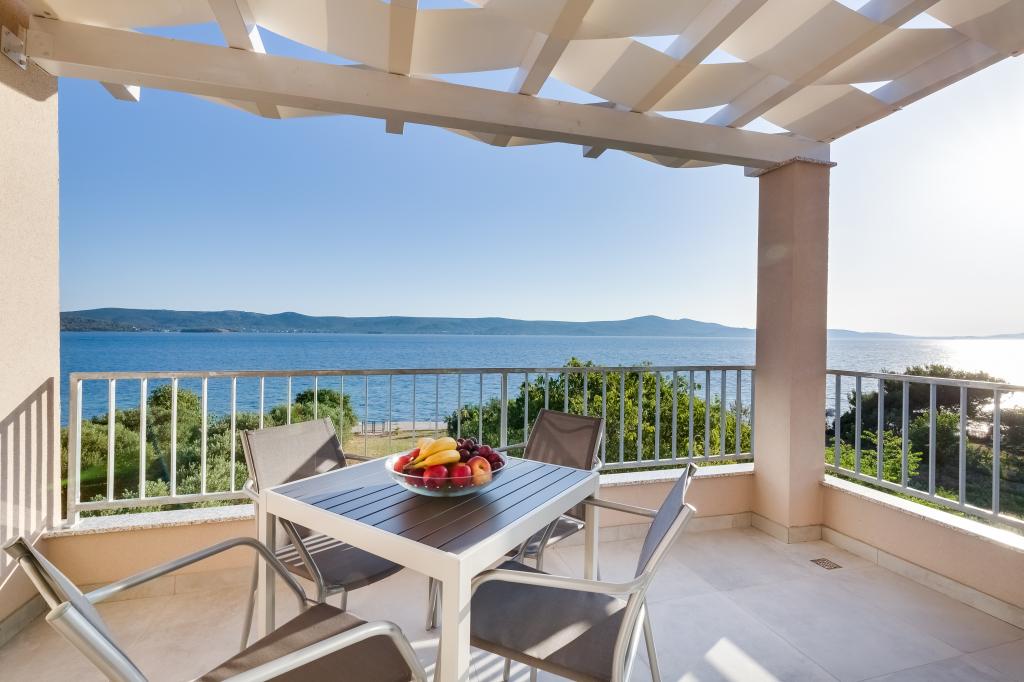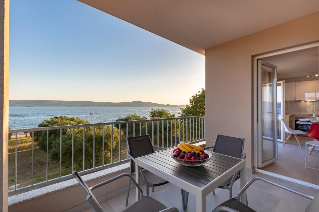 Nové apartmány ve výborné lokalitě přímo u moře. Od moře vás dělí jen dvůr plný olivovníků. Všechny apartmány mají terasu s krásným výhledem na moře. Mají plně vybavenou kuchyň (včetně indukčního sporáku, trouby, myčky, kávovaru), každý pokoj má moskytiéru a klimatizaci. Velká 50palcová TV. V koupelnách je sprchový kout. Užijte si koupání v moři a poté odpočinek na lehátkách ve stínu olivovníků. V noci se projděte podél pobřeží nebo navštivte okolní města (Zadar, Biograd, Šibenik...).