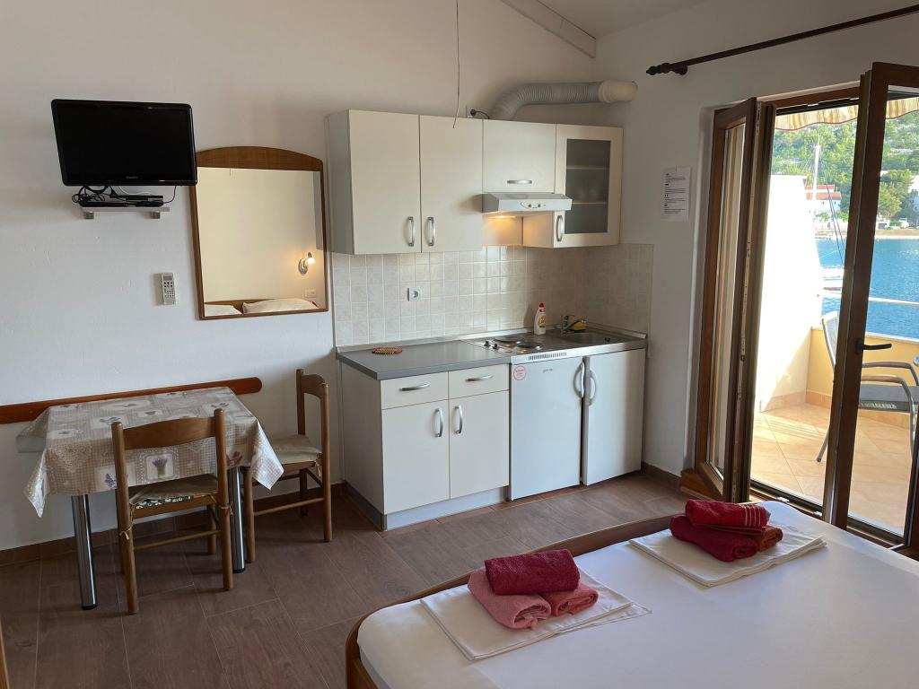 Byt byl velmi čistý a skládá se z ložnice a kuchyně s lednicí a mrazákem, stejně jako přístup na balkon s výhledem na moře. Parkovací místo na pozemku. Velmi přátelský majitel.