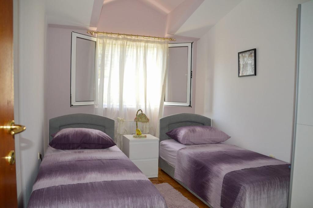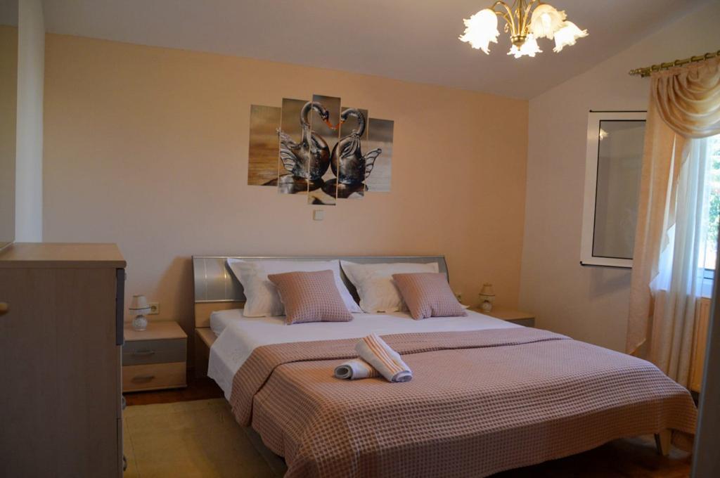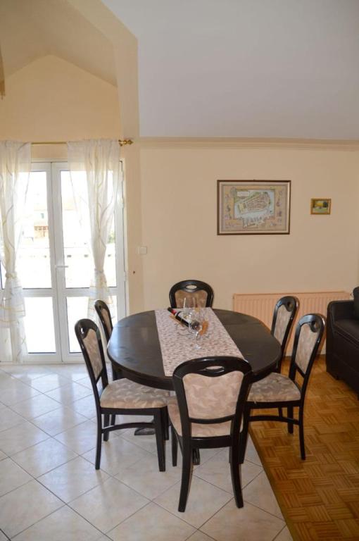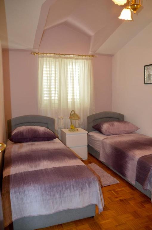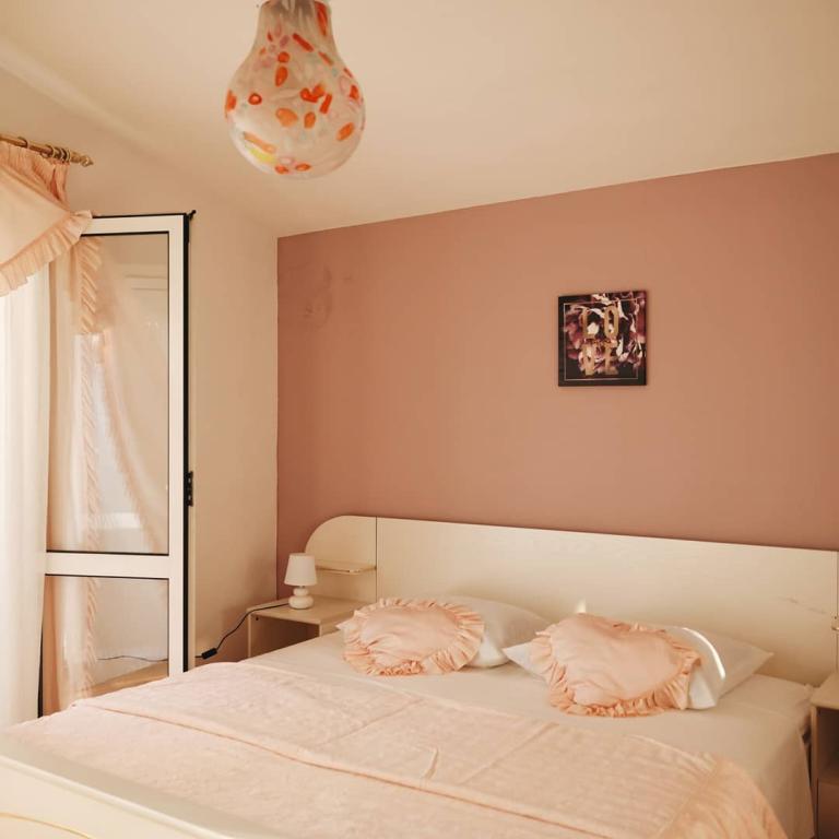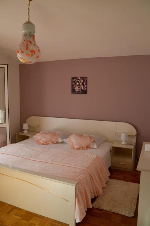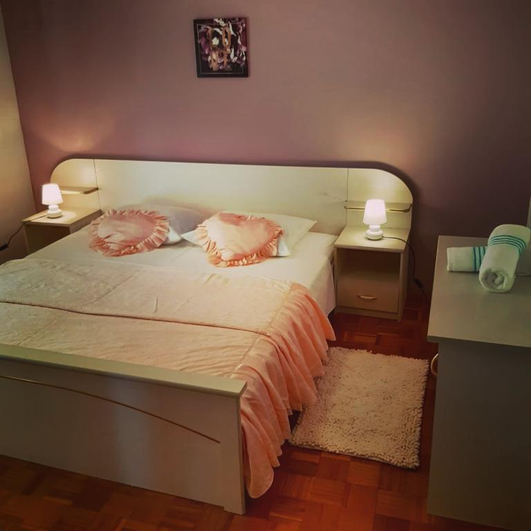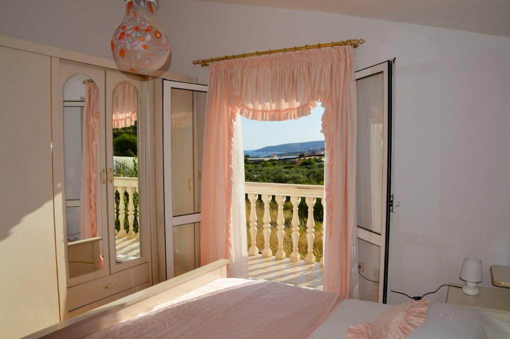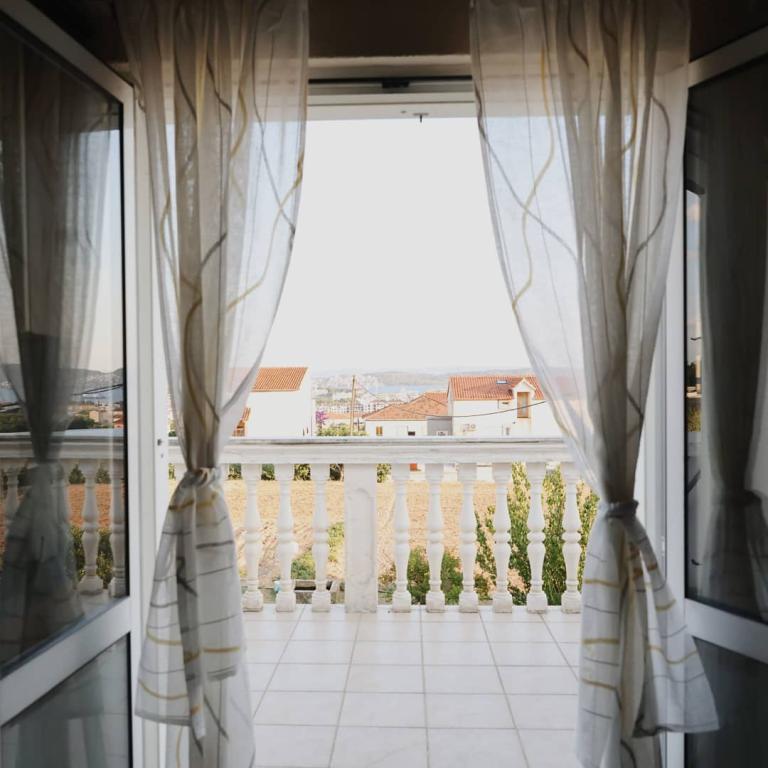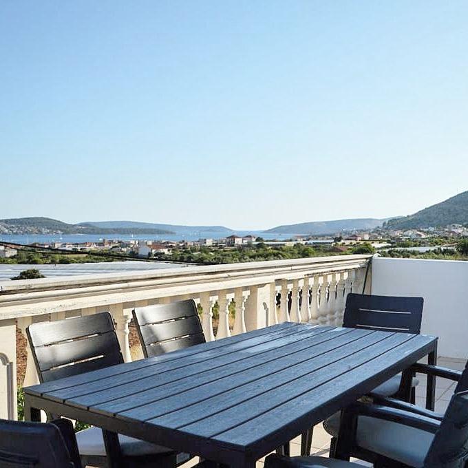 Apartmán Blanka (6) se nachází v Trogiru těsně pod hlavní trogirskou silnicí, 15 minut chůze do centra.Byt se nachází v klidné oblasti v prvním patře a má krásný výhled na město a moře a je vybaven velkým soukromé parkoviště.1ipo WC, kuchyně, wi-fi, TV, klimatizace, pračka, velká terasa, zahrada.
