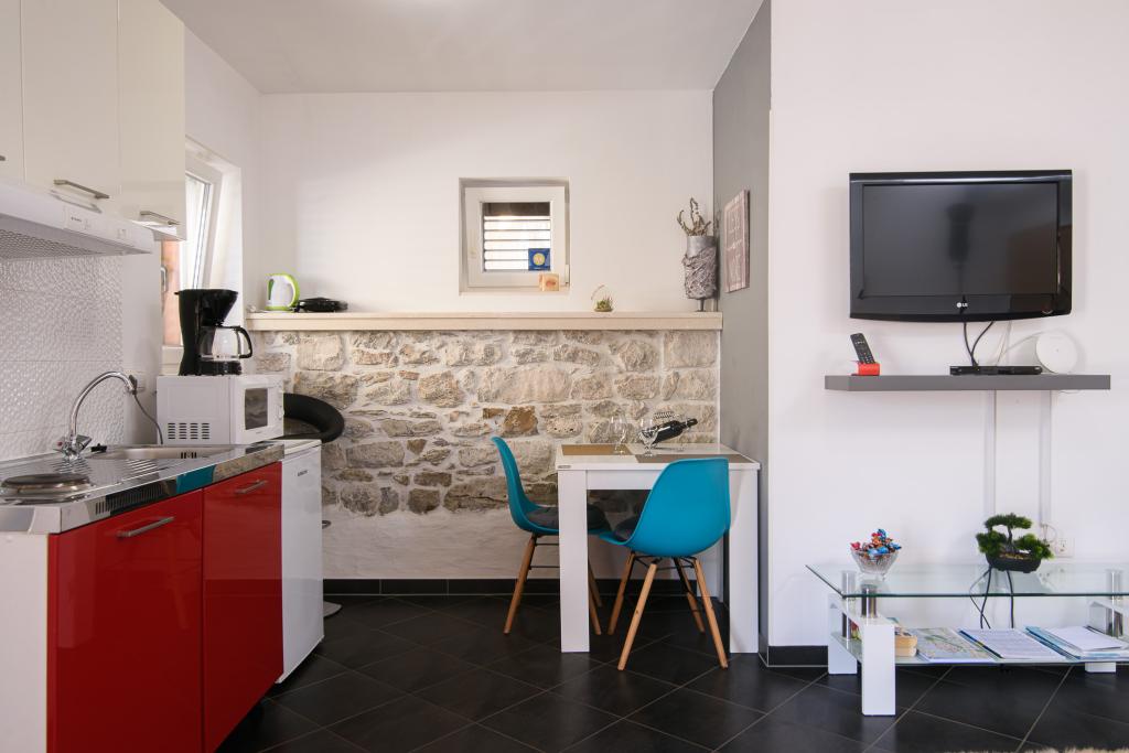 Zcela nové a moderně zařízené 4* apartmány se nacházejí ve staré části Trogiru na ostrově Čiovo. V přízemí je Studio (pro 2 osoby) a v prvním patře je Apartmán (2 + 1). Apartmány byly kompletně zrekonstruovány (2014) s autentickými kamennými zdmi, starými více než 200 let, a jsou plně vybaveny novým nábytkem. Tyto komfortně zařízené apartmány jsou klimatizované a mají bezplatné Wi-Fi. Každý pokoj má vlastní koupelnu s fénem. Zařízení je jen 2 minuty od starého města Trogir. V bezprostřední blízkosti jsou pláže vzdálené 5 minut, malý přístav pro lodě, obchody, restaurace, trh a četné kavárny. Před apartmánem je malý terminál lodí Trogir-Split. Můžete si zde také pronajmout loď, kolo nebo skútr. Apartmány se nacházejí v klidné rodinné čtvrti, obklopené starými kamennými domy, přímo u moře s nezapomenutelným výhledem na staré město! Pro všechny hosty je k dispozici bezplatné parkoviště. vítej :)