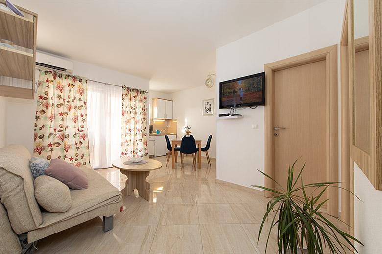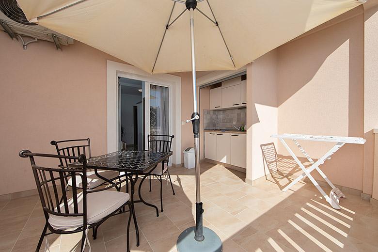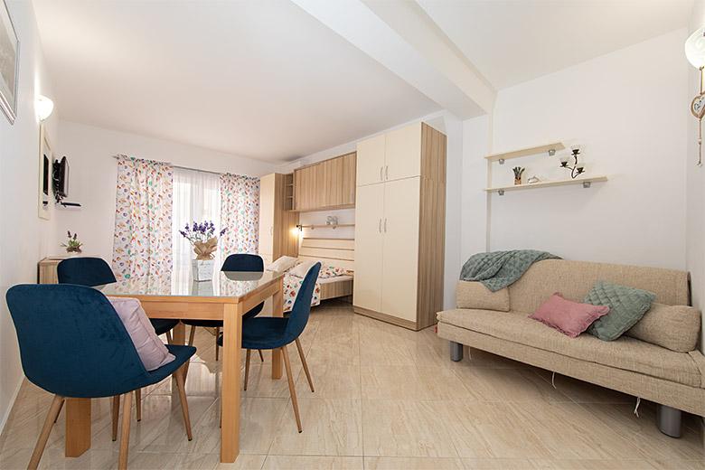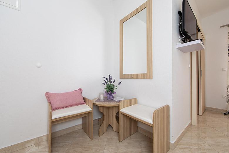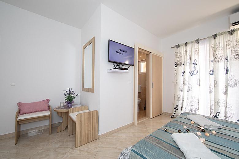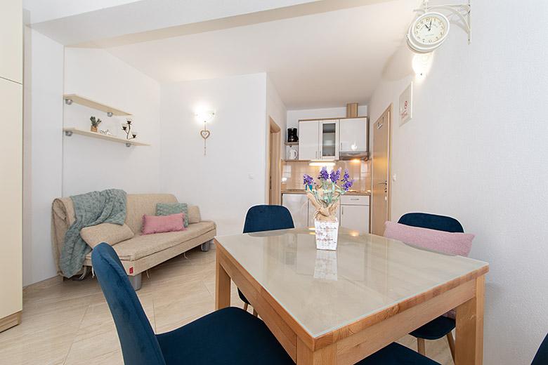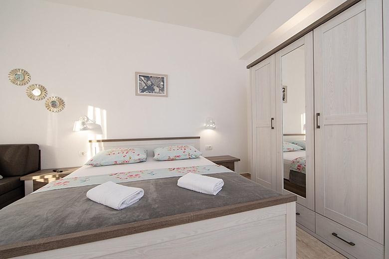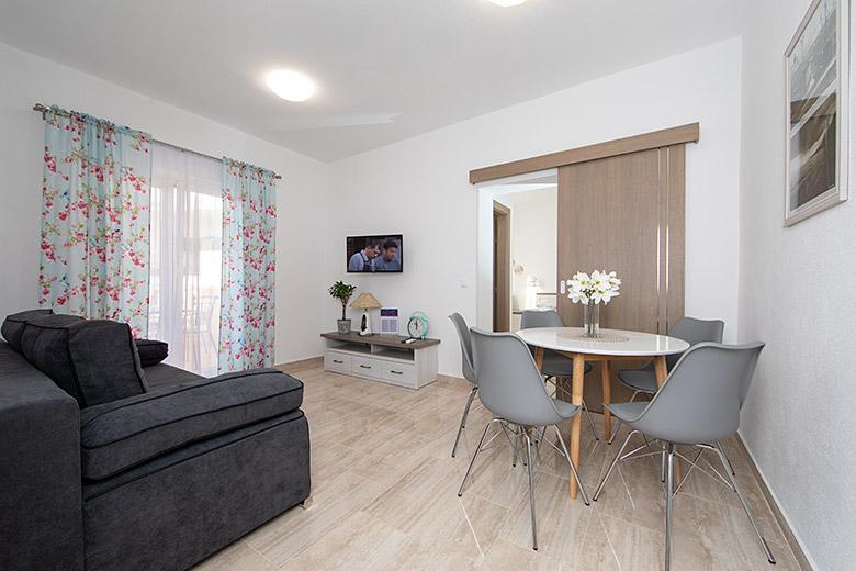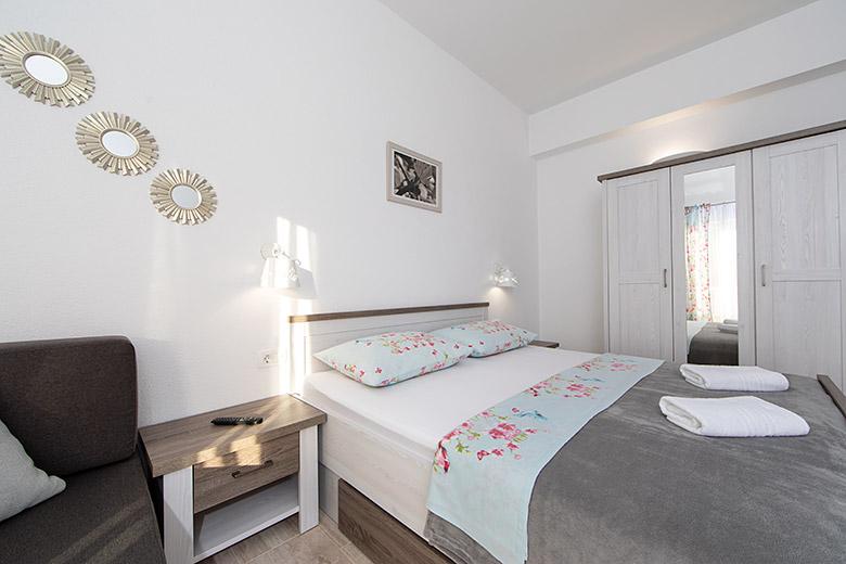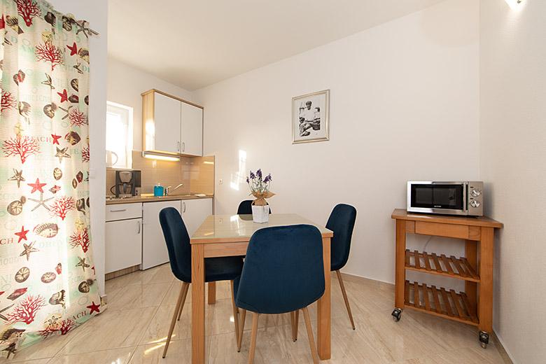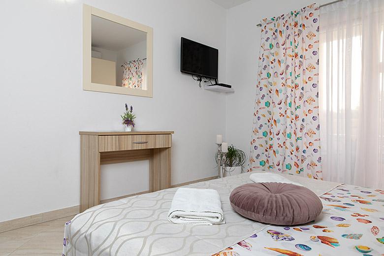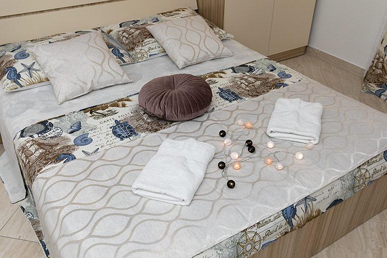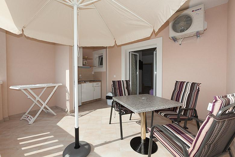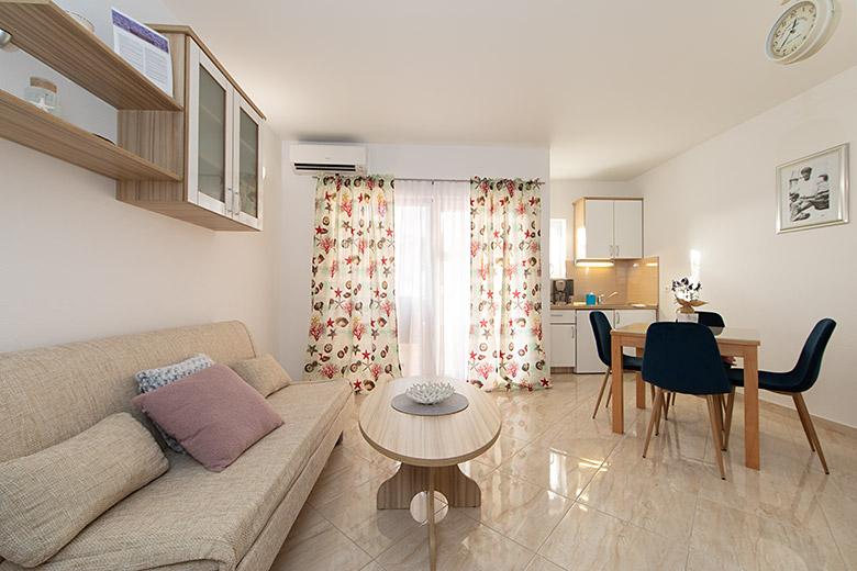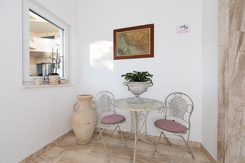 Pobytová taxa je v ceně.Majitelka je velmi přístupná a zdvořilá Byt je velmi čistý a voňavý, postele jsou pohodlné. Velká terasa s malou kuchyňkou, která obsahuje vše, co potřebujete k vaření V bytě je sušák na prádlo, fén, rychlovarná konvice, kávovar, na chodbě je šatna na další nezbytnosti. (toaletní papír, pytle na odpadky, prací prostředek, žehlička, žehlicí prkno,...) Byt je velmi blízko všeho, pekárna, trh, restaurace, centrum, pláž 50 m.. Před apartmánem je zajištěno bezplatné parkování Vřele všem doporučuji
