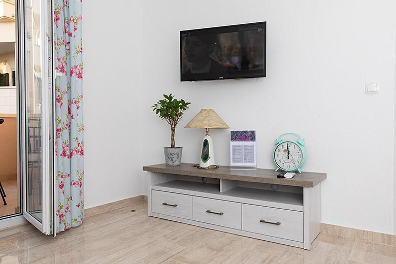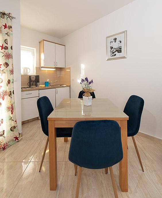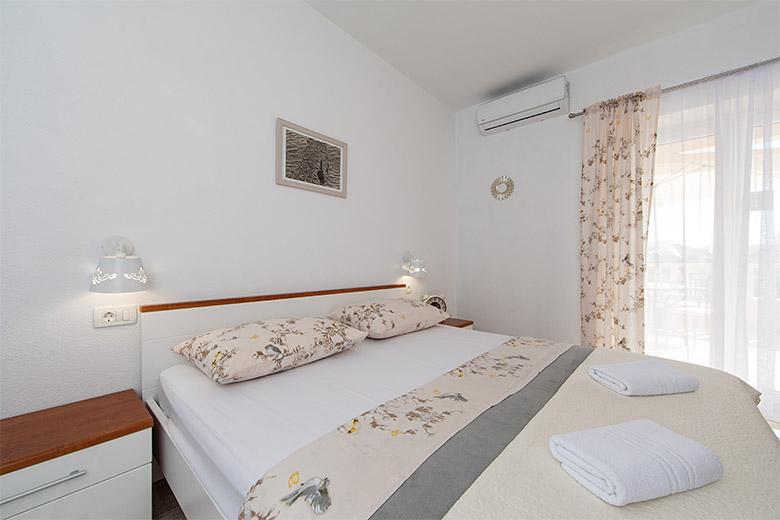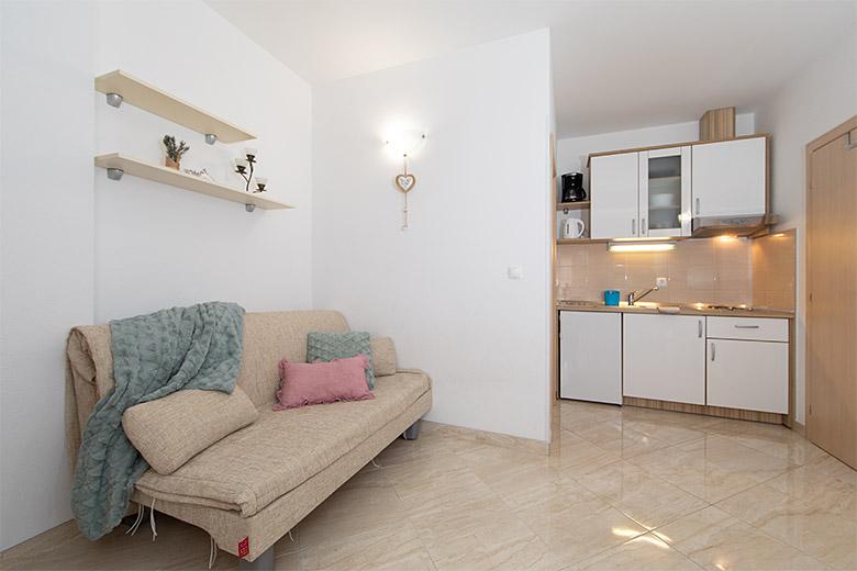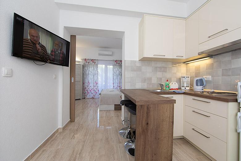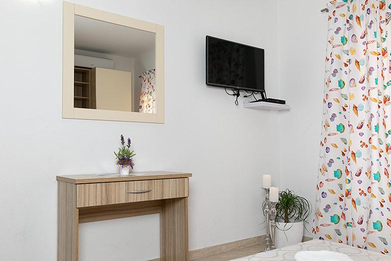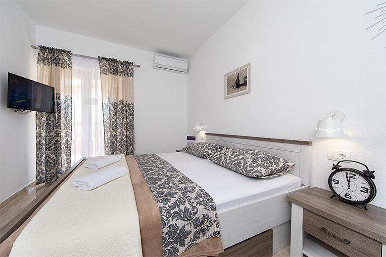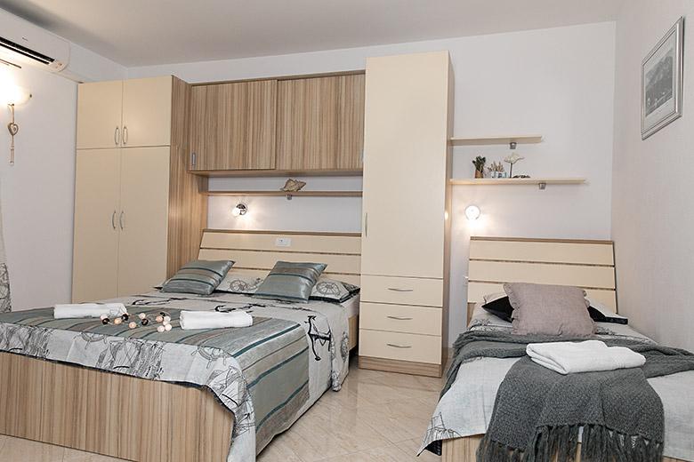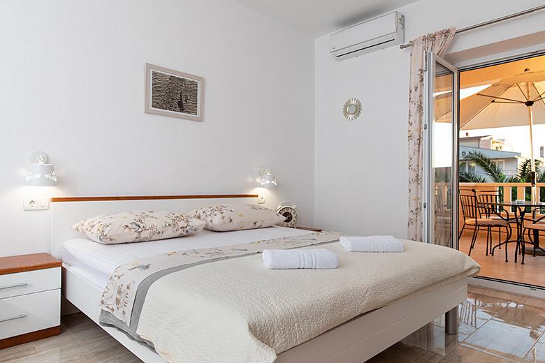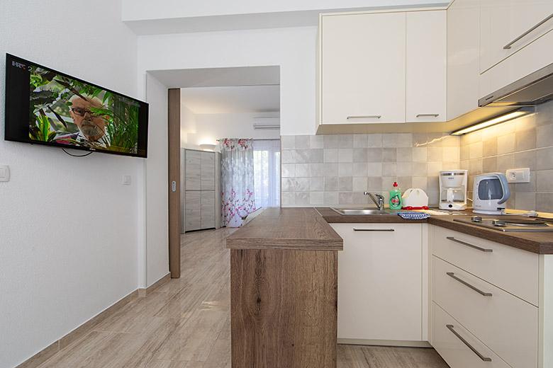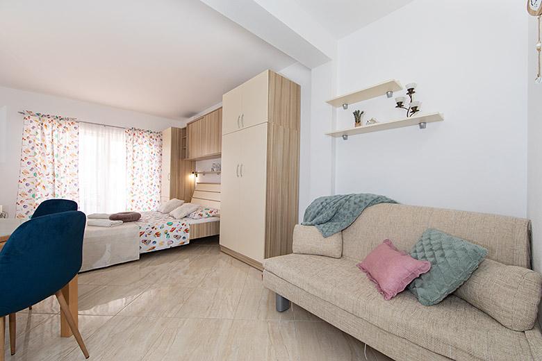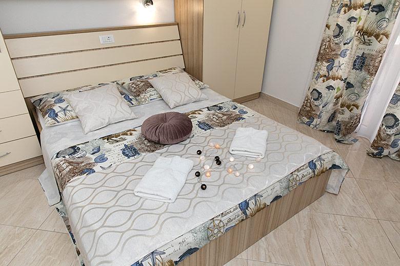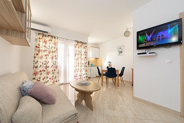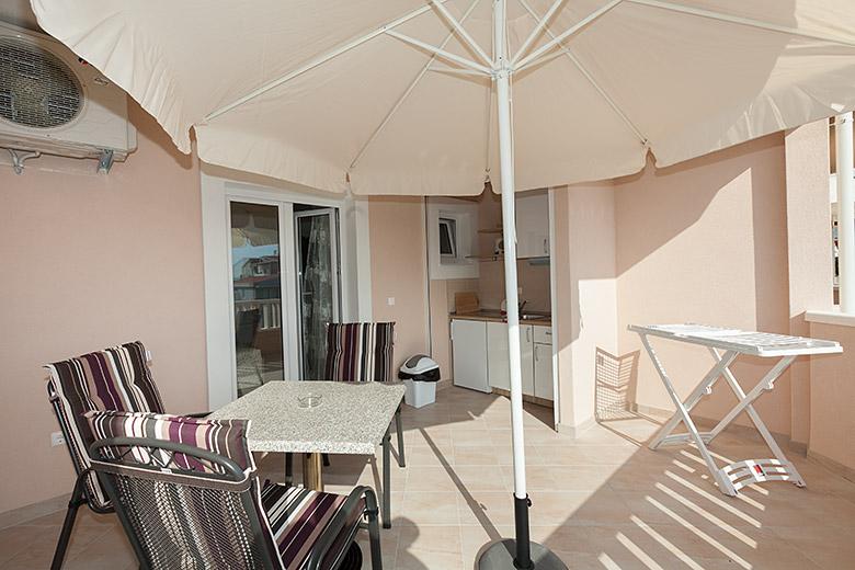 Pobytová taxa je v ceně.Majitelka je velmi přístupná a zdvořilá Byt je velmi čistý a voňavý, postele jsou pohodlné. Velká terasa s malou kuchyňkou, která obsahuje vše, co potřebujete k vaření V bytě je sušák na prádlo, fén, rychlovarná konvice, kávovar, na chodbě je šatna na další nezbytnosti. (toaletní papír, pytle na odpadky, prací prostředek, žehlička, žehlicí prkno,...) Byt je velmi blízko všeho, pekárna, trh, restaurace, centrum, pláž 50 m.. Před apartmánem je zajištěno bezplatné parkování Vřele všem doporučuji