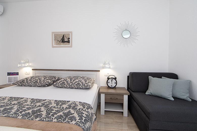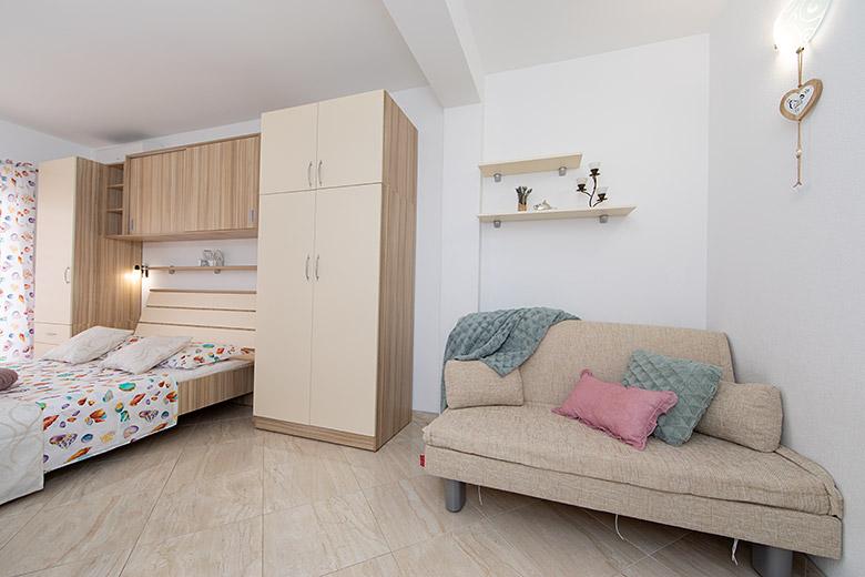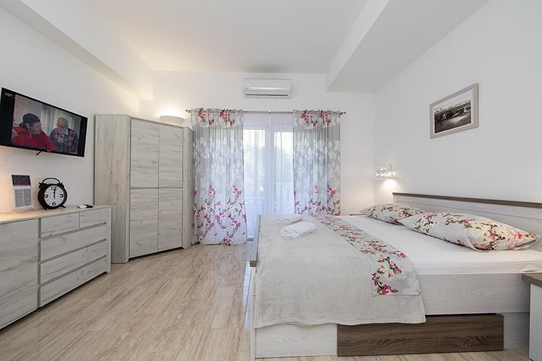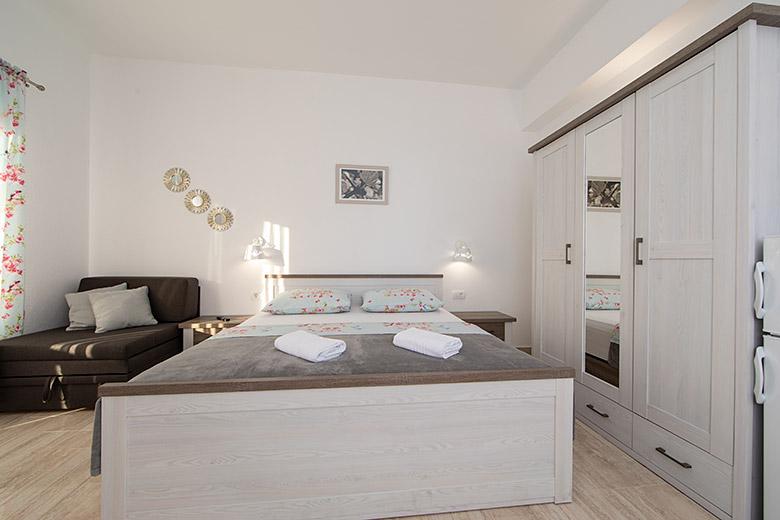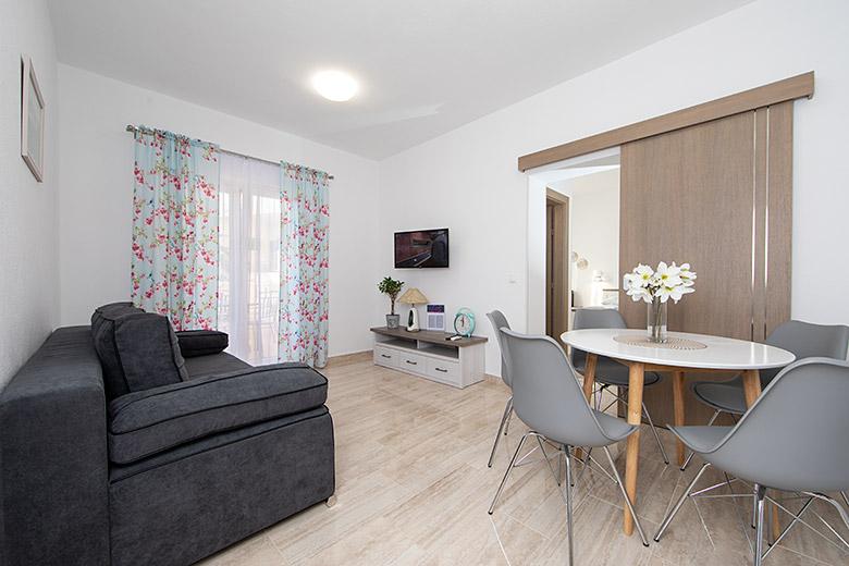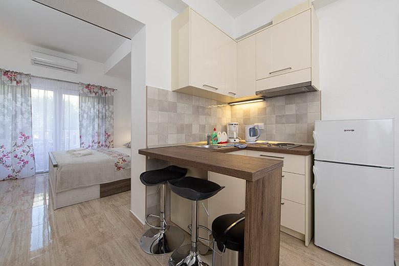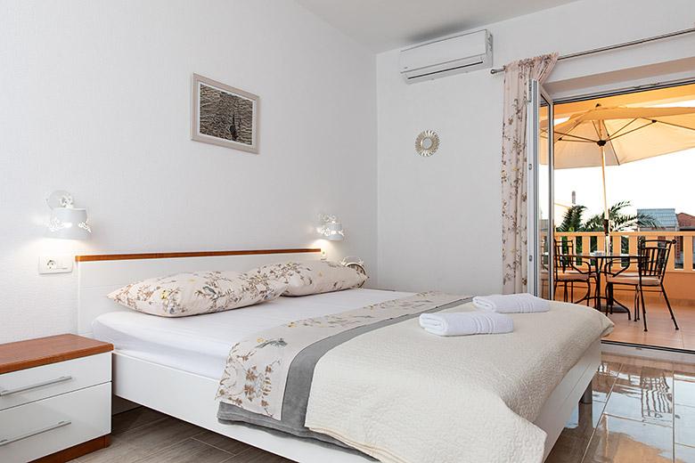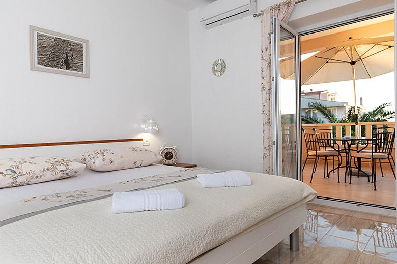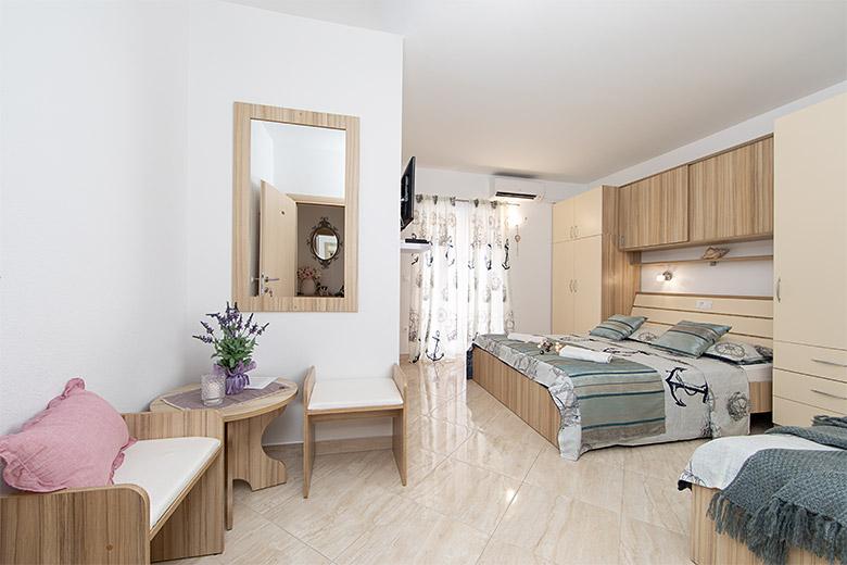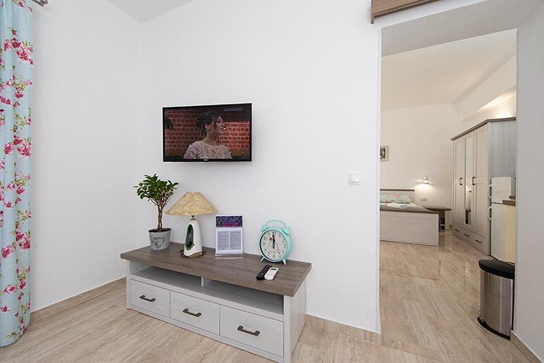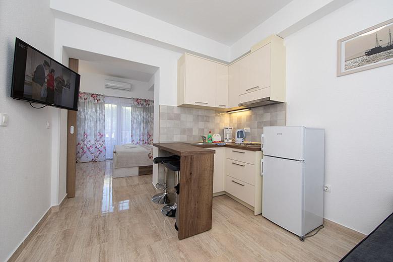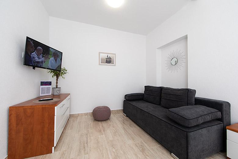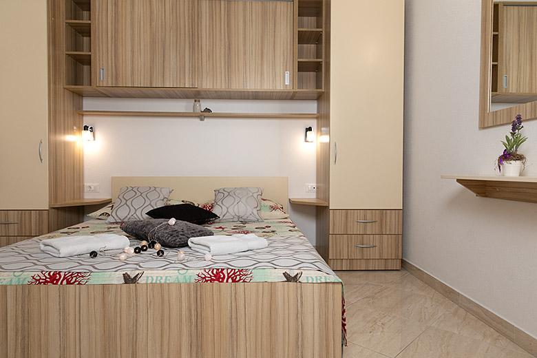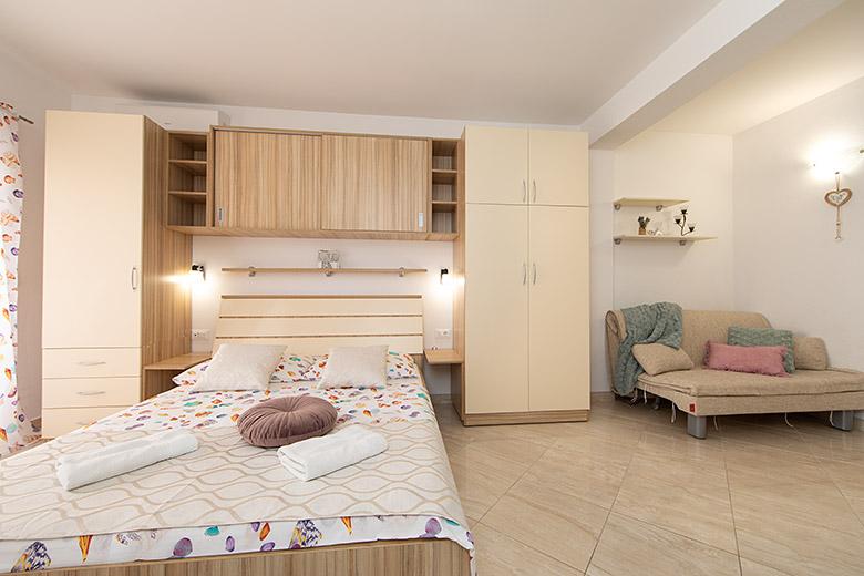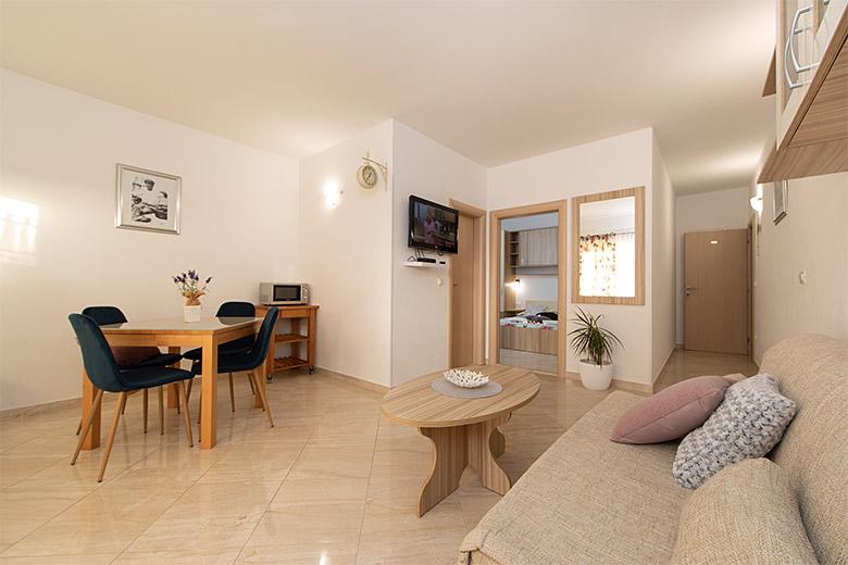 Pobytová taxa je v ceně.Majitelka je velmi přístupná a zdvořilá Byt je velmi čistý a voňavý, postele jsou pohodlné. Velká terasa s malou kuchyňkou, která obsahuje vše, co potřebujete k vaření V bytě je sušák na prádlo, fén, rychlovarná konvice, kávovar, na chodbě je šatna na další nezbytnosti. (toaletní papír, pytle na odpadky, prací prostředek, žehlička, žehlicí prkno,...) Byt je velmi blízko všeho, pekárna, trh, restaurace, centrum, pláž 50 m.. Před apartmánem je zajištěno bezplatné parkování Vřele všem doporučuji