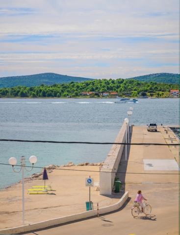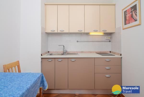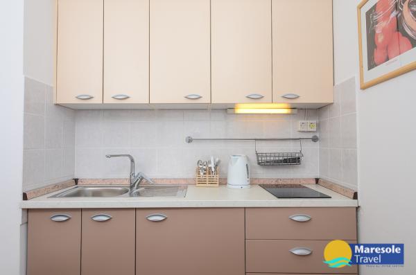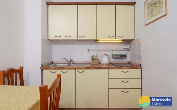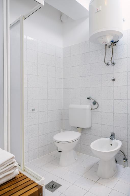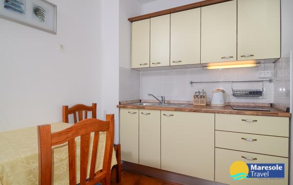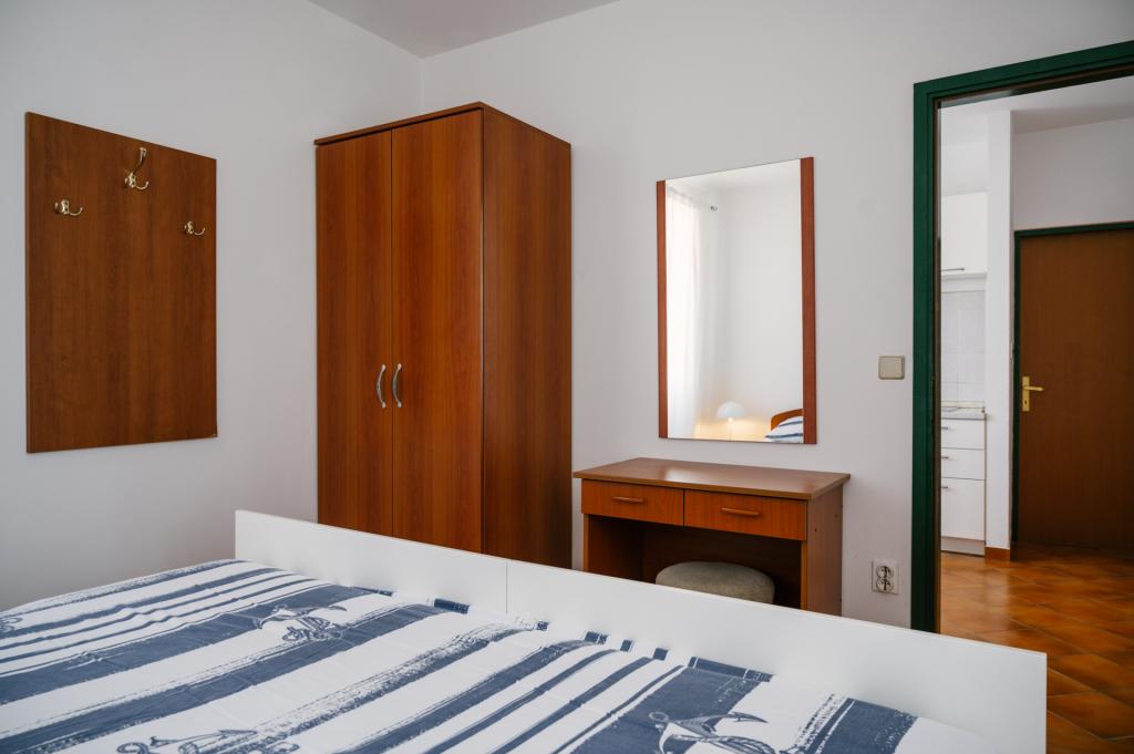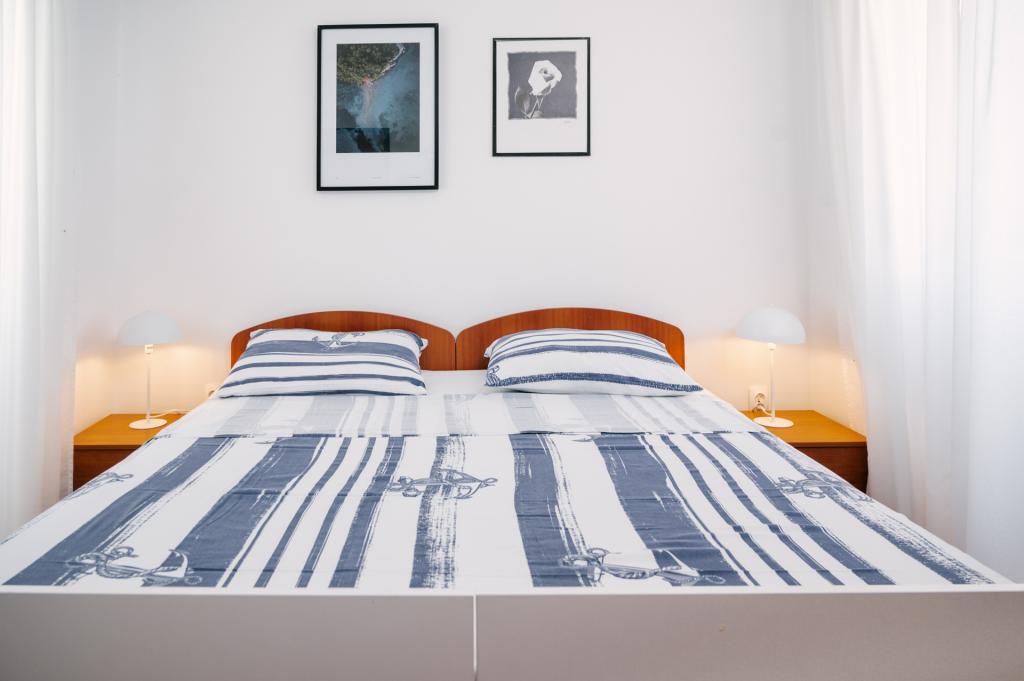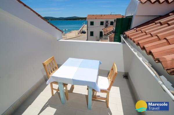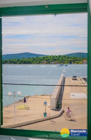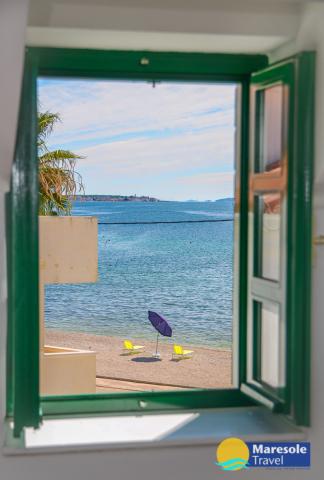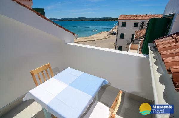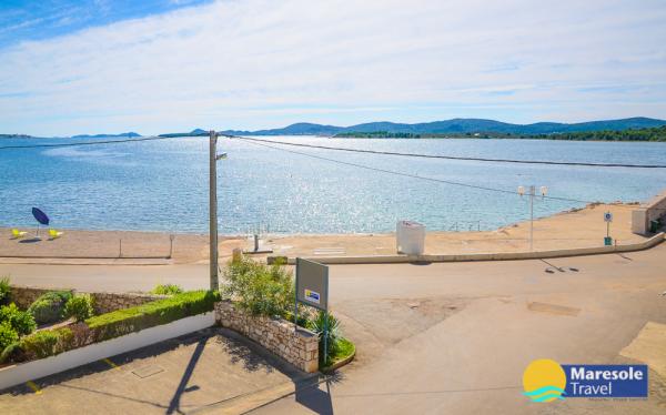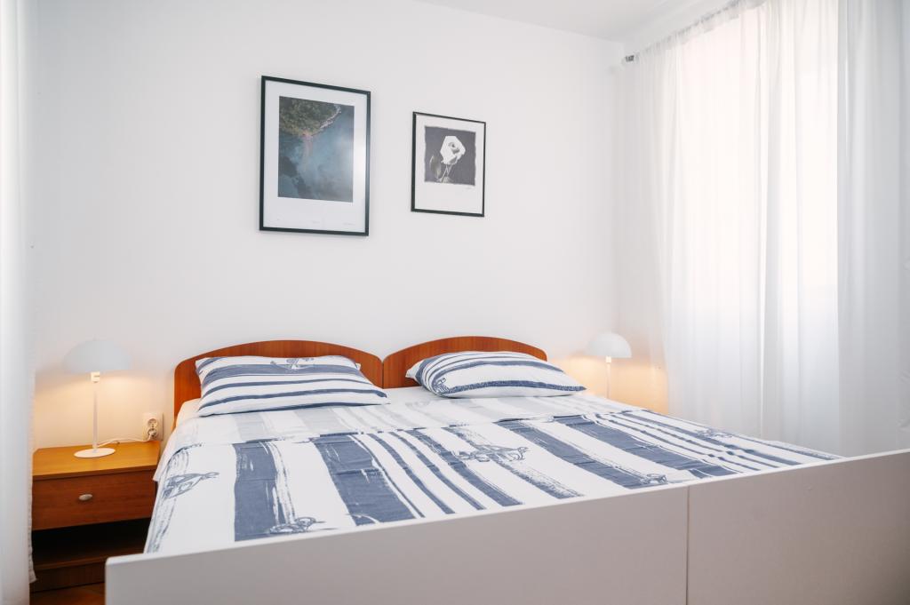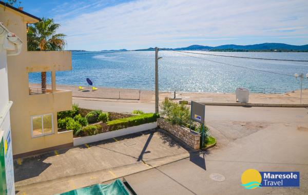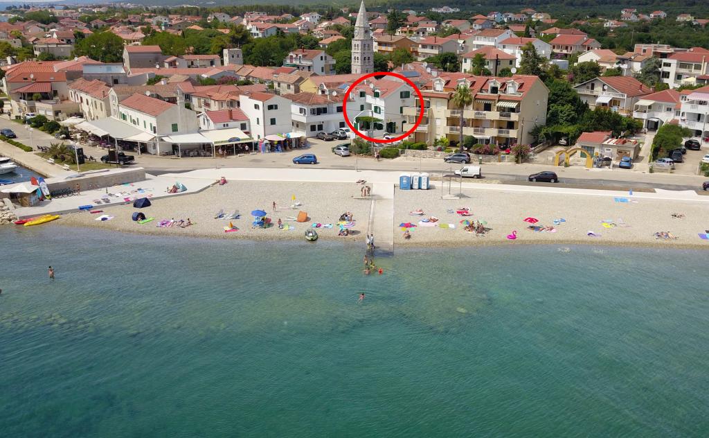 Moderní apartmány se nacházejí v prvním patře a druhém patře (horní patro) v domě v centru města, na prvním řádku na pláž, s výhledem na moře. Apartmány se skládají z obývacího pokoje s jídelnou a kuchyní v jednom prostoru, byt s balkonem s výhledem na moře, jedna ložnice s manželskou postelí, koupelna se sprchou / WC. Parkování ve veřejném prostoru v přední části domu. - Příplatek za domácí zvířata E5, 00 za den.