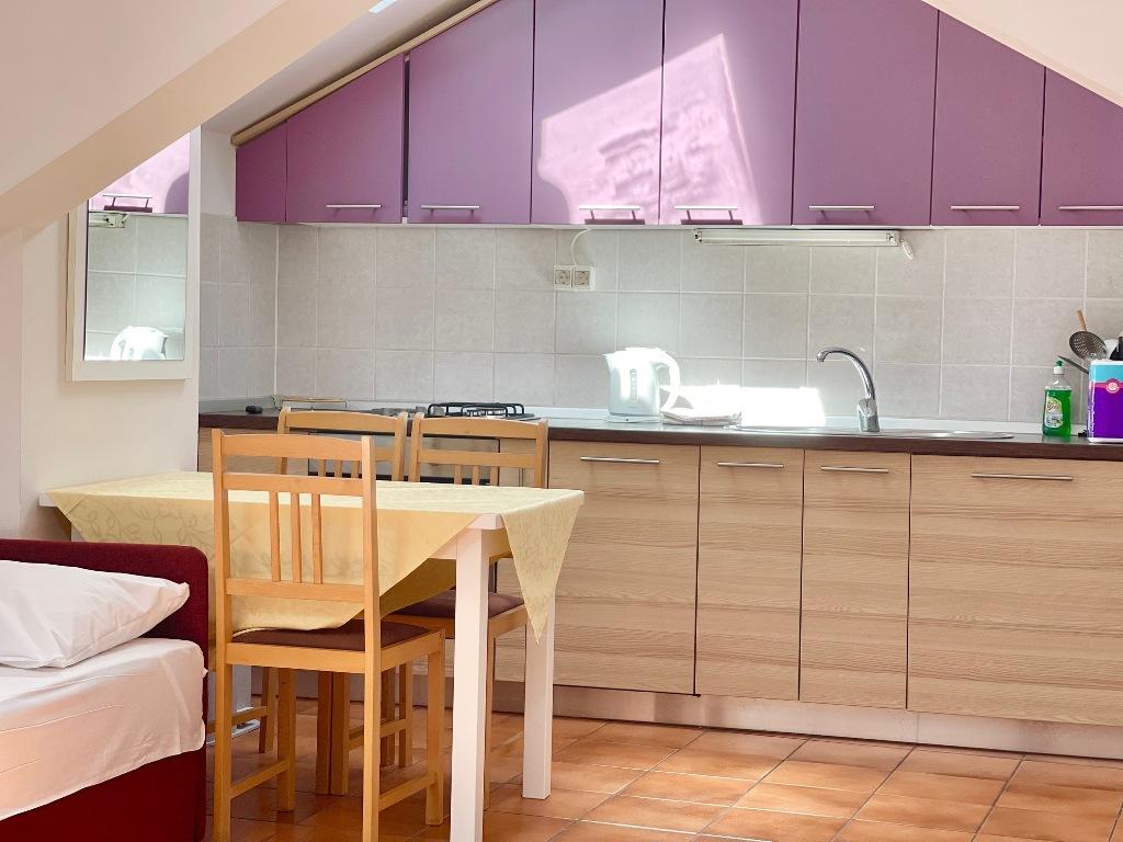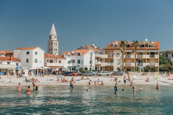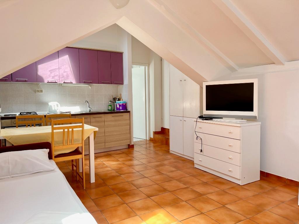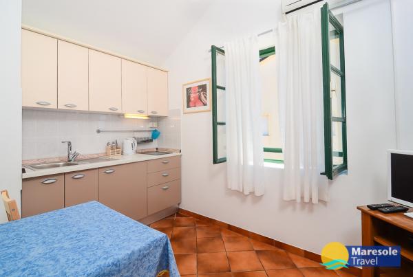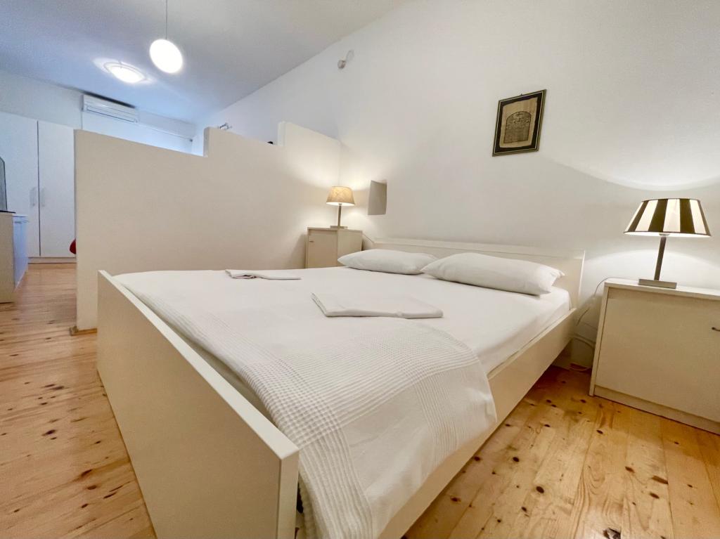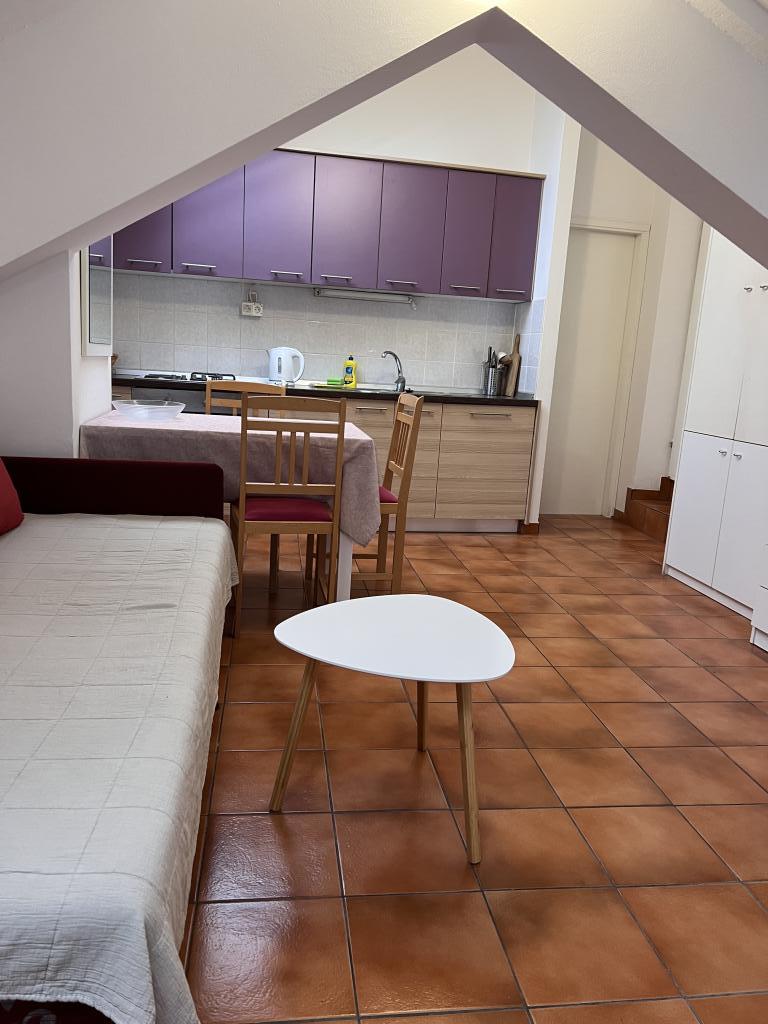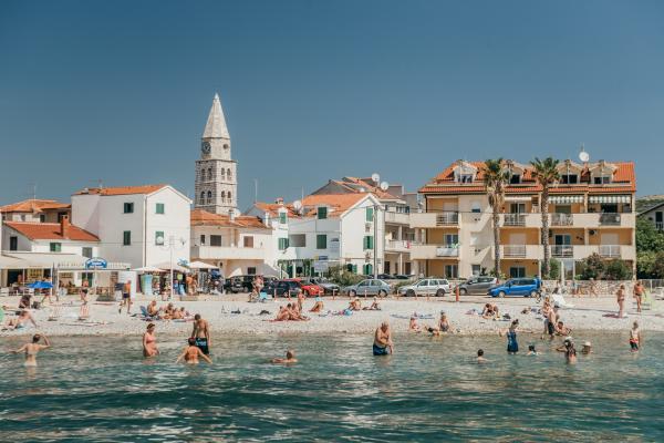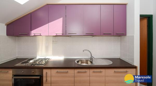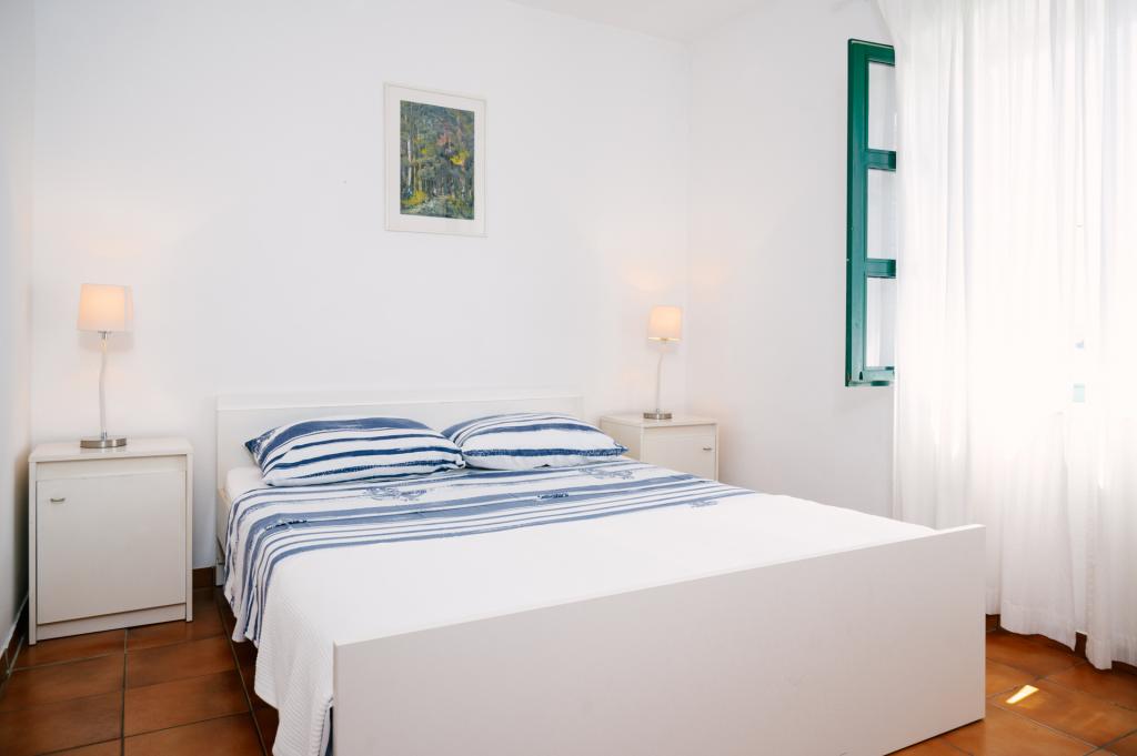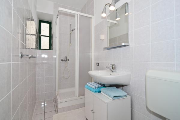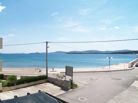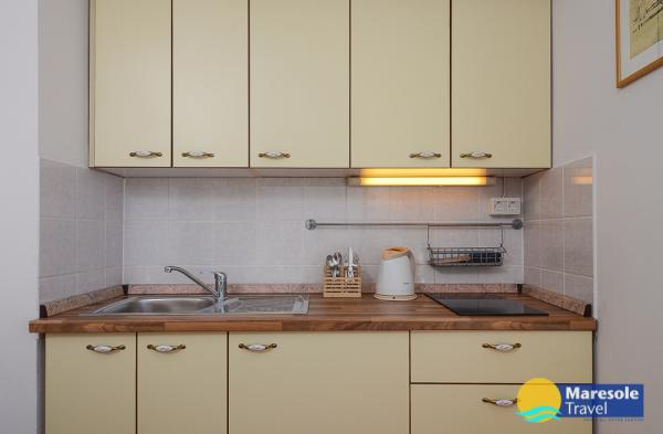 Moderní apartmány se nacházejí v prvním patře a druhém patře (horní patro) v domě v centru města, na prvním řádku na pláž, s výhledem na moře. Apartmány se skládají z obývacího pokoje s jídelnou a kuchyní v jednom prostoru, byt s balkonem s výhledem na moře, jedna ložnice s manželskou postelí, koupelna se sprchou / WC. Parkování ve veřejném prostoru v přední části domu. - Příplatek za domácí zvířata E5, 00 za den.
