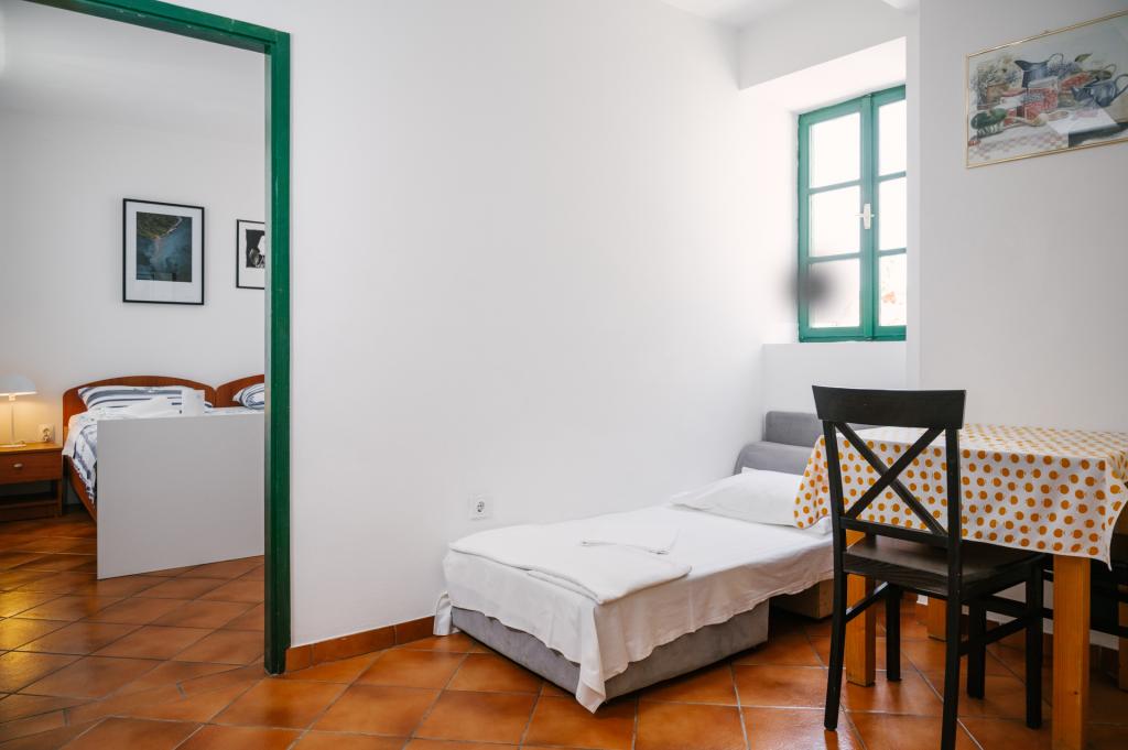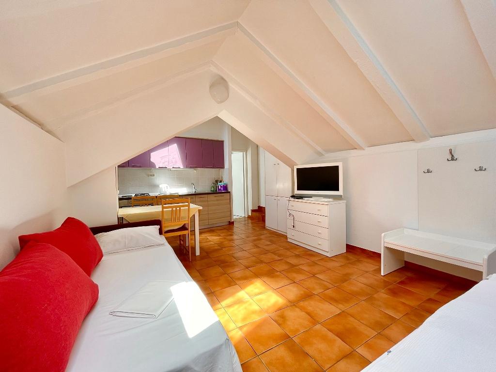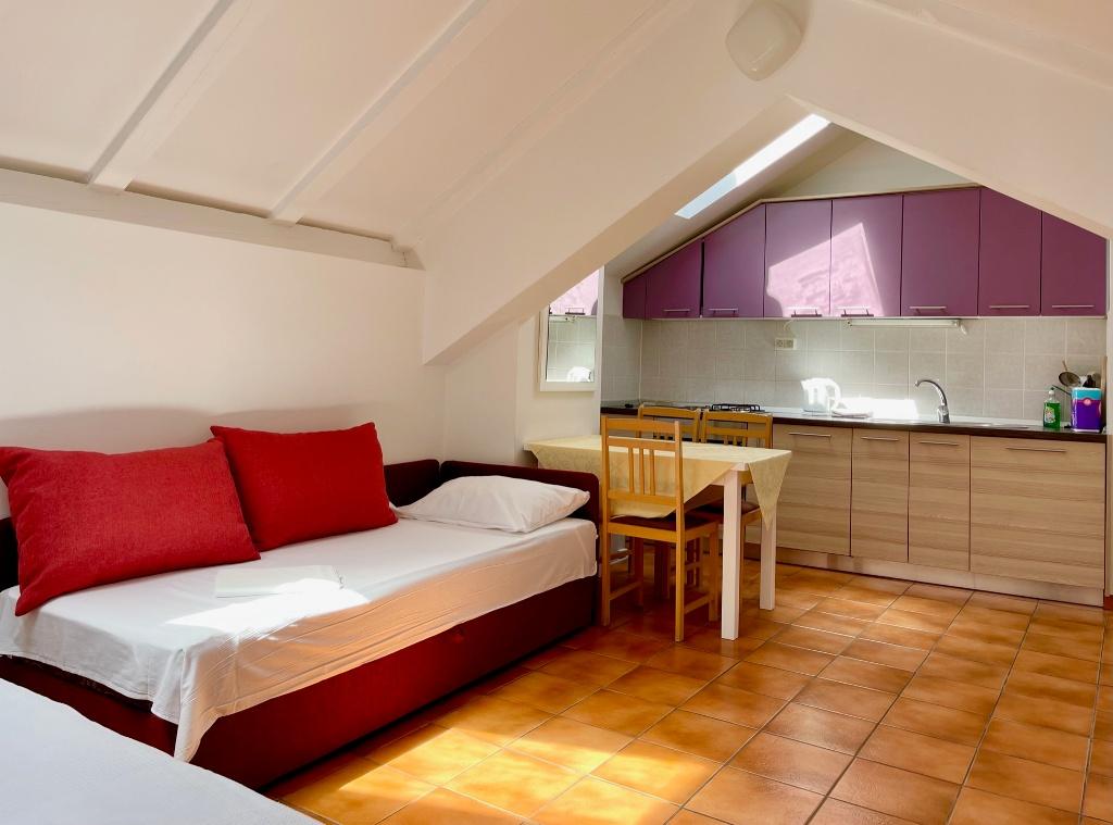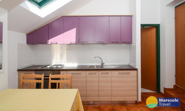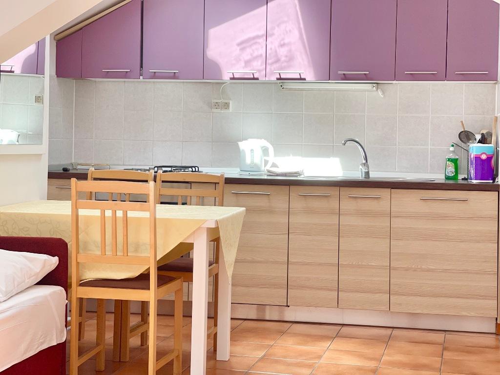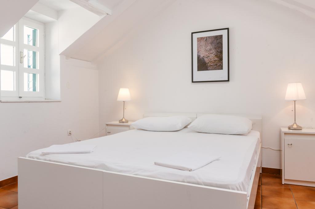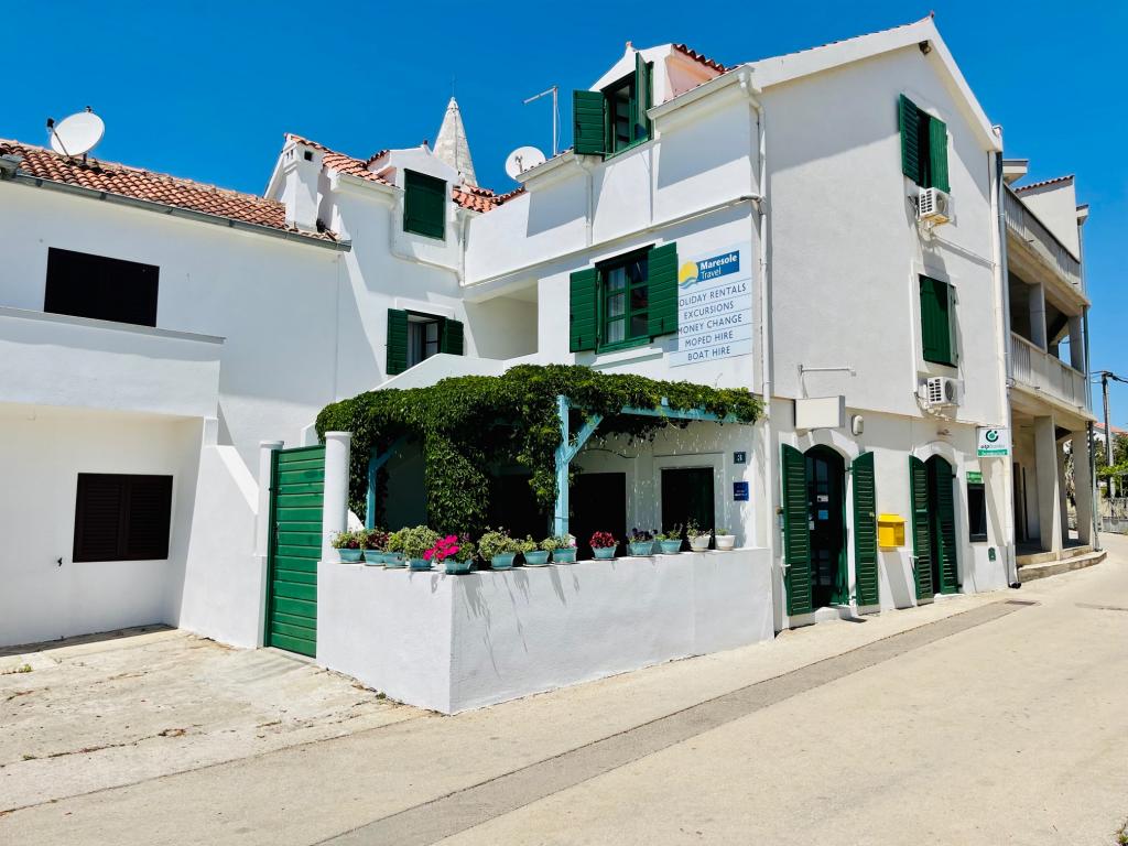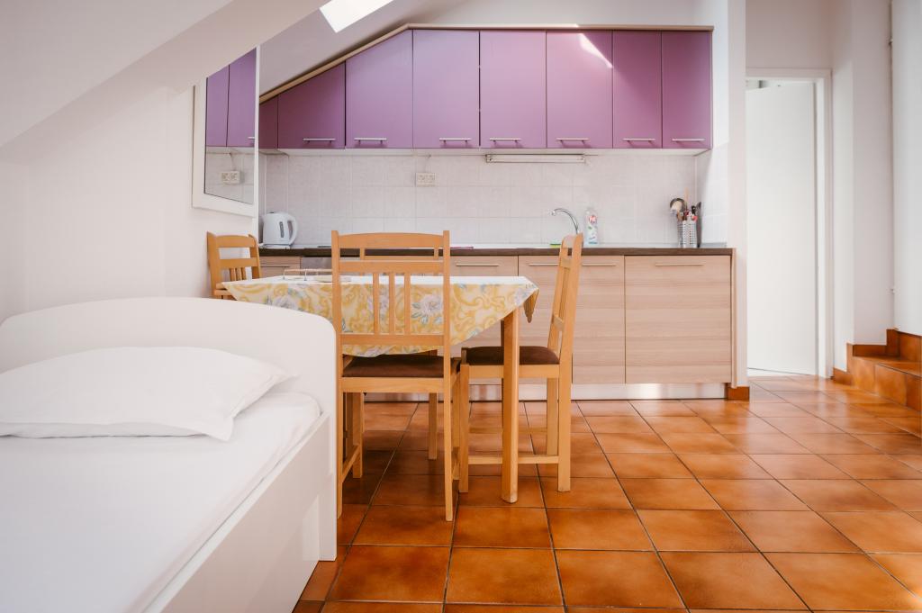 Moderní apartmány se nacházejí v prvním patře a druhém patře (horní patro) v domě v centru města, na prvním řádku na pláž, s výhledem na moře. Apartmány se skládají z obývacího pokoje s jídelnou a kuchyní v jednom prostoru, byt s balkonem s výhledem na moře, jedna ložnice s manželskou postelí, koupelna se sprchou / WC. Parkování ve veřejném prostoru v přední části domu. - Příplatek za domácí zvířata E5, 00 za den.
