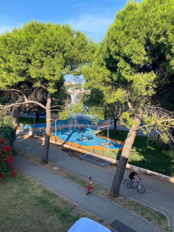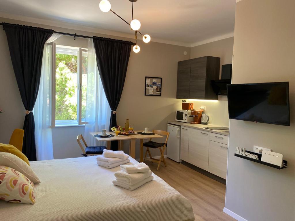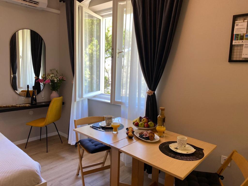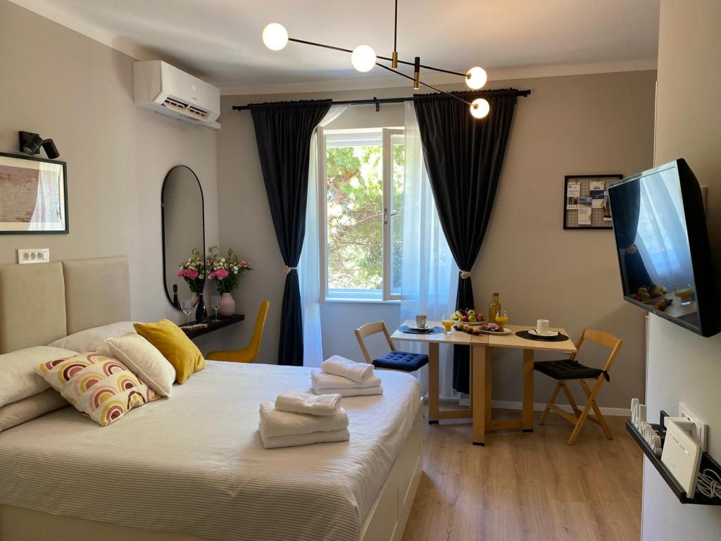 Studiový apartmán "Victor 27" je okouzlující ubytování na klidném místě v centru města v blízkosti všech zajímavých zařízení. Díky optimální poloze na začátku nábřeží se zde můžete vydávat na dlouhé procházky, jezdit na kole nebo si užít panoramatickou jízdu vláčkem podél umagského pobřeží. Z okna je vidět zelené borovice a v pozadí se moře usmívá na starý městský přístav. Studio se nachází ve druhém patře bez výtahu. Parkování je zdarma uvnitř budovy. Po předchozí žádosti je možné přidat třetí lůžko pro děti a je zde také možnost použití jízdního kola (to se určuje při rezervaci).