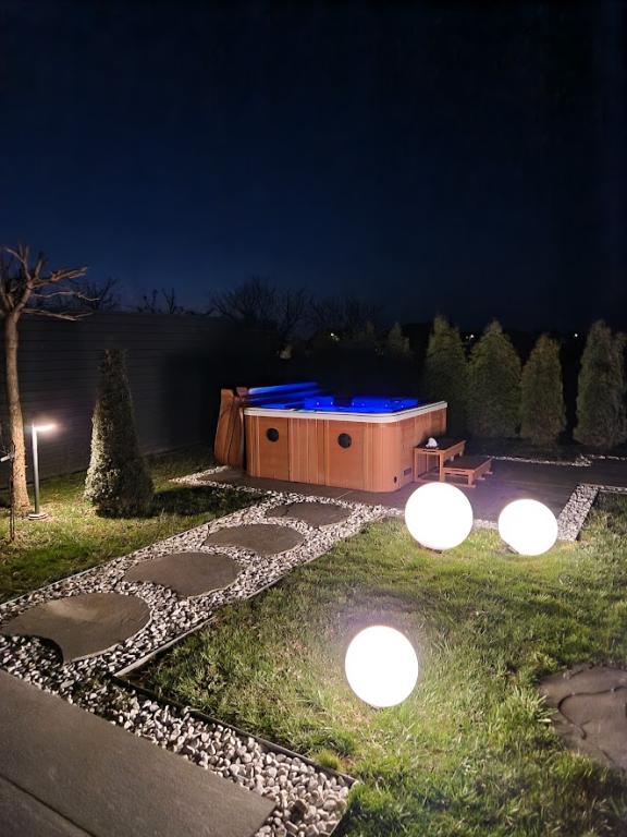 Použití jacuzzi je zahrnuto v ceně pobytu a není zpoplatněno. Vedle domu je velká terasa s grilem, lehátky, houpací sítí, solární sprchou a velkým, dobře udržovaným trávníkem. Dále je možné si zapůjčit kola (za příplatek), využít elektrické šipky, ohniště na dvorku a další sportovní potřeby, pískoviště pro malé děti, stan na hraní... Povolena jsou malá, slušně vychovaná domácí zvířata, s případným příplatkem za úklid. Dvůr je kompletně oplocený.
