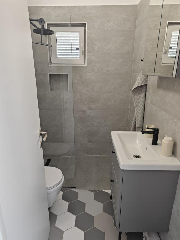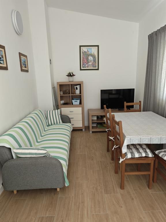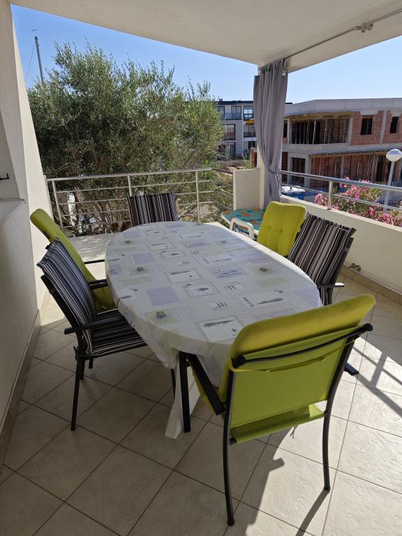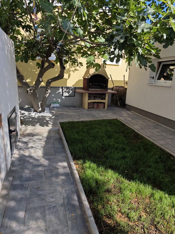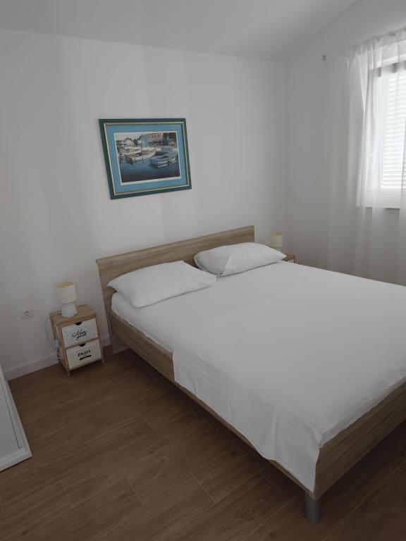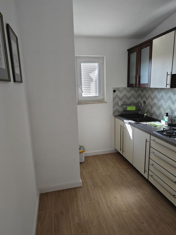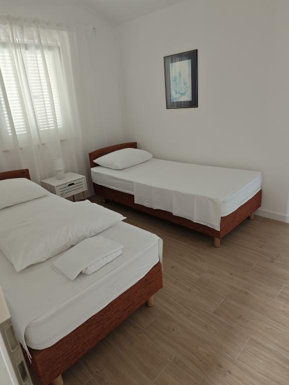 Nabízíme k pronájmu byt v domě, první patro, samostatný vchod, parkování ve dvoře. Byt se skládá ze dvou pokojů, - Jeden s manželskou postelí a - Druhá se dvěma samostatnými lůžky, - Obývací pokoj s rozkládací pohovkou, TV, klimatizace - Plně vybavená kuchyň, - Koupelna se sprchovým koutem, - Velká terasa, parkovací místo a gril Repasované, klimatizované, 100 metrů od moře, pro 5 osob.
