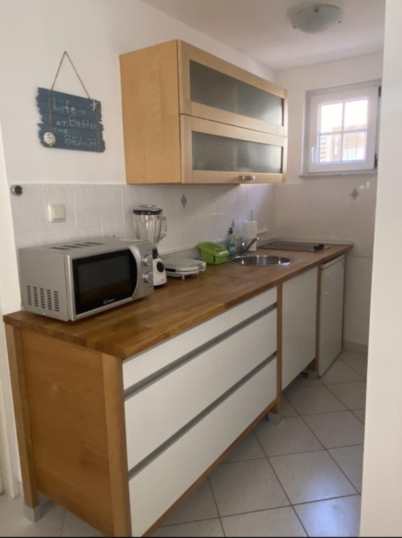 Nabízíme ubytování v nově zrekonstruované garsoniéře se dvěma ložnicemi v přízemí domu o velikosti 37m2. Skládá se ze 2 ložnic, vybavené kuchyně, jídelny, koupelny a velké terasy. Dům má krásně upravený dvůr, gril a oplocené parkoviště pro 1 auto. Ideální pro klidnou a příjemnou dovolenou. Studiový apartmán se nachází ve slepé ulici, která není rušná a je ideální pro děti. Pláž je vzdálená 400 m. Na pláži je kavárna. Studio je vybaveno: krmítko, klimatizace, LED TV, varná konvice, mikrovlnná trouba, toustovač, mixér, sporák, lednička, vysoušeč vlasů, žehlička, sušička prádla, zahradní gril.