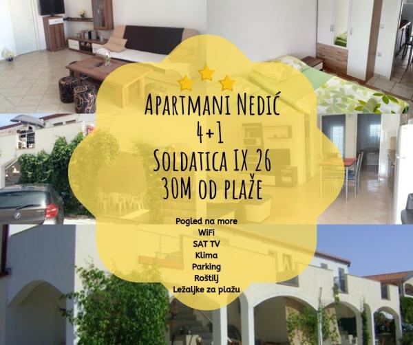 Prostorné a plně vybavené apartmány v klidné východní části ostrova Vir, jen 30 metrů od oblázkové pláže. Každý ze 3 apartmánů má 70 metrů čtverečních a může pojmout až 5 osob. Apartmány mají dvě ložnice, velký obývací pokoj, plně vybavenou kuchyň a terasy s výhledem na moře. Ideální volba pro rodiny s dětmi nebo mladší páry. Ve dvoře je také gril a každý apartmán má vlastní parkovací místo.