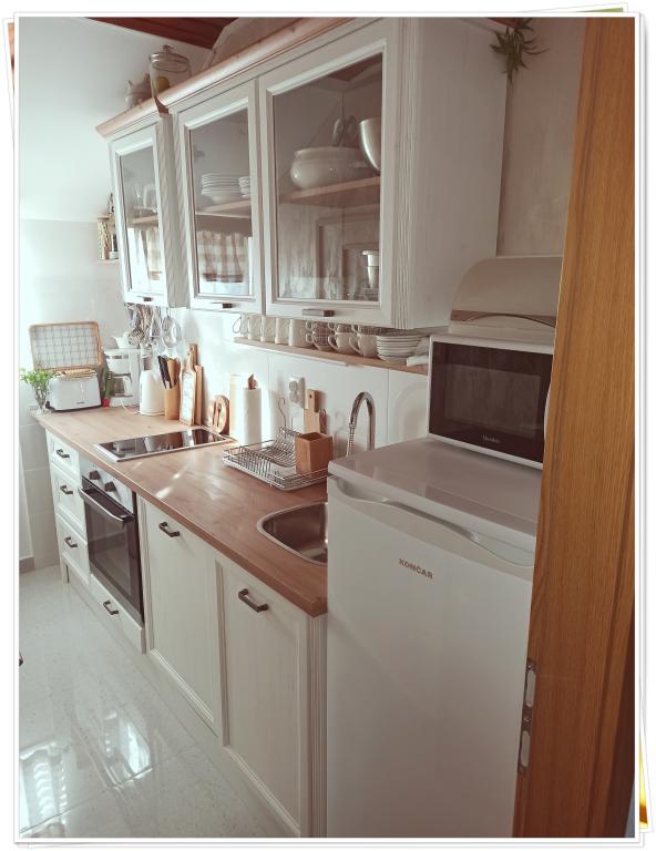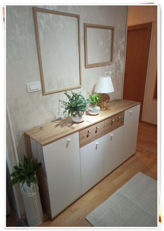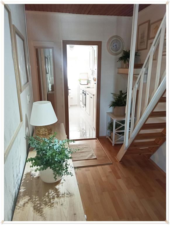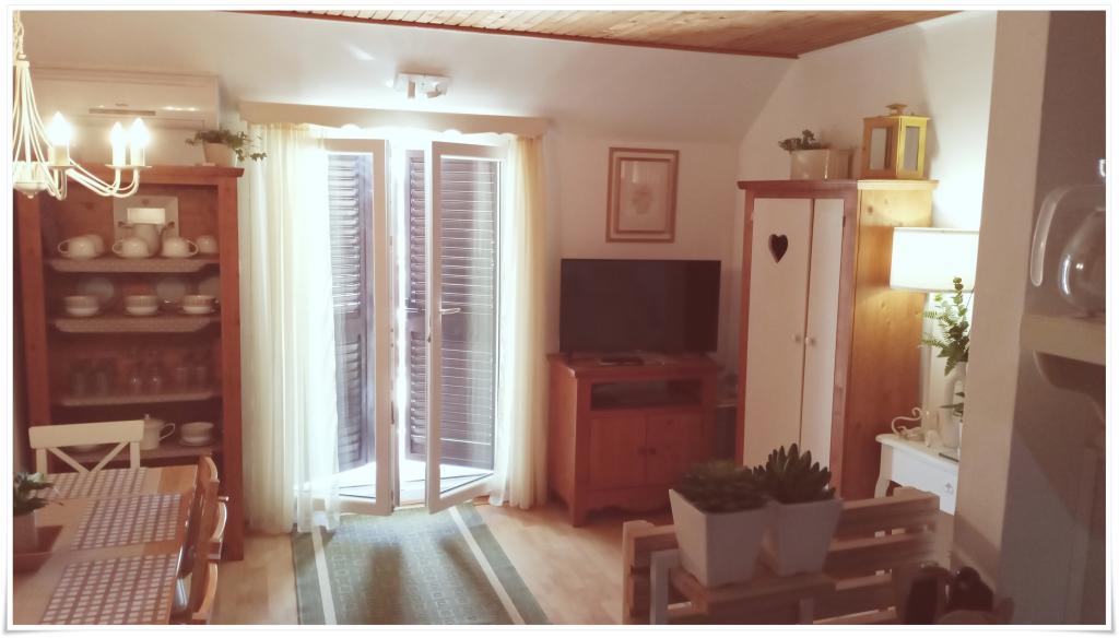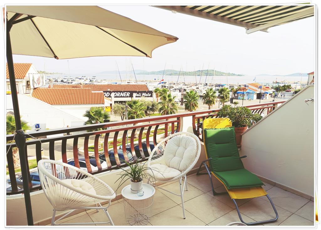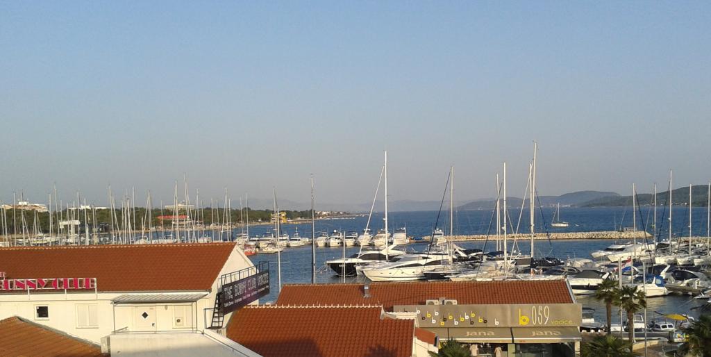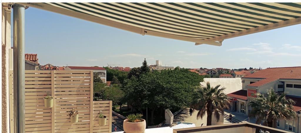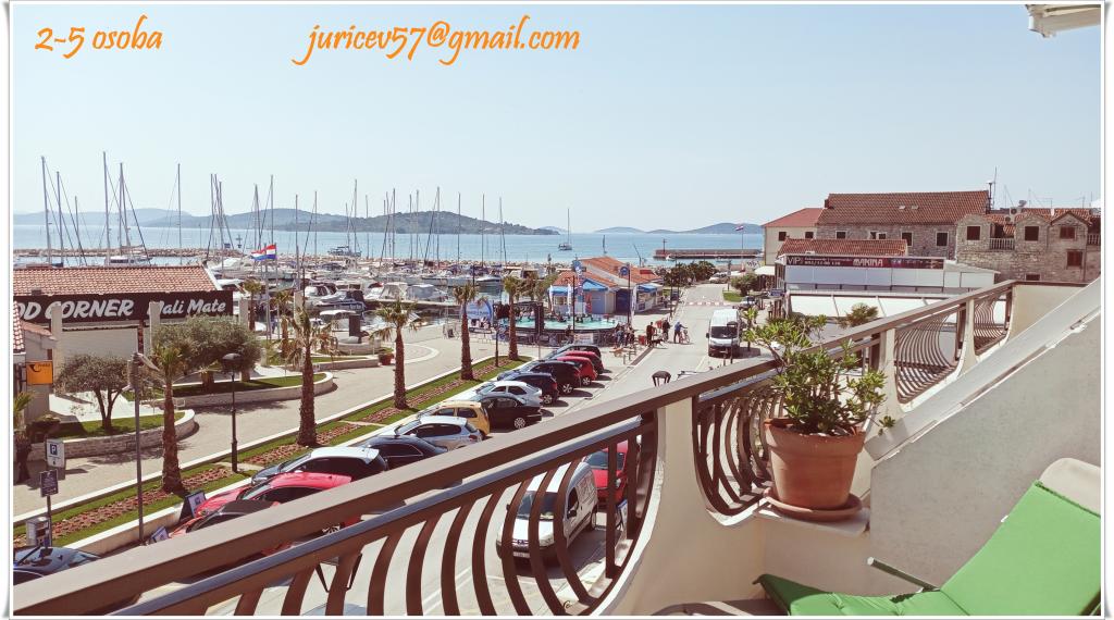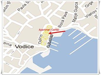 Apartmán se nachází v centru Vodice, má obývací pokoj s rozkládací pohovkou /kanape/, kuchyň, dvě dvoulůžkové ložnice + velká postel + dětská postýlka, dvě koupelny se sprchami, dva ohřívače vody, dvě klimatizace, dva stropní ventilátory, terasu s výhledem na moře, přístav, park. Je plně vybaven pro delší pobyt (internet, pračka, myčka nádobí, kuchyňská linka, ručníky, fén, žehlička). Je vzdálen přibližně 350 m od západní nebo východní pláže.