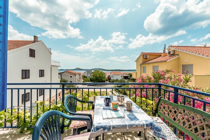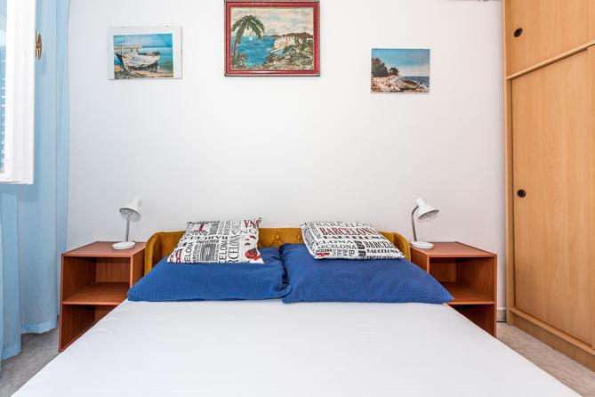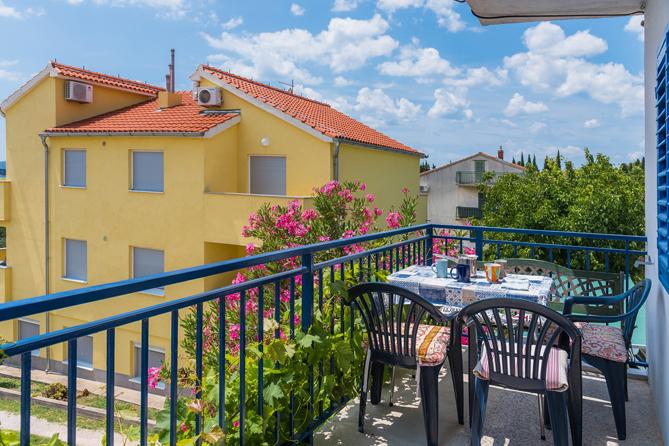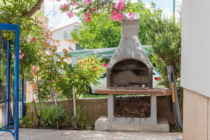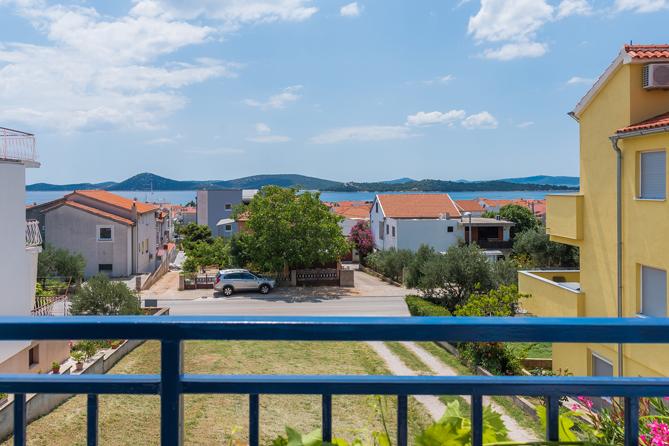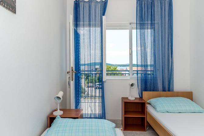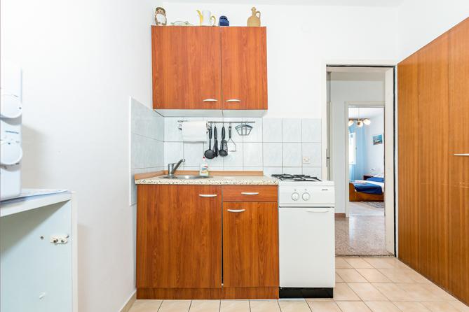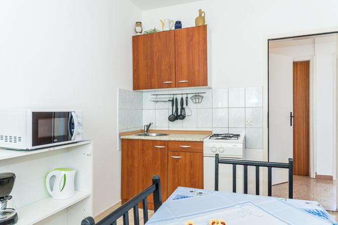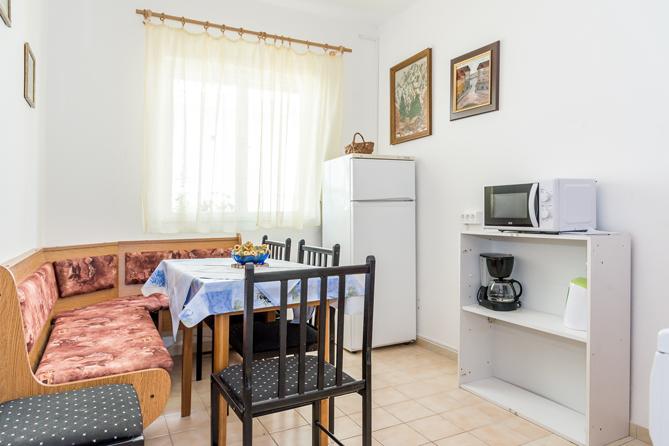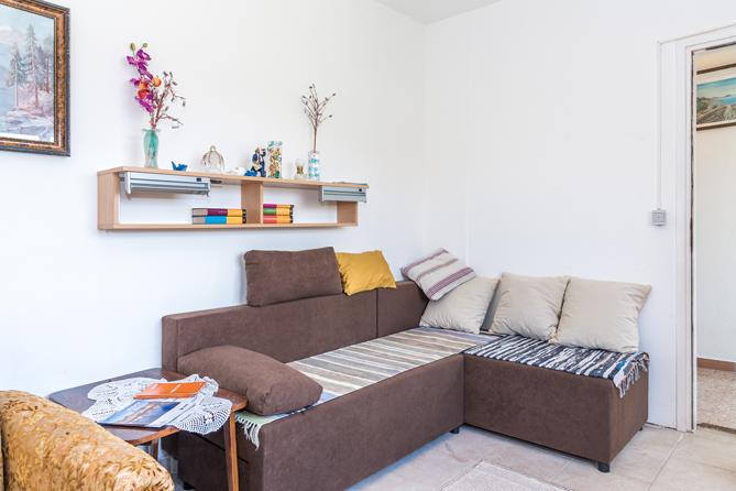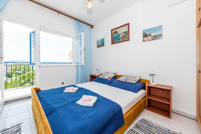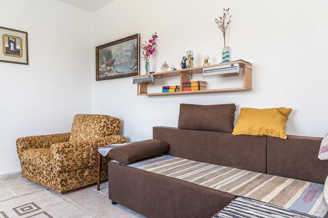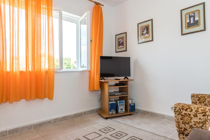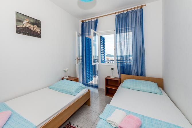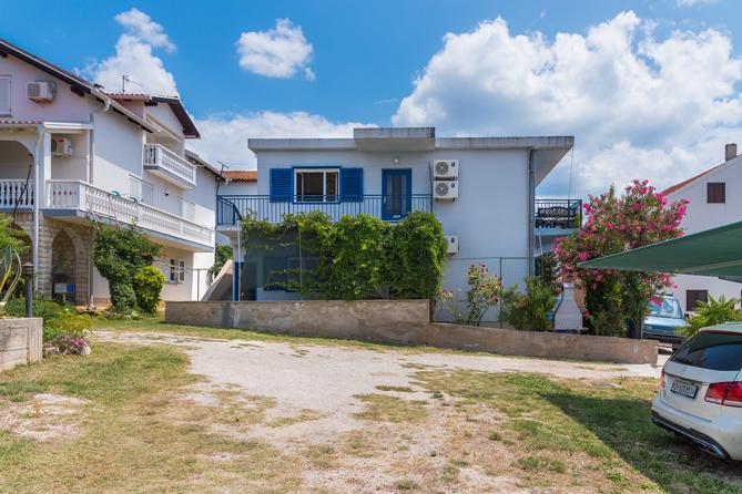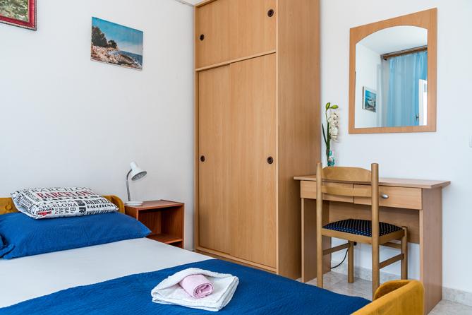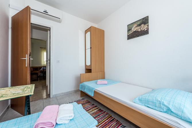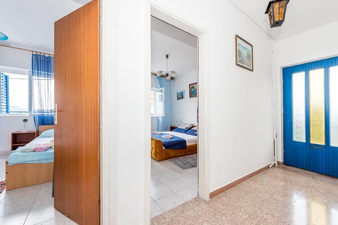 Plně vybavený apartmán sestávající ze dvou samostatných ložnic, jedna s manželskou postelí a druhá se dvěma samostatnými lůžky, oba pokoje mají vlastní klimatizaci. Koupelny s WC, obývací pokoje s TV, kuchyně s novými kombinovanými lednicemi. Terasy s výhledem na moře. Byt se nachází v 1. patře rodinného domu. Parkování je zajištěno.