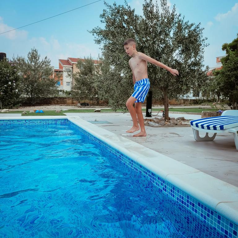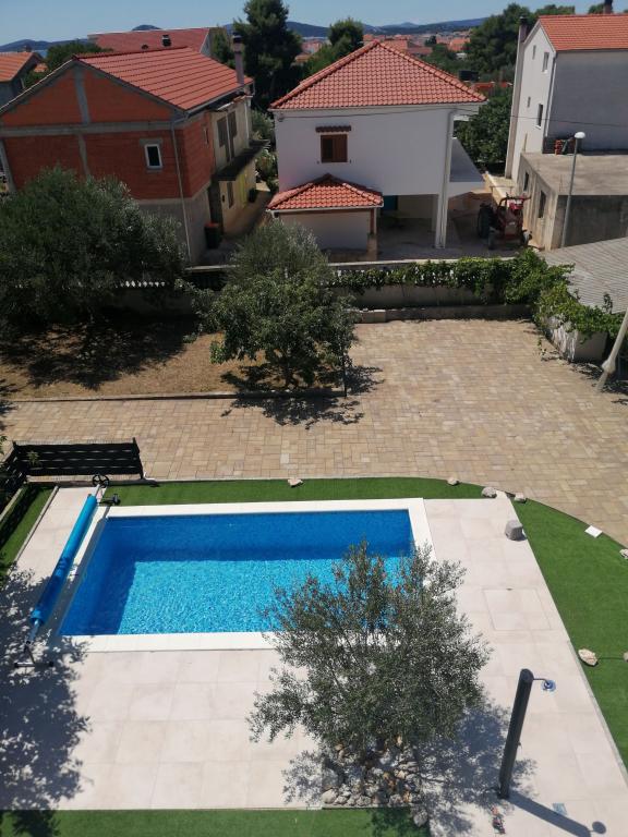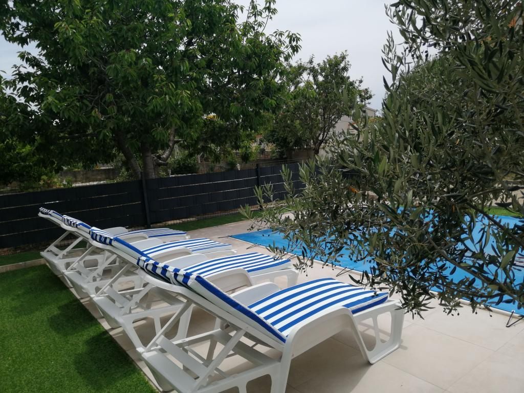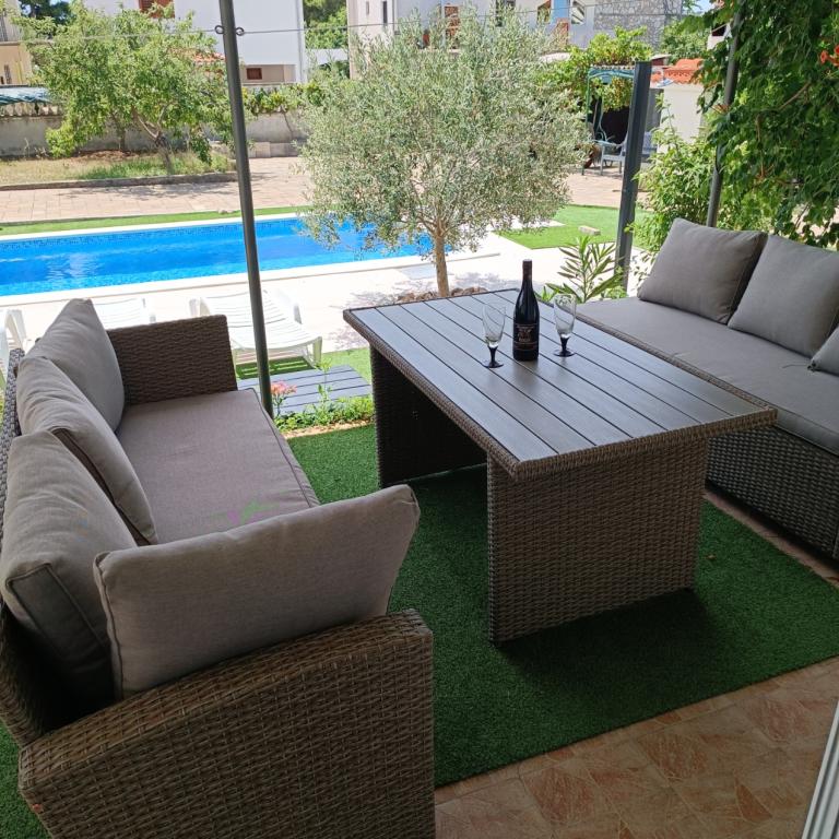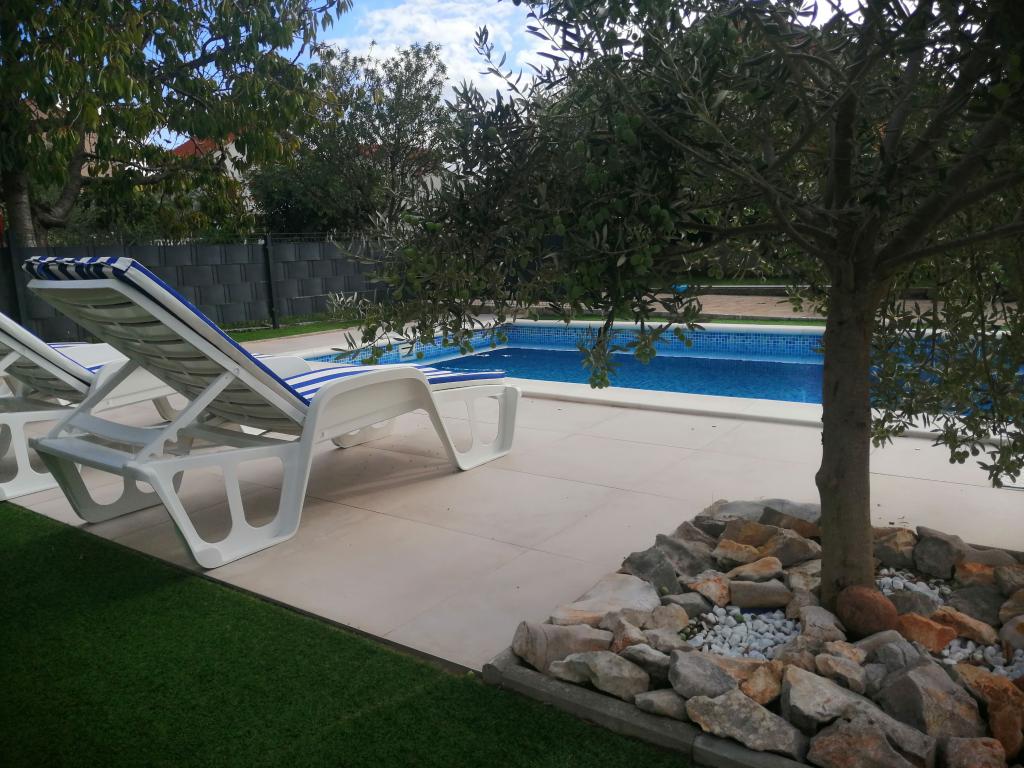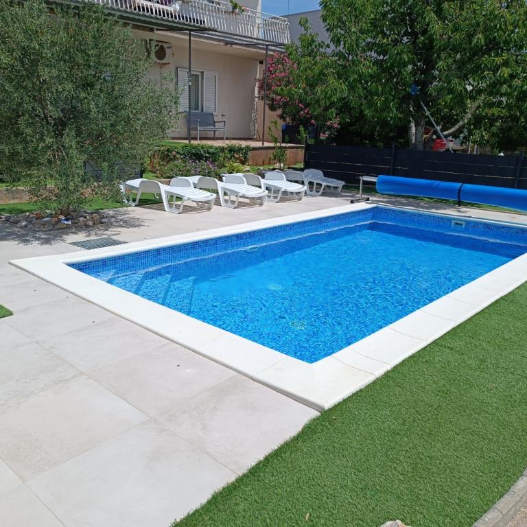 Nově zrekonstruované velké apartmány s venkovním BAZÉNEM JEN PRO VÁS!! JAKO V DOVOLENKOVÉM DOMĚ!! Kompletně NOVĚ ZREKONSTRUOVANÁ kuchyně s novými spotřebiči (lednice, mrazák, trouba, varná deska, mikrovlnná trouba, varná konvice, myčka nádobí, pračka, digestoř). Nádobí a kuchyňské náčiní. Obývací pokoj s rohovou pohovkou, kterou lze v případě potřeby rozložit na prostornou postel. Nová televize se satelitními programy. Ložnice s prostornými manželskými postelemi. Ložní prádlo. Všechny pokoje jsou klimatizované. Dvě koupelny s WC a sprchovými kouty, nově zrekonstruované. Pračka, žehlicí potřeby, fén. Vysavač a čisticí prostředky, toaletní papír, mýdlo, ručníky. K dispozici je také 30 m2 terasa se zahradním nábytkem, stejně jako gril, lehátka u bazénu. Obrovská zahrada o rozloze 1300 m2 s množstvím středomořských stromů. Parkování ve dvoře ZDARMA!!. Letiště Zadar a Split jsou vzdálena asi 60 km. V blízkosti národního parku Krka a Kornati.