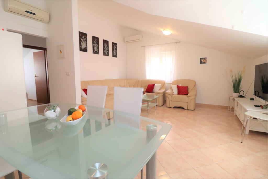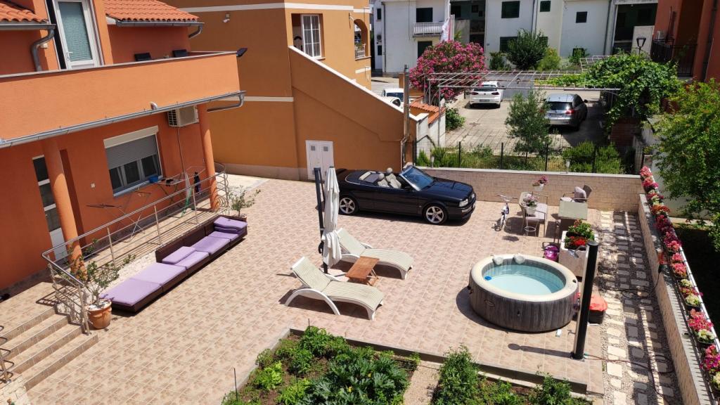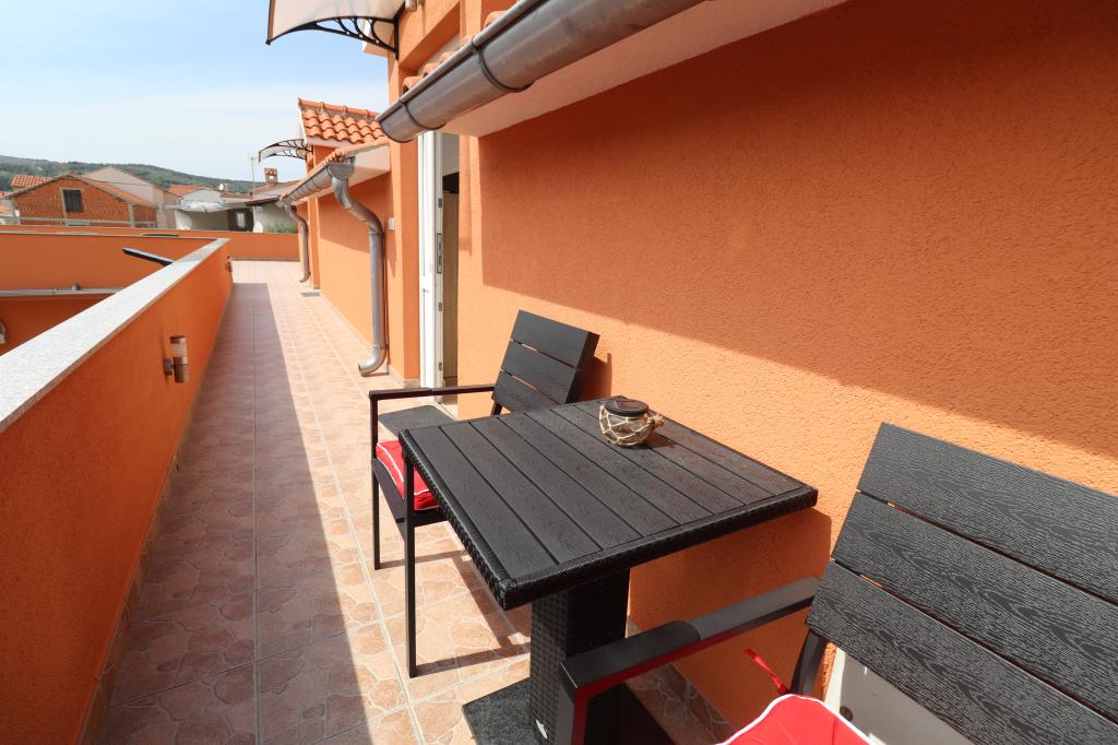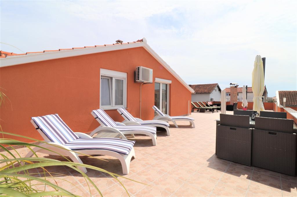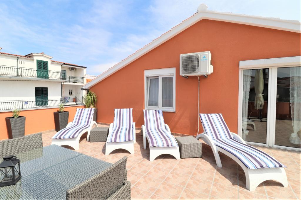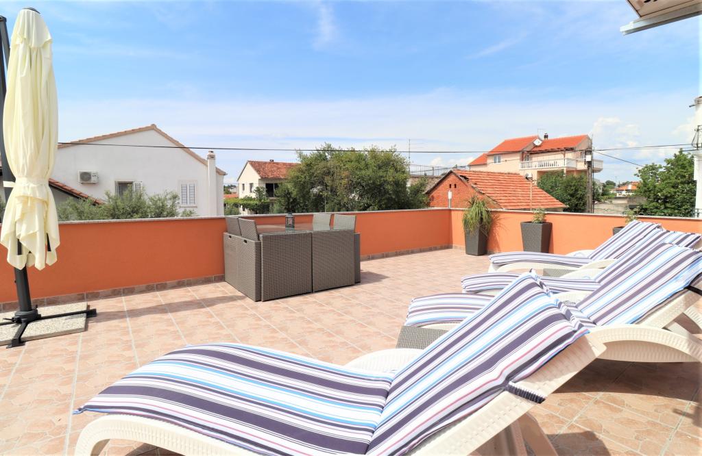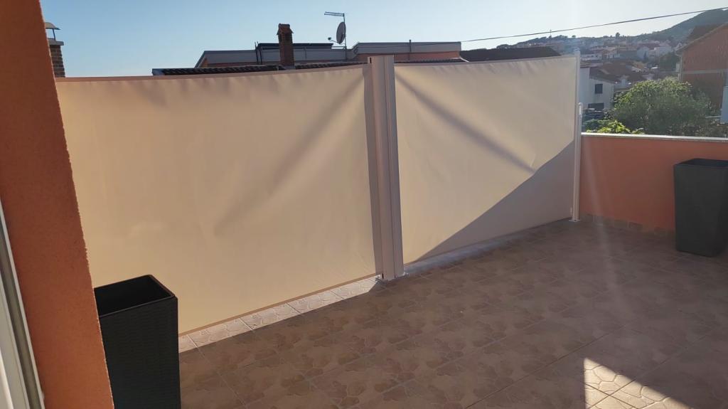 Plně vybavené apartmány v klidné části Vodice s velkou terasou a dvorem. Apartmány se nacházejí v posledním patře rodinného domu. Terasu lze v případě potřeby oddělit boční markýzou. Na dvoře je jacuzzi a gril. Domácí mazlíčci jsou vítáni. K dispozici je parkovací místo pro dvě auta. Pláže jsou vzdálené asi 15 minut chůze. V ceně je zahrnuta pobytová taxa. Možnost dopravy z letišť Zadar a Split.