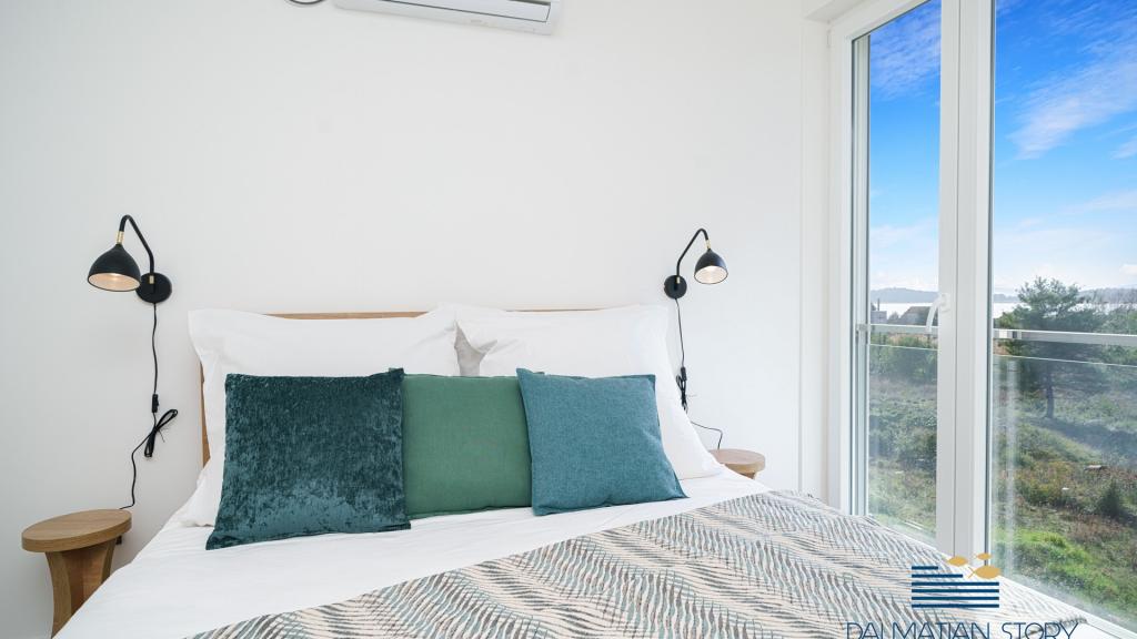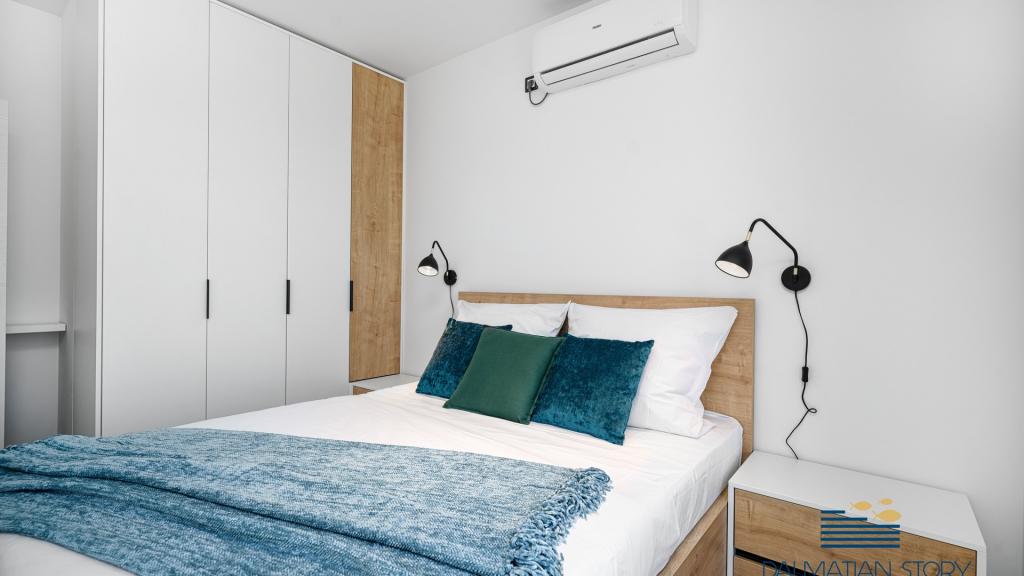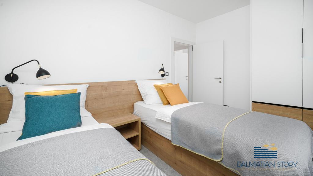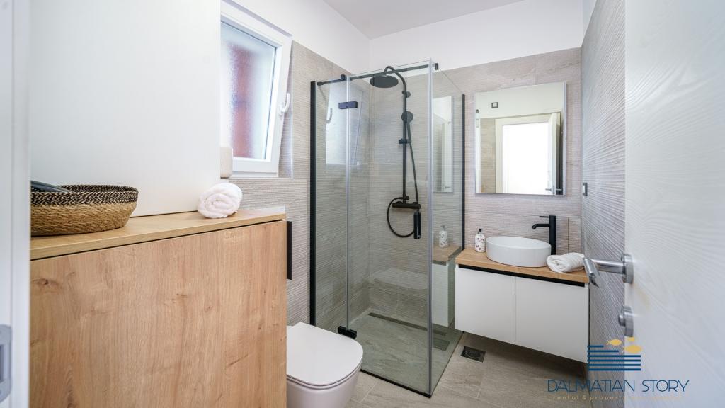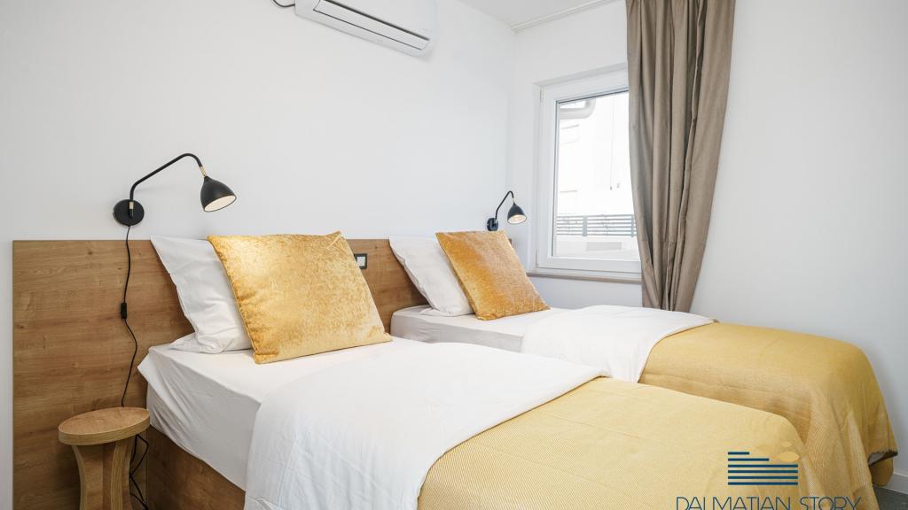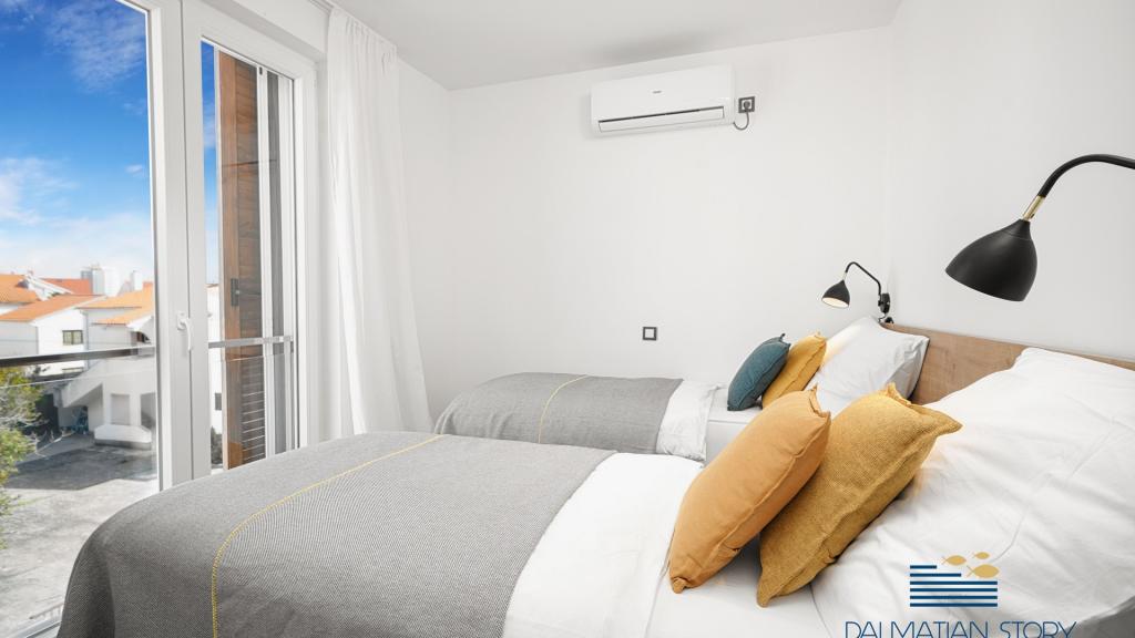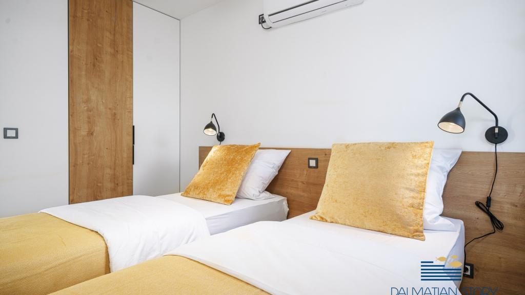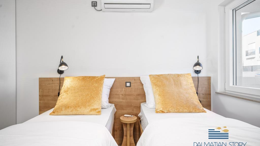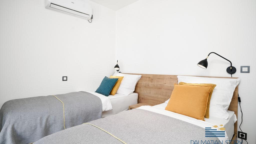 Nově zrekonstruované a vybavené apartmány Maris jen 150m od pláže v klidné části Vodice. V přízemí se nachází Apartmán Maris 1 se 2 ložnicemi o celkové ploše 65 m2, byt se skládá z kuchyně, jídelny a obývacího pokoje jako jeden celek se vstupem na malou oplocenou zahradu a terasu s posezením, 1 ložnice s manželskou postelí a 1 ložnice pokoj se dvěma samostatnými lůžky a koupelnou, samostatný vchod a parkovací místo ve dvoře. Ideální pobyt pro 4 osoby. Ve 2. patře se nachází apartmán Maris 2 se 3 ložnicemi a 2 koupelnami 110m2, apartmán se skládá z plně vybavené a vybavené kuchyně, jídelny a obývacího pokoje jako jeden celek se vstupem na krytou terasu s krásným výhledem na moře a přilehlé ostrovy.prostor pro posezení a užívání si slunce, 2 koupelny a 3 ložnice, z nichž dvě jsou vybaveny manželskou postelí a jeden pokoj se dvěma samostatnými lůžky. Byt je klimatizovaný, má internetové připojení, parkování.