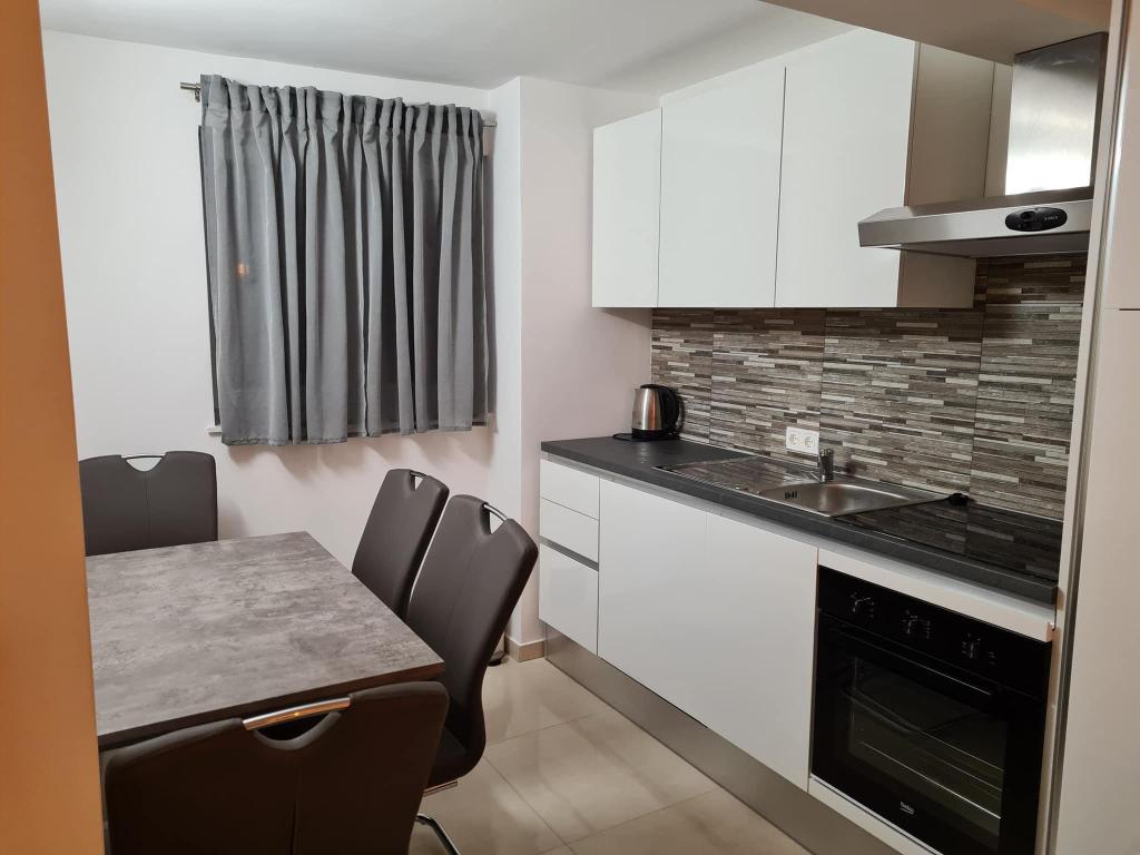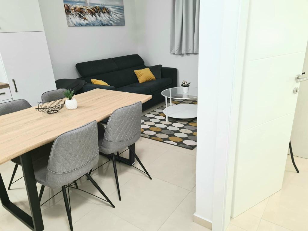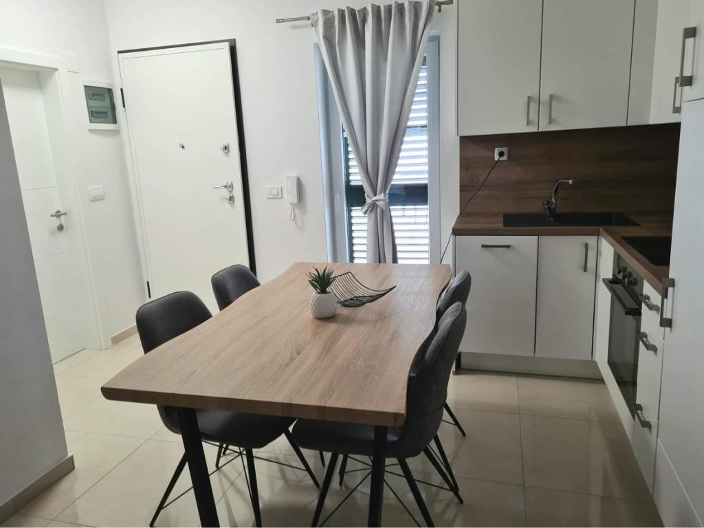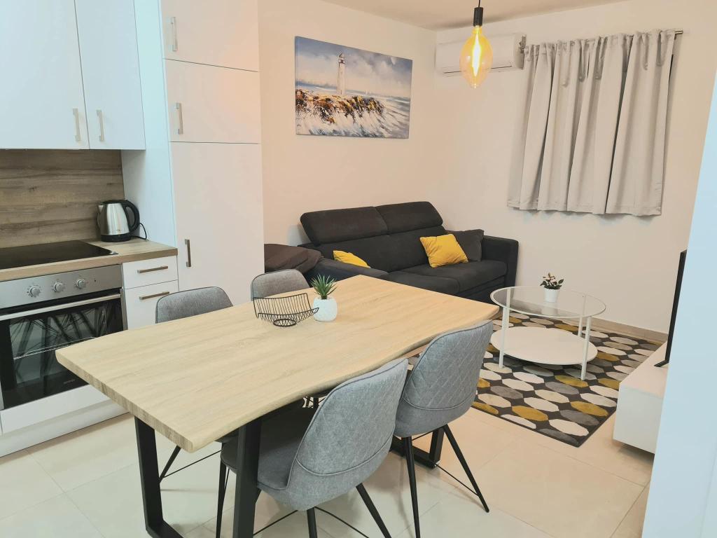 Apartmány se nacházejí v přízemí a v prvním patře nově zrekonstruovaného rodinného domu. Apartmány se skládají z ložnice s manželskou postelí, obývacího pokoje s rozkládací pohovkou, kuchyně a koupelny. Byt, který se nachází v prvním patře, má balkon. Nacházejí se minutu chůze od první kavárny, pekárny, obchodu, dvě minuty chůze od nábřeží a nejbližší pláž je vzdálena 7-8 minut chůze.