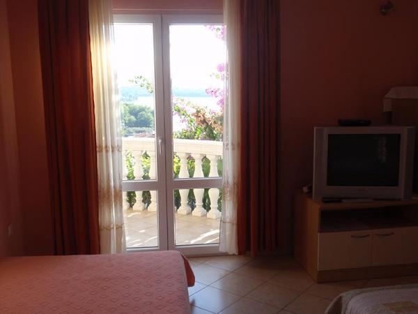 V bytě je jedna ložnice, koupelna, obývací pokoj, kuchyň a balkon s výhledem na moře.
