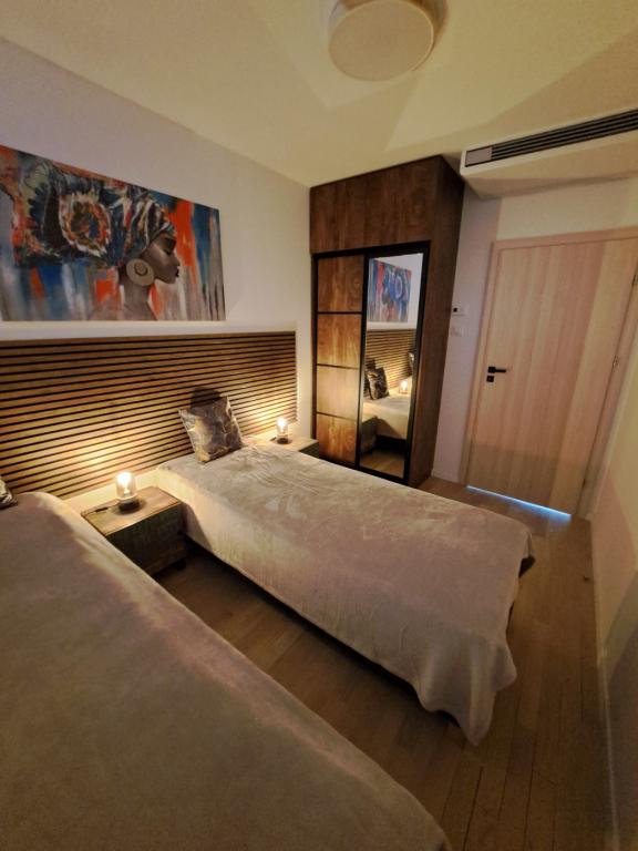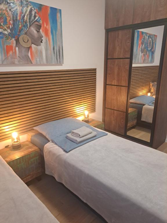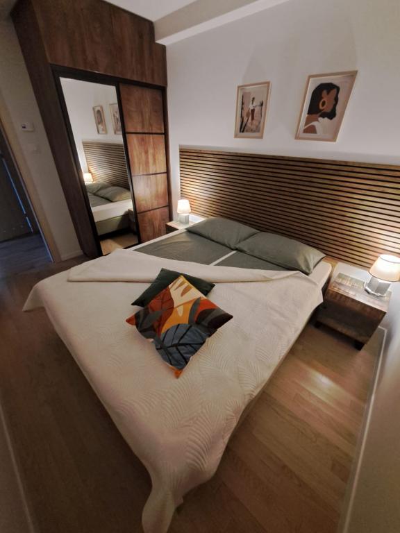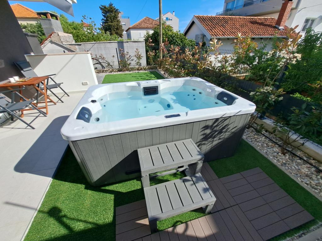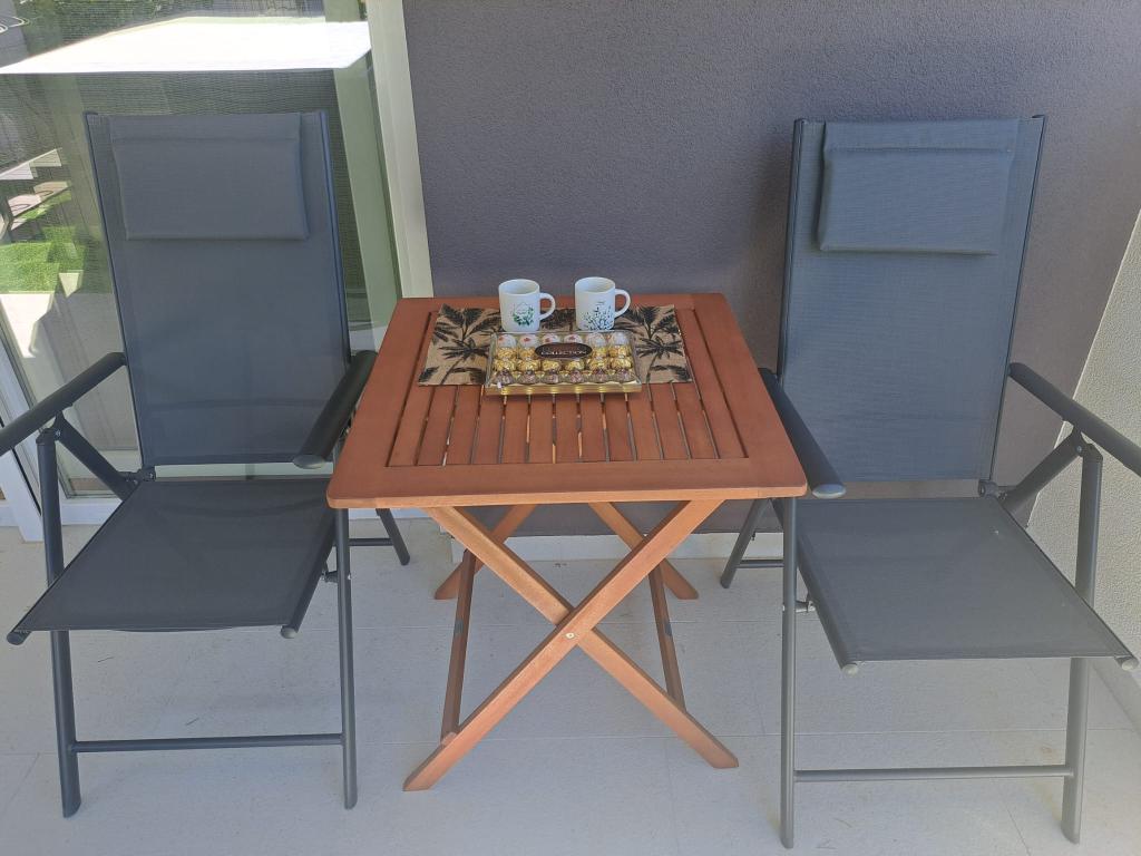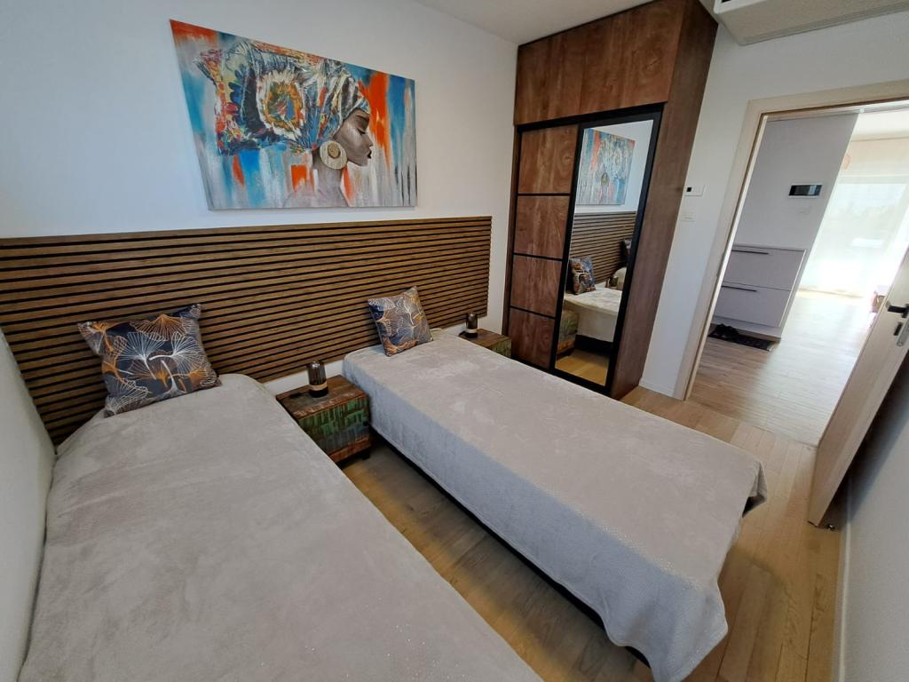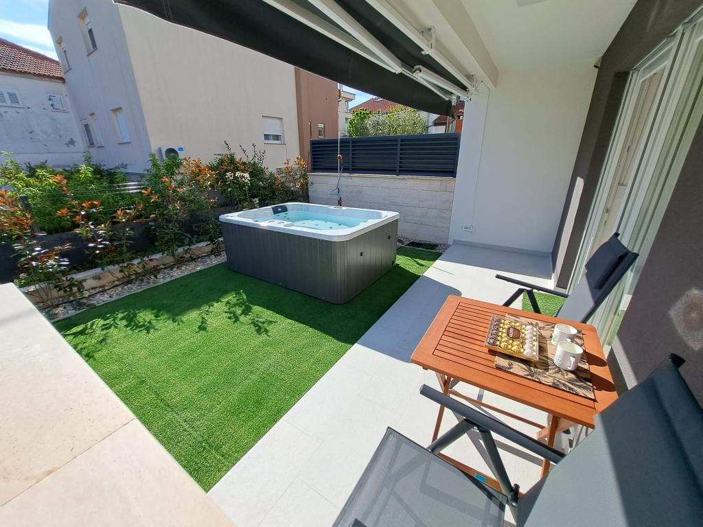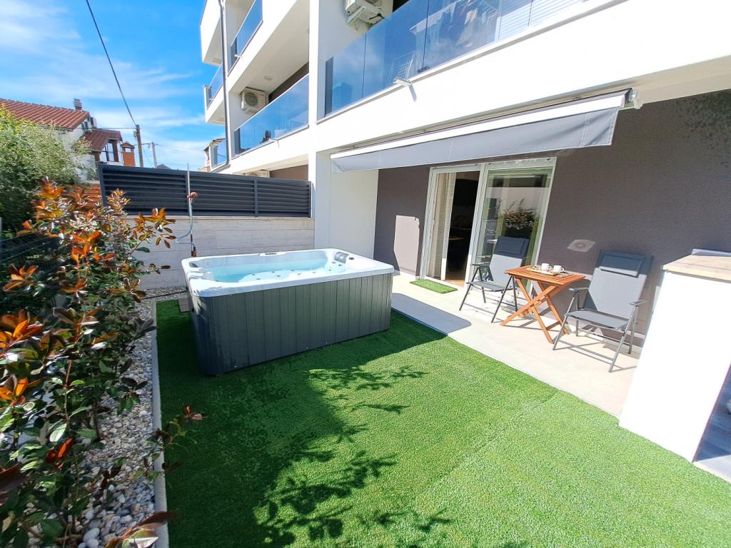 Byt se nachází v přízemí budovy v klidné zadarské čtvrti Stanovi, kterou nenavštěvují davy turistů. V bezprostřední blízkosti (v pěší vzdálenosti) jsou obchody, restaurace, kavárny a sportovní a rekreační centrum Višnjik - vše, co potřebujete pro svůj pobyt, bez nutnosti použití auta. Apartmán má samostatný vchod z vlastní zahrady (cca 55m2), kde mají hosté přístup do privátní vířivky. Zahrada je obklopena zelení. Byt se skládá z obývacího pokoje s kuchyňským a jídelním koutem, 2 ložnic (každá s manželskou postelí, kterou lze rozdělit na dvě samostatná lůžka), koupelny se sprchovým koutem a zastřešené lodžie (cca 7m2). Část zahrady s vířivkou lze zastínit automatickou roletou. Máme 2 soukromá parkovací místa před budovou. (bez příplatku) Nabízíme také vlastní nabíjecí stanici pro elektromobily. (příplatkový poplatek)