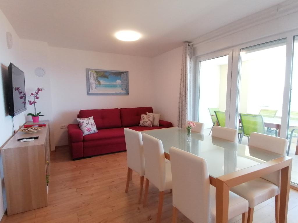Byt A4 + 2 byl opravdu krásný s moderním nábytkem a velkou terasou s krásným výhledem na moře. Byt je ve skvělé lokalitě, pár kroků od pláže. Tři hodiny denně, dobře využívaný bazén, vířivka a sauna, dětské hřiště a gril. Vybavení a čistota bytu na vysoké úrovni. Velmi milý hostitel.