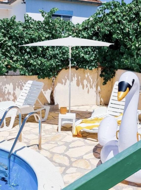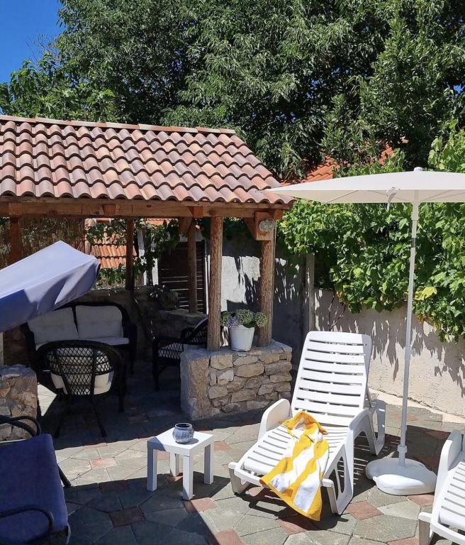 Tento krásný prázdninový dům se nachází na klidném místě, ideální pro útěk z ruchu města a pro odpočinkovou dovolenou. Dům se skládá z apartmánu, který je ideální pro hosty nebo větší rodiny, které chtějí soukromí. Hlavní obytná část domu má prostorný obývací pokoj s pohodlnými pohovkami a televizí, ideální pro relaxaci a socializaci. Má otevřený plán s jídelnou, která vede do plně vybavené kuchyně s moderními spotřebiči. Velké prosklené dveře poskytují dostatek přirozeného světla a vstup na prostornou terasu s krásným výhledem na okolní přírodní krásy. Venkovní prostor domu nabízí mnoho možností pro vyžití venku. Bazén je ideální pro osvěžení v horkých letních dnech a lehátka kolem bazénu lákají k relaxaci a slunci. Vedle bazénu se nachází venkovní kuchyně s grilem, která umožňuje připravovat chutné pokrmy venku. V blízkosti prázdninového domu jsou krásné pláže, restaurace, obchody a mnoho dalších atrakcí.