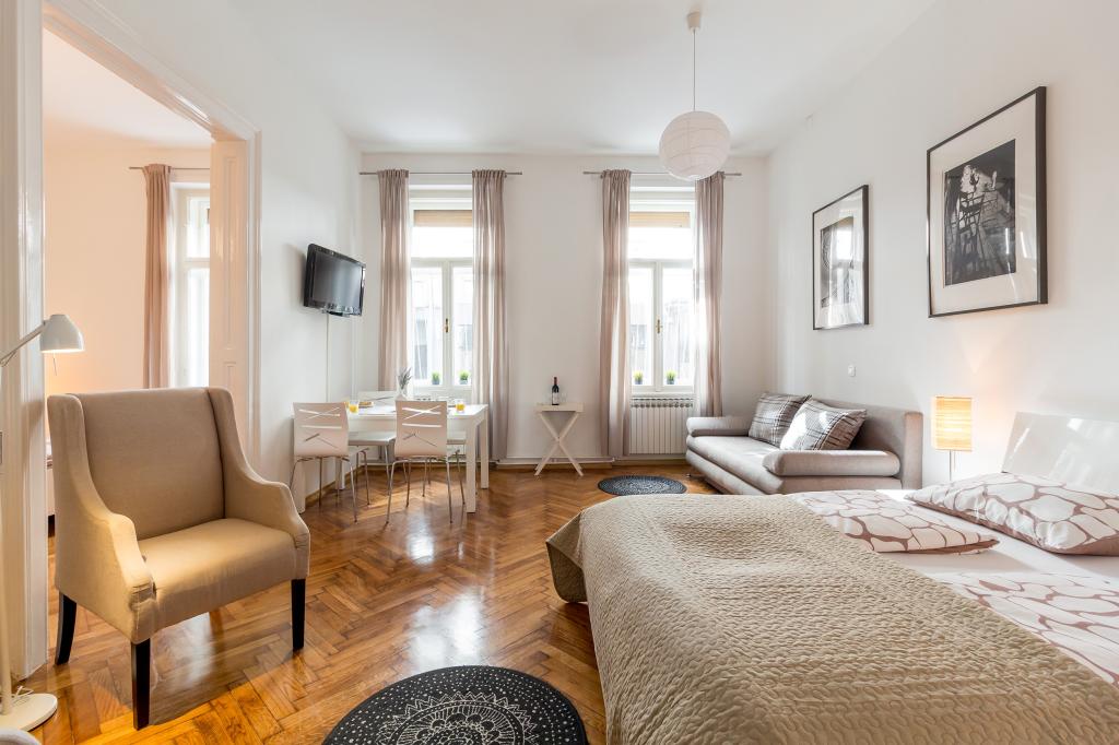 Tento apartmán má dvě postele, jednu samostatnou postel (90x200 cm) a manželskou postel Quinn (140x200 cm), malou kuchyň (šířka 120 cm) a vlastní koupelnu s dešťovou sprchou. před bytem je společná chodba, kterou sdílíte s dalšími 3 byty, dále je zde pračka a žehlička, které můžete volně používat. Svá zavazadla si také můžete nechat na společné chodbě před check-inem nebo po check-outu, pokud to potřebujete.
