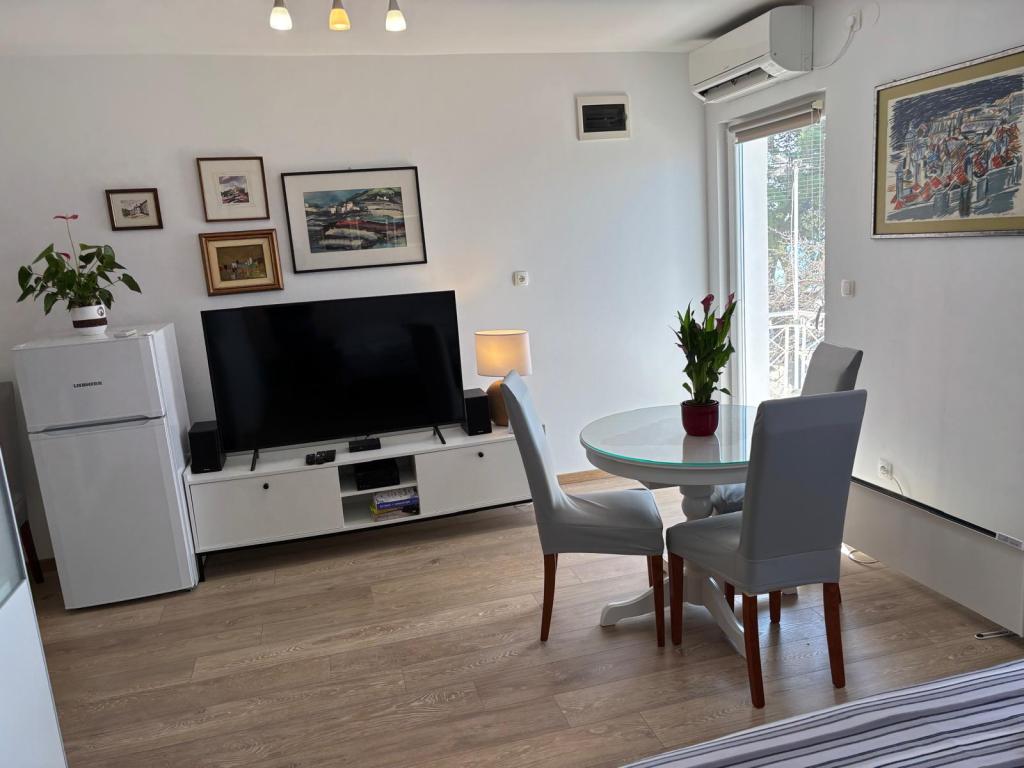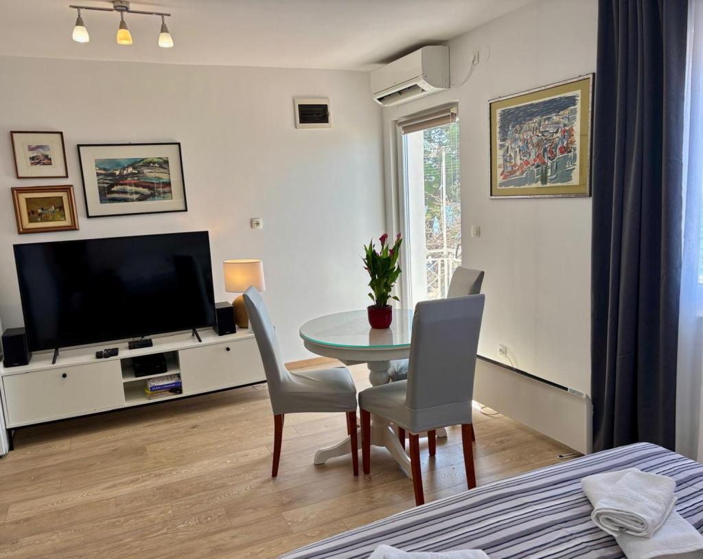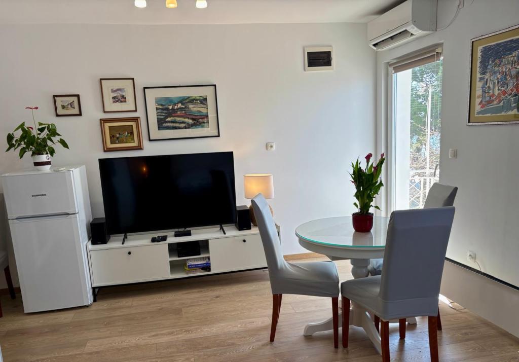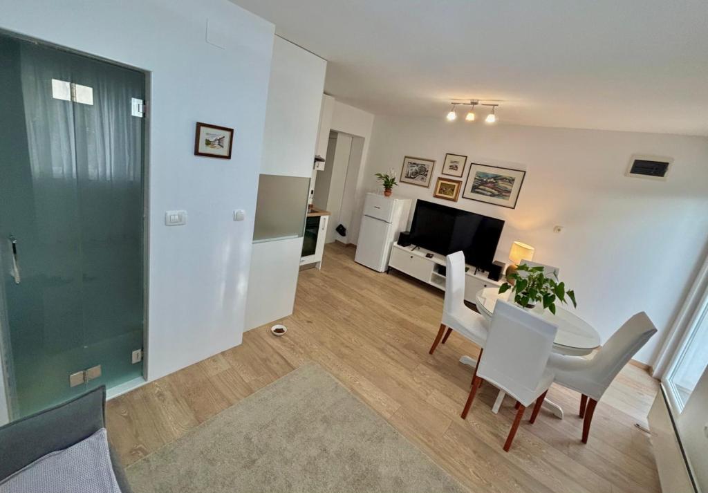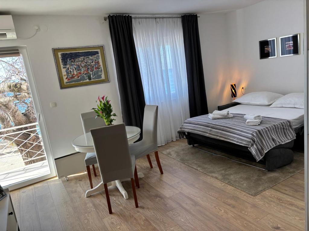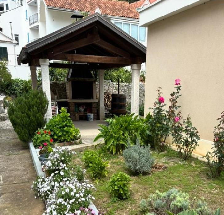 Studiový apartmán je plně a moderně vybavený v prvním patře rodinného domu, který je 30 m od moře a krásné oblázkové pláže s pozvolným vstupem do moře. Před domem je parkování pro auto a na dvoře je altán s grilem a stoly pro posezení ve stínu. V blízkosti se nacházejí obchody, restaurace, cukrárna a u vjezdu do města se nachází nákupní centrum Plodine.