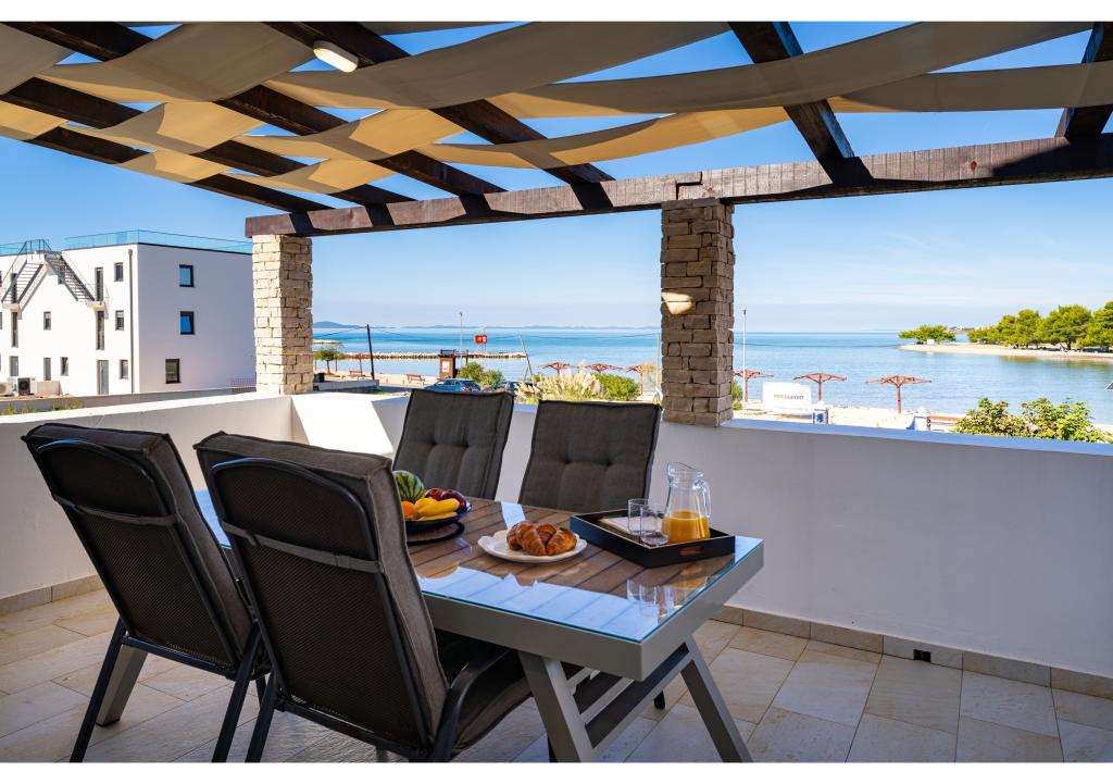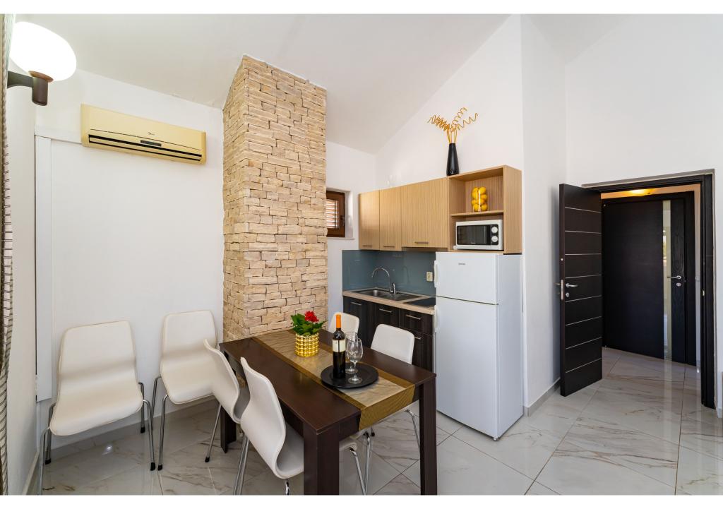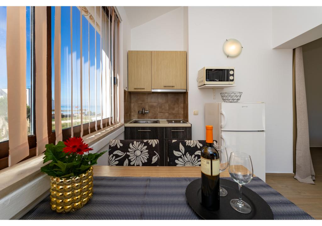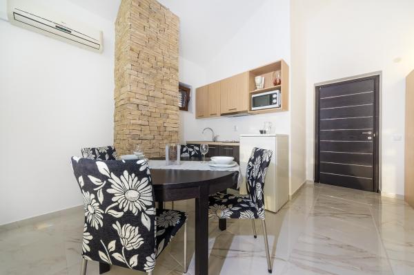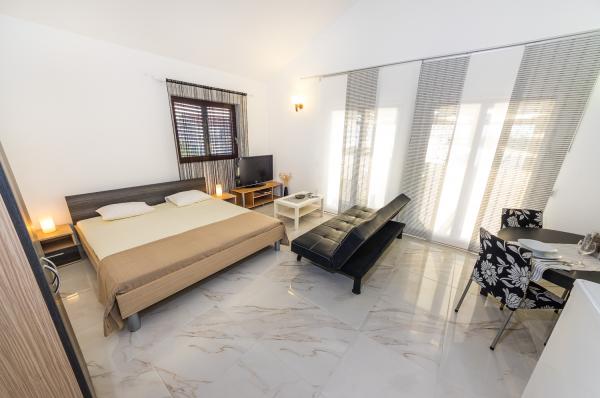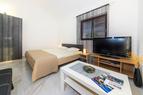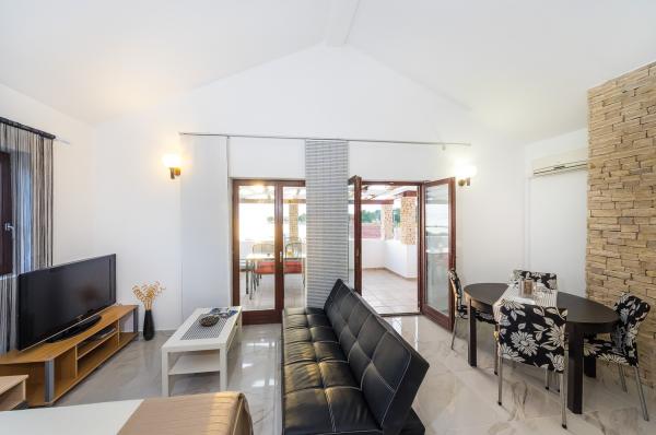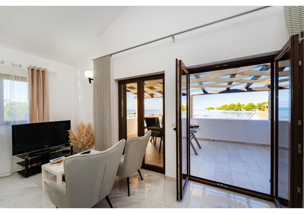 Apartmány první řada k moři. Terasa s výhledem na moře. Zátoka je písčitá a mělká. Apartmány se nacházejí v blízkosti turistického centra Zaton a jsou vybaveny klimatizací, internetem, satelitní TV, parkovištěm, grilem atd.