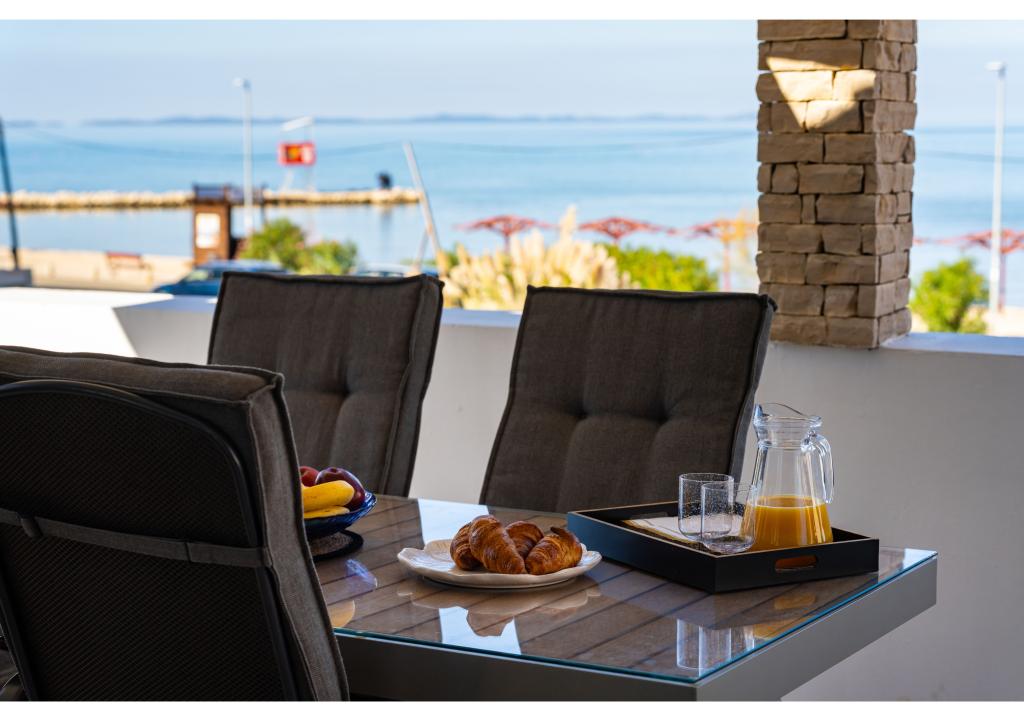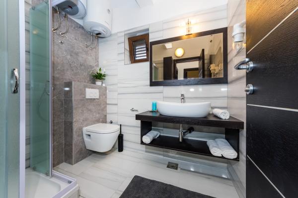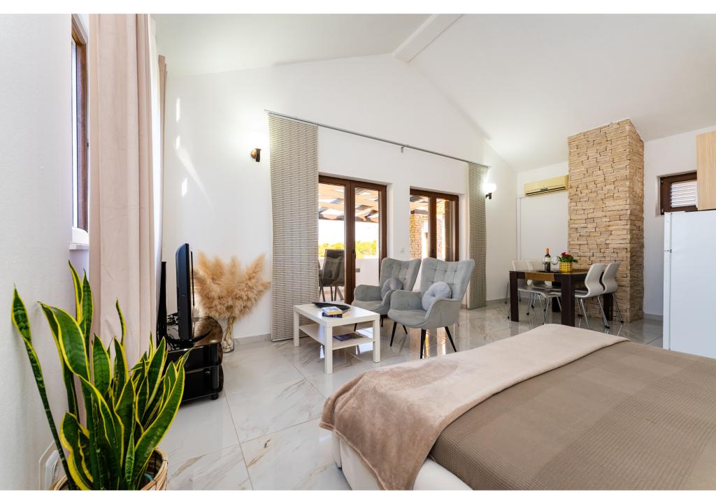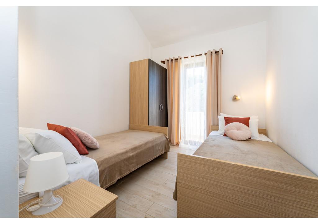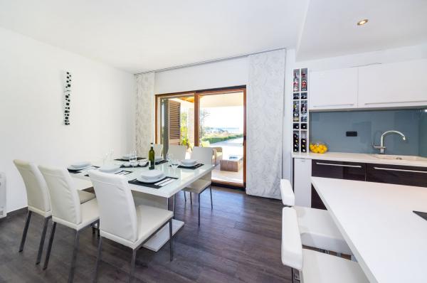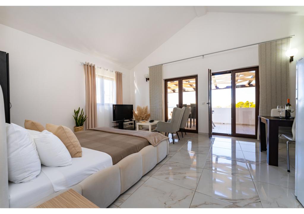 Apartmány první řada k moři. Terasa s výhledem na moře. Zátoka je písčitá a mělká. Apartmány se nacházejí v blízkosti turistického centra Zaton a jsou vybaveny klimatizací, internetem, satelitní TV, parkovištěm, grilem atd.